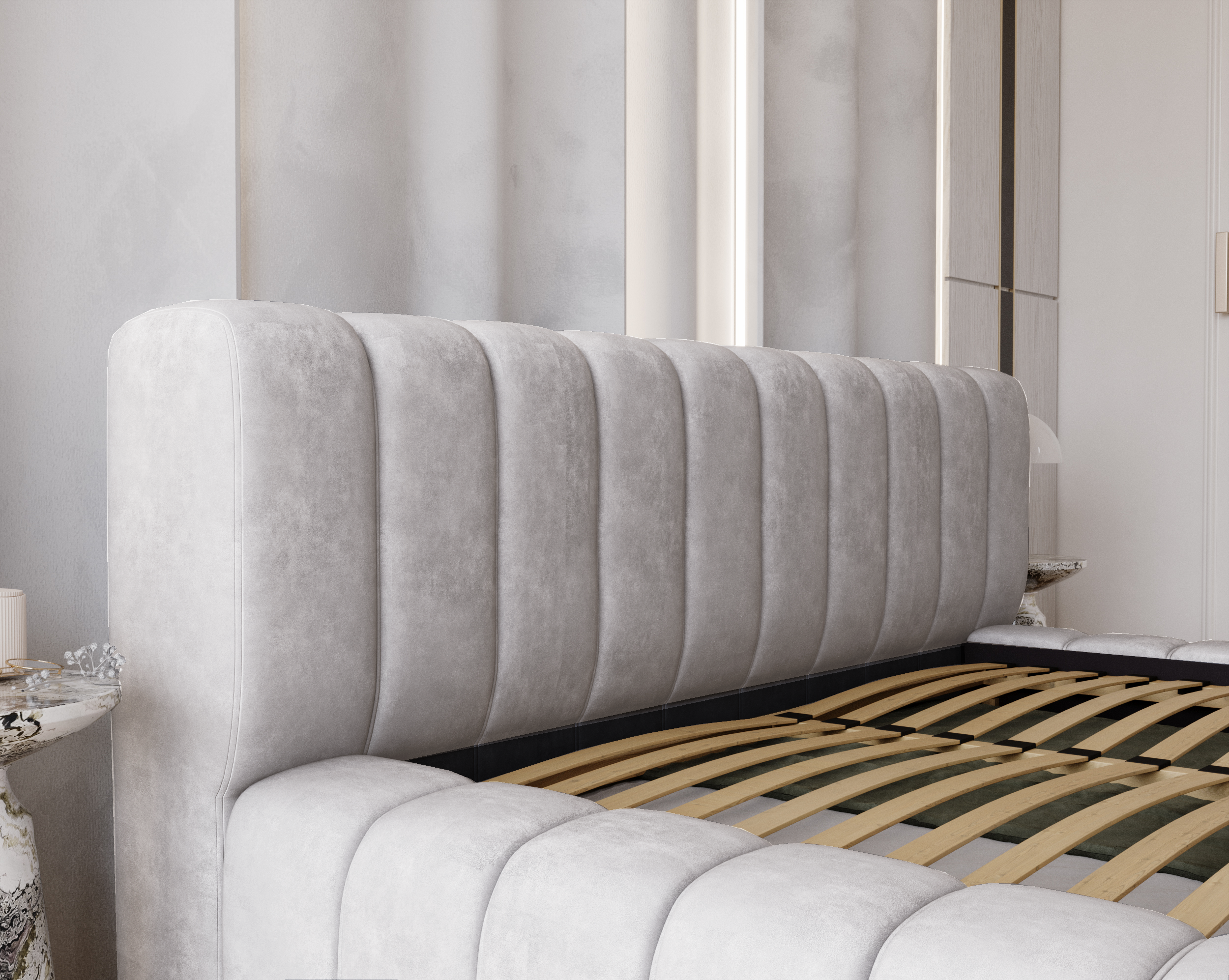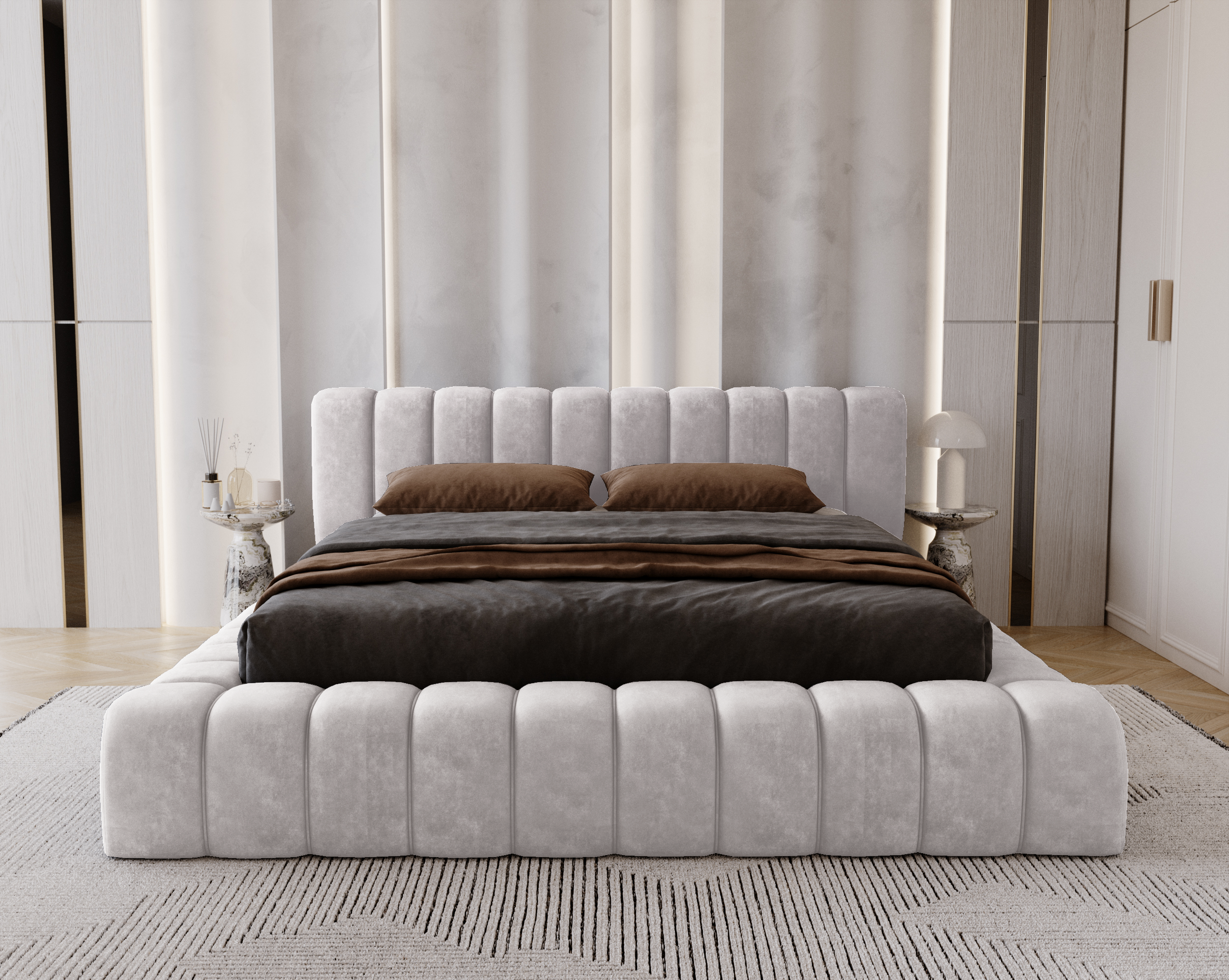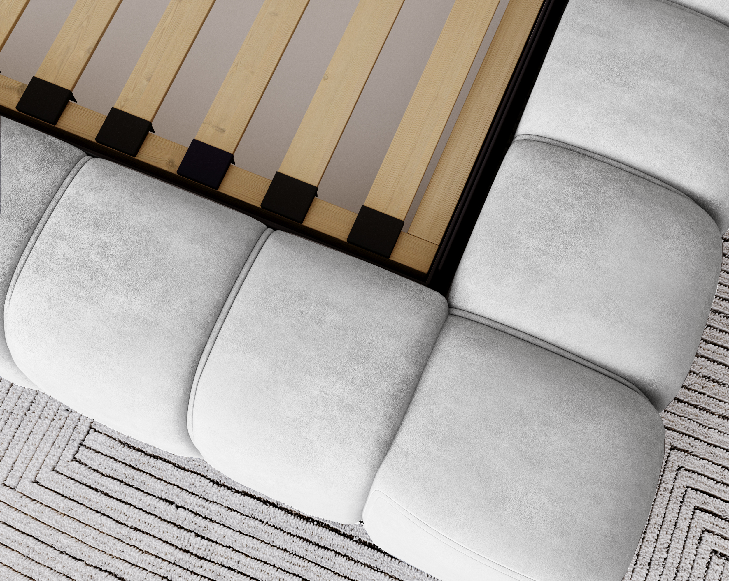 Łóżko tapicerowane jest materiałem Whisper 16, który wyróżnia się niezwykłą trwałością i komfortem. Tkanina posiada aż 100 000 cykli w teście Martindale’a, co gwarantuje odporność na ścieranie i zachowanie doskonałego wyglądu przez długie lata użytkowania. Jest przyjemna i miękka w dotyku, a dzięki swojej objętości dodaje bryle mebla jeszcze bardziej luksusowego charakteru. To materiał stworzony z myślą o meblach wypoczynkowych, zapewniający komfort oraz elegancki wygląd na lata.