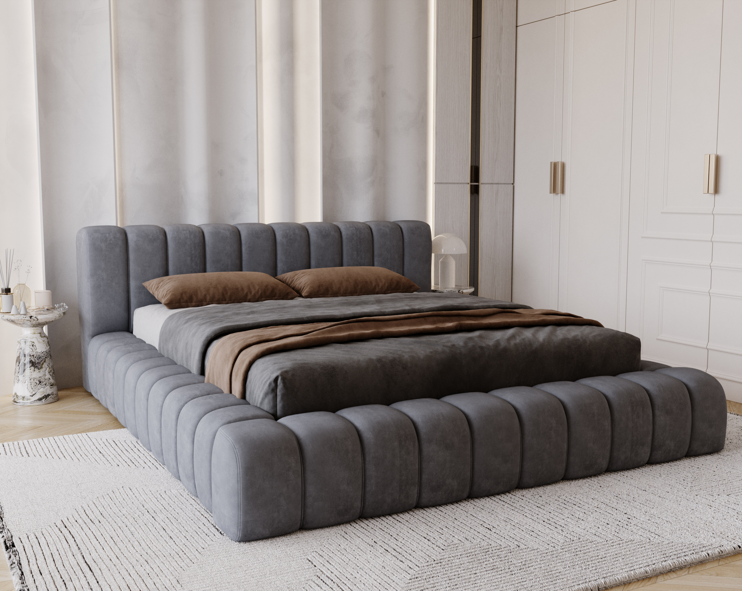 Łóżko tapicerowane jest materiałem Whisper 17, który wyróżnia się niezwykłą trwałością i komfortem. Tkanina posiada aż 100 000 cykli w teście Martindale’a, co gwarantuje odporność na ścieranie i zachowanie doskonałego wyglądu przez długie lata użytkowania. Jest przyjemna i miękka w dotyku, a dzięki swojej objętości dodaje bryle mebla jeszcze bardziej luksusowego charakteru. To materiał stworzony z myślą o meblach wypoczynkowych, zapewniający komfort oraz elegancki wygląd na lata.