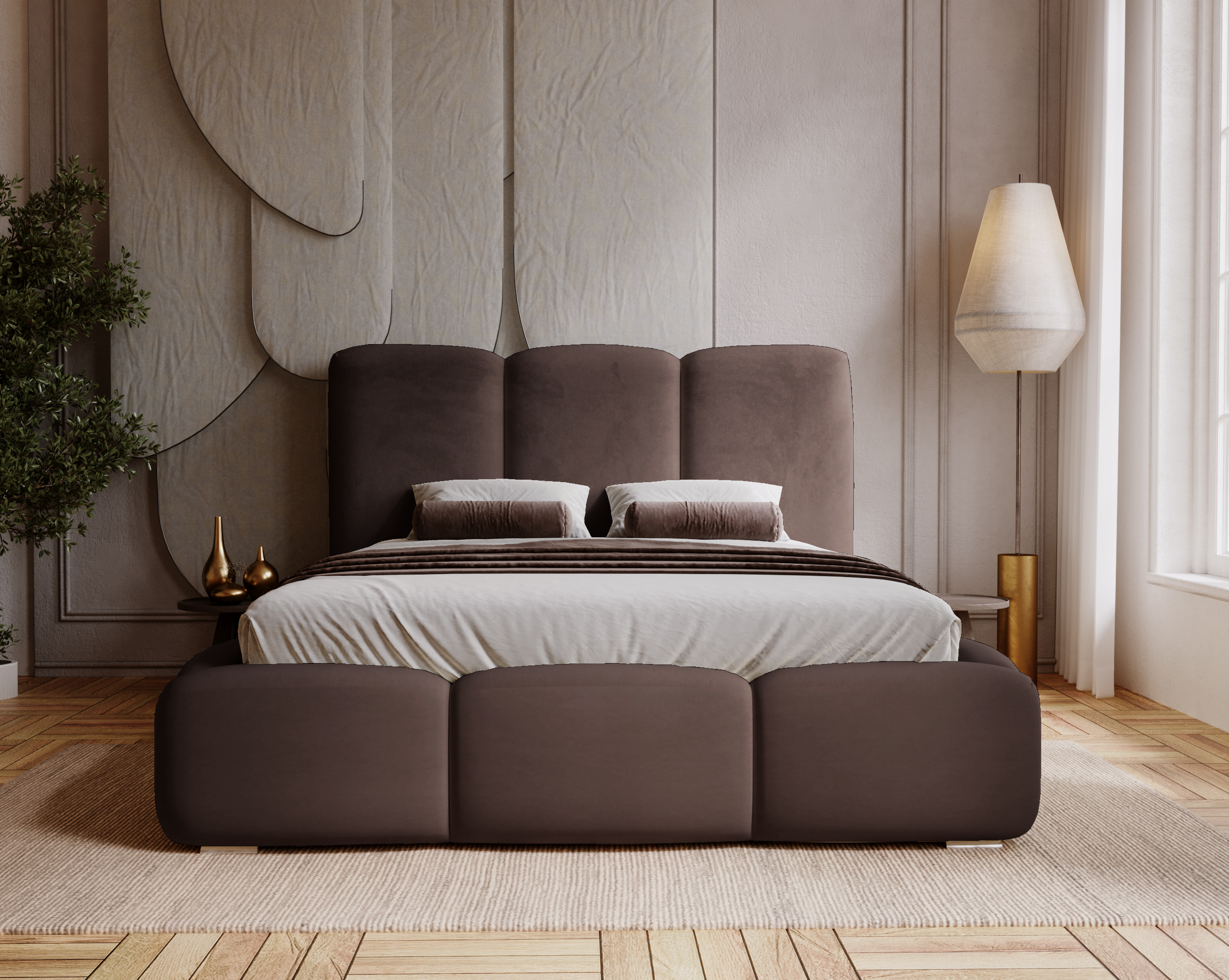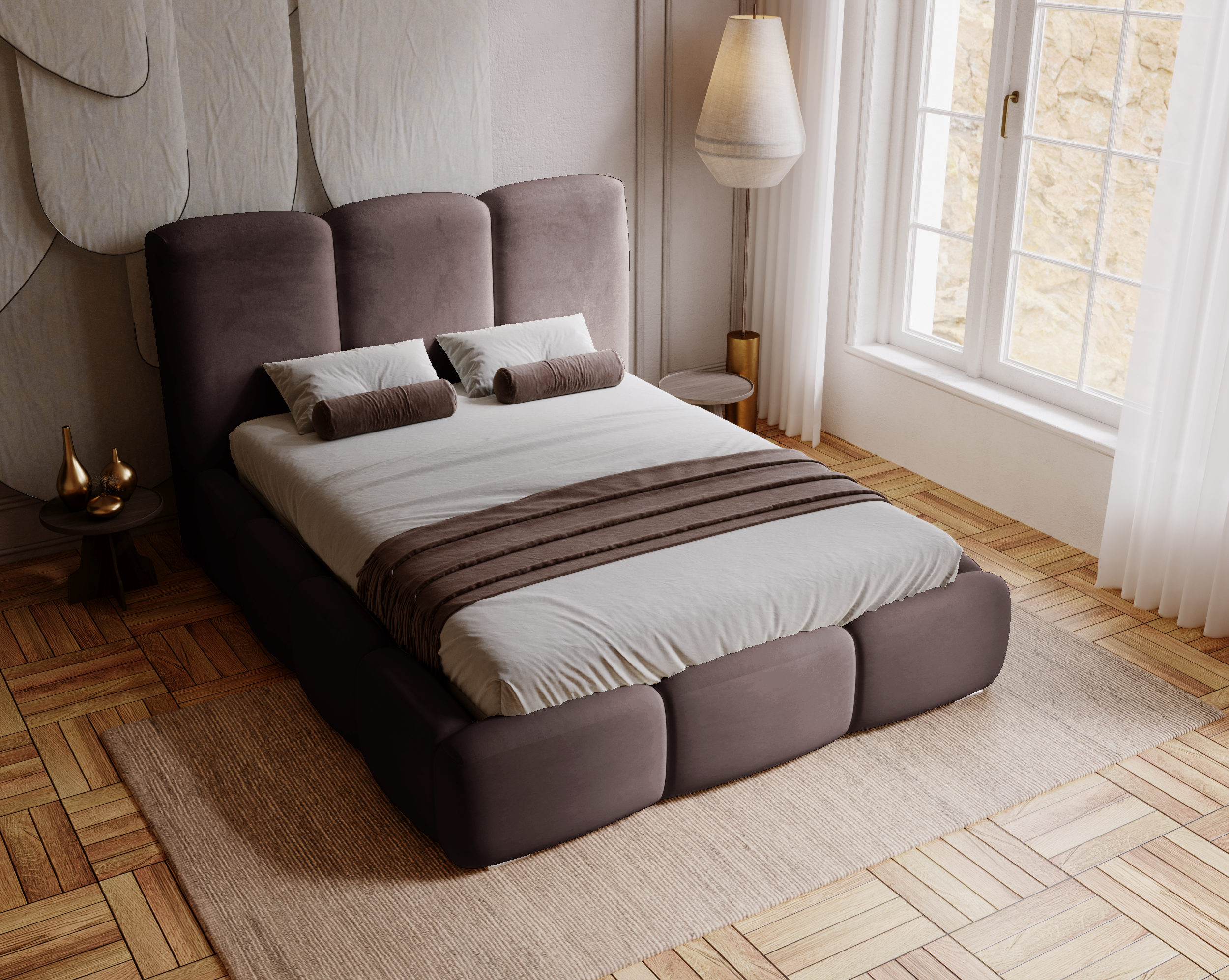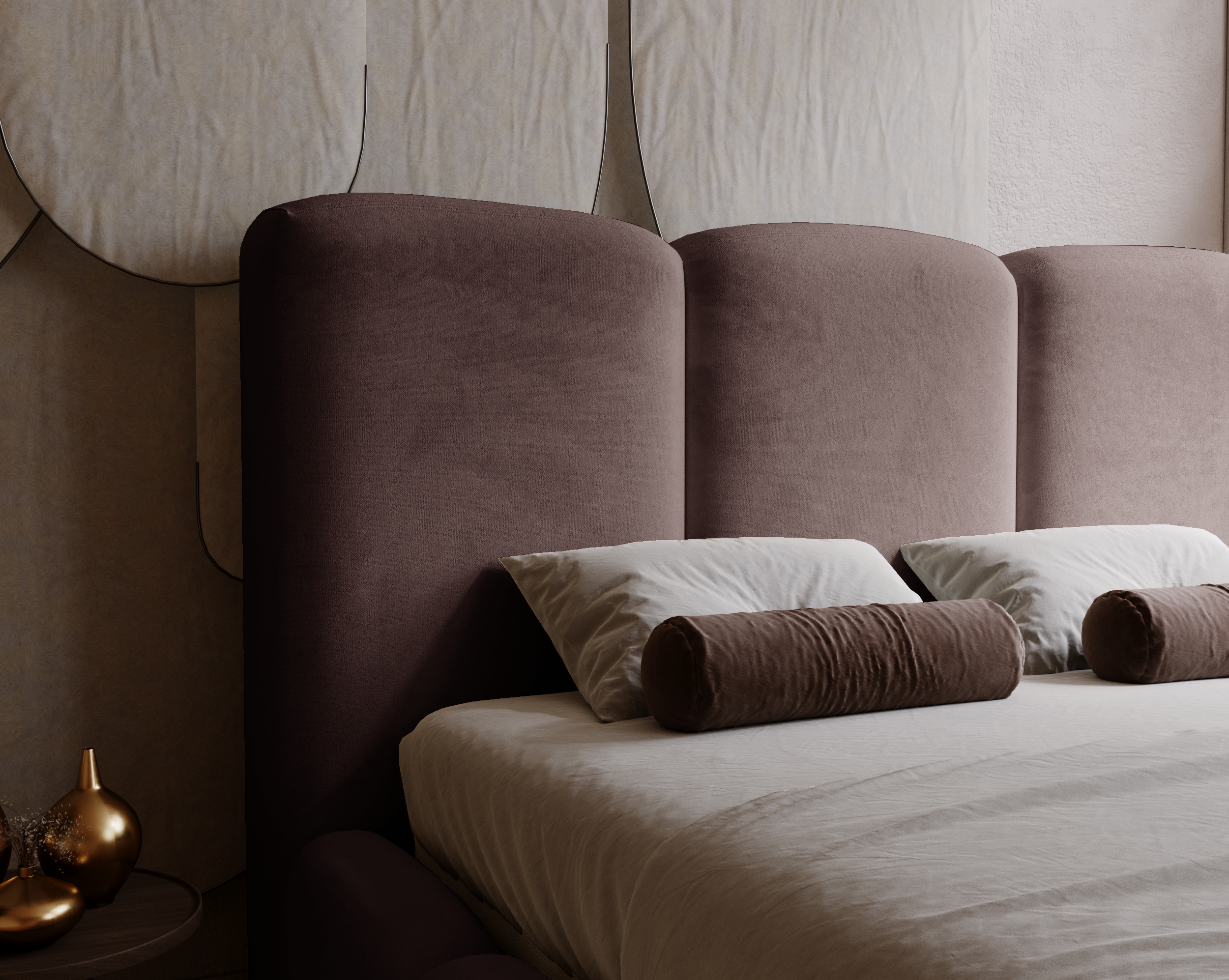 Wezgłowie wyróżnia się trzema szerokimi, pionowymi panelami o delikatnie zaoblonych krawędziach, nadając całości nowoczesny, niemal rzeźbiarski charakter. Niska, obła podstawa łóżka optycznie unosi się nad podłogą, podkreślając jego miękki i przyjazny design.
