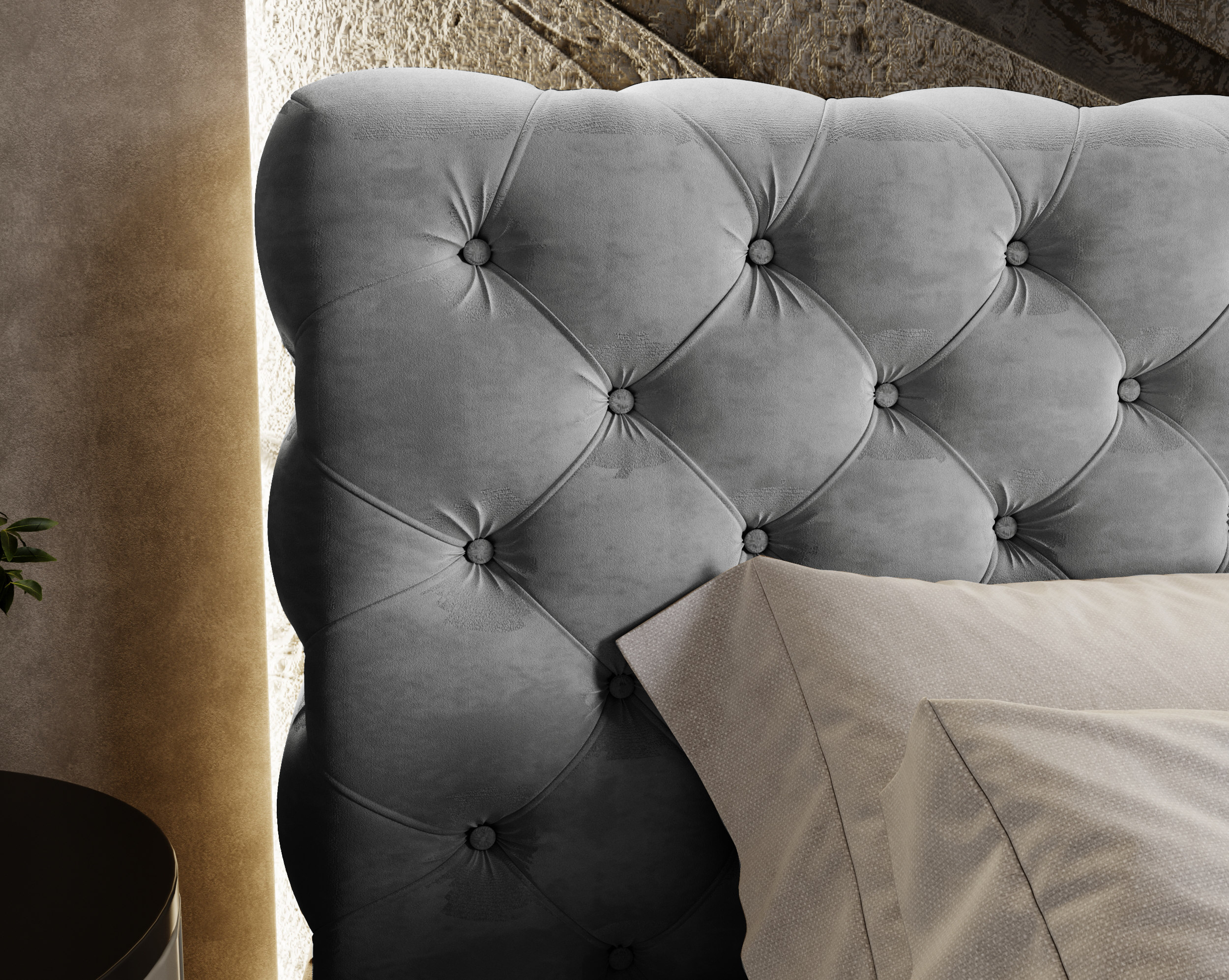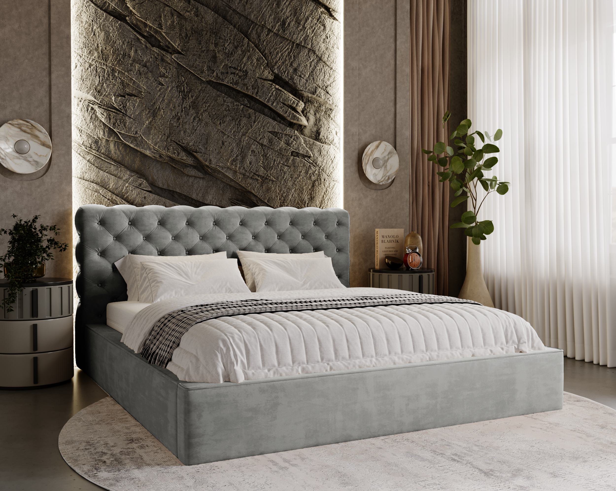 Największą ozdobą łóżka jest wysokie, pikowane wezgłowie wykończone guzikami, które tworzą efektowny, symetryczny wzór. Stabilna rama o pełnej bryle podkreśla elegancję mebla, jednocześnie gwarantując trwałość na lata. Łóżko wyposażone jest w pojemny schowek na pościel, do którego dostęp umożliwia solidny, podnoszony stelaż.