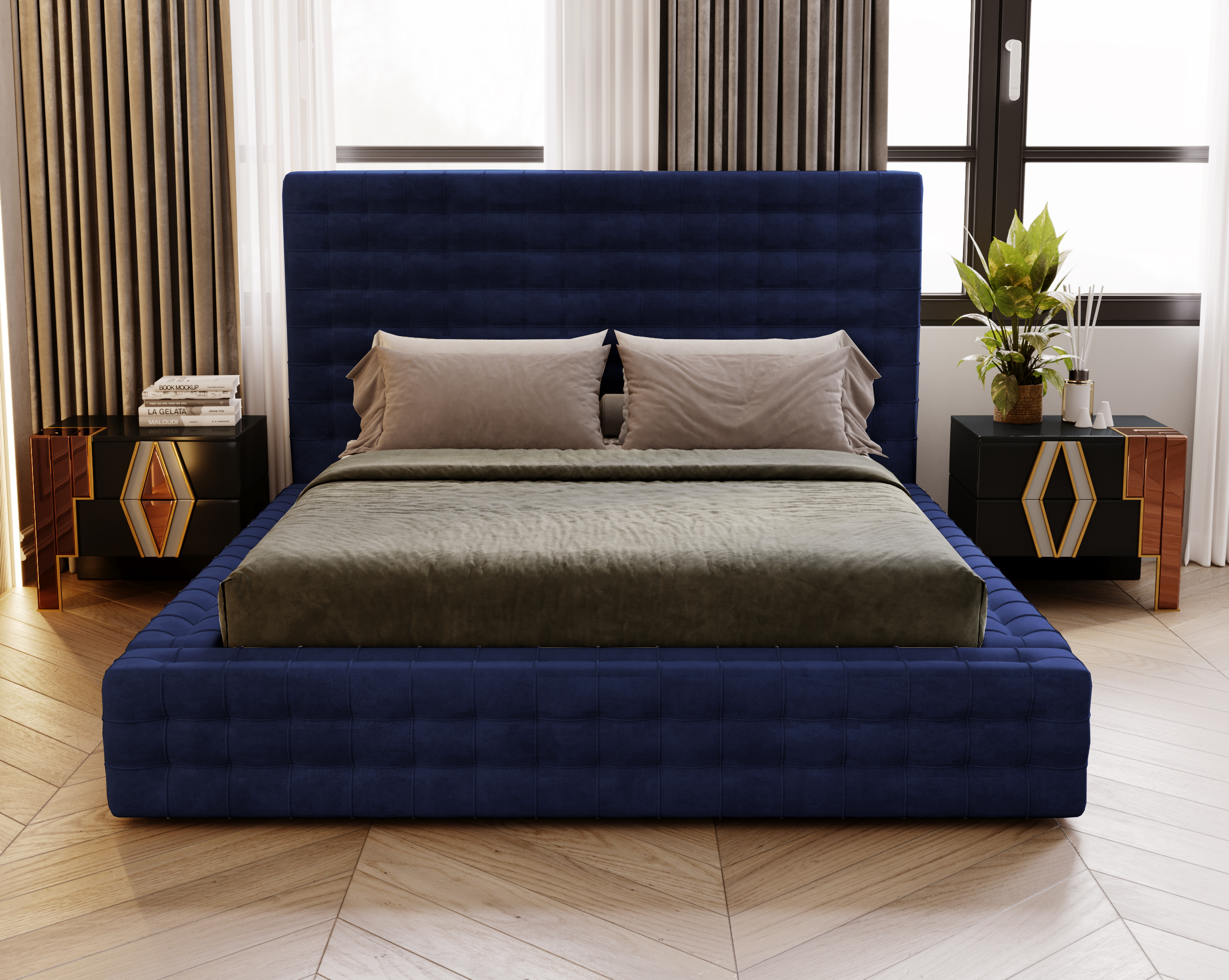 Wysokie, efektownie pikowane wezgłowie zapewnia komfortowy punkt oparcia, idealny do czytania lub wieczornego relaksu. Jego masywna, a zarazem lekka wizualnie konstrukcja sprawia, że łóżko staje się centralnym elementem każdej aranżacji – doskonale komponuje się zarówno z nowoczesnymi, jak i klasycznymi wnętrzami.