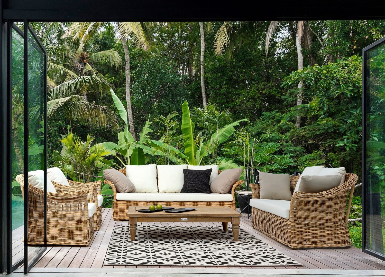 Konstrukcja wykonana jest z rattanu w plecionce typu kubu. Całość została wykończona lakierem nitrocelulozowym, co nadaje meblowi eleganckiego wyglądu oraz chroni go przed szkodliwymi warunkami atmosferycznymi.