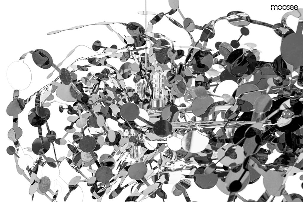 Jej konstrukcja została wykonana z doskonałej jakości stali w błyszczącym, chromowym odcieniu, co nadaje jej wyjątkowego blasku i ekskluzywnego charakteru. To, co wyróżnia lampę Monete, to klosz który swym wyglądem przypomina garść połączonych ze sobą monet. Splątane "monety" owinięte są wokół srebrnego ringu o średnicy 80 cm.