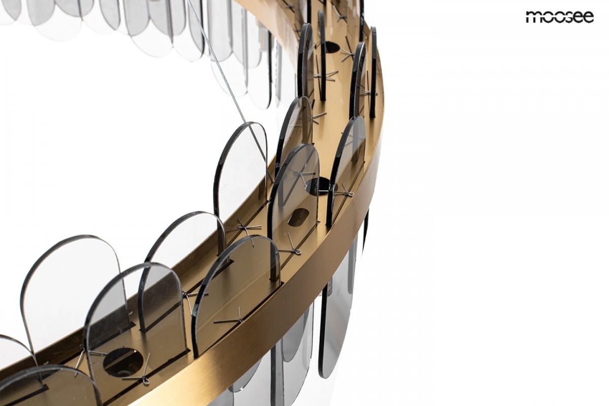 Szklane, dymione klosze zamontowano na stalowej obręczy w złotym kolorze, tworząc harmonijną kombinację najwyższej jakości materiałów i wykończeń. Światło przenika przez dymione klosze, tworząc przyjemne, nastrojowe oświetlenie, jednocześnie dodając unikalny efekt wizualny.