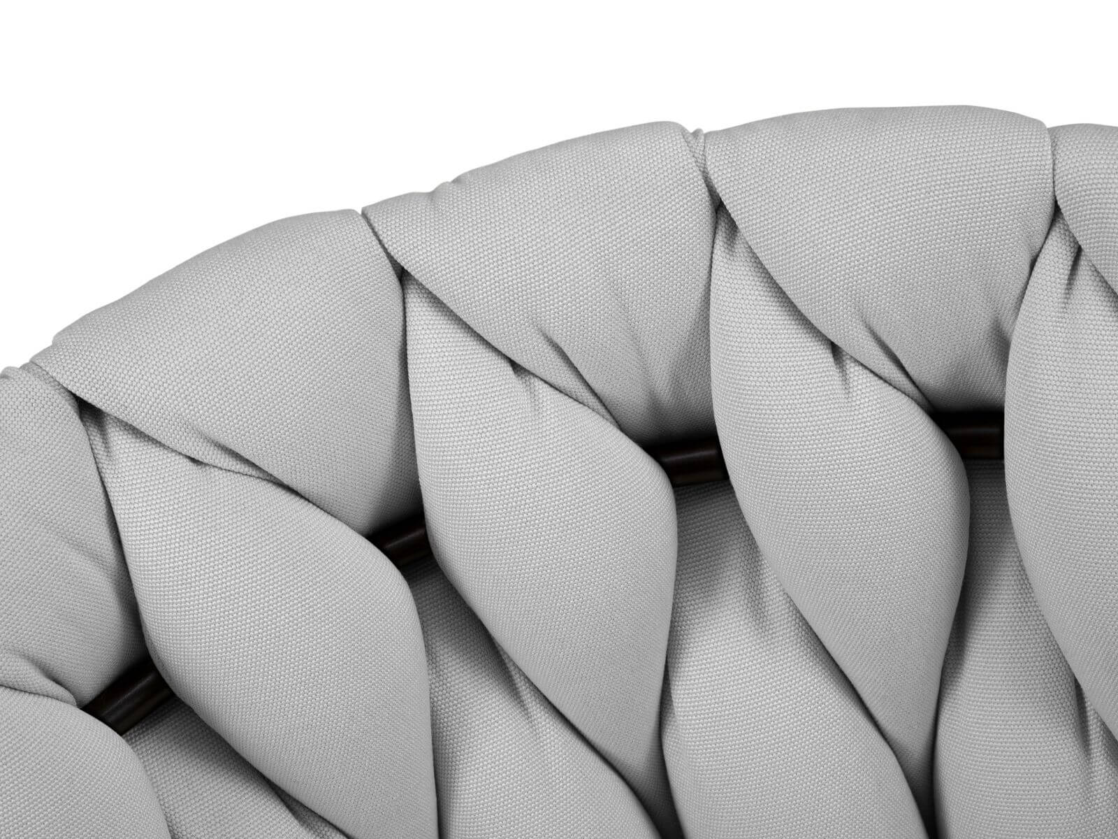 Ławka ogrodowa Simi pokryta jest szarą tkaniną obiciową Toptextil Garden, przeznaczoną głównie do mebli ogrodowych, tarasowych i balkonowych. Jej gładka struktura, o prostym, płóciennym splocie ma lekko połyskującą powierzchnię. Przyjemna w dotyku. Charakteryzuje się wysoką odpornością na nasłonecznienie.