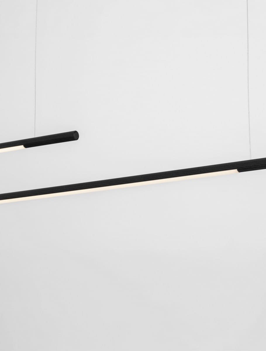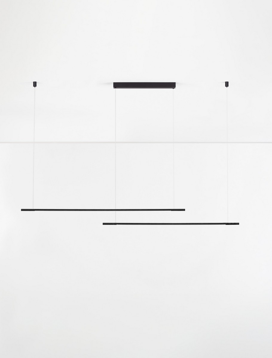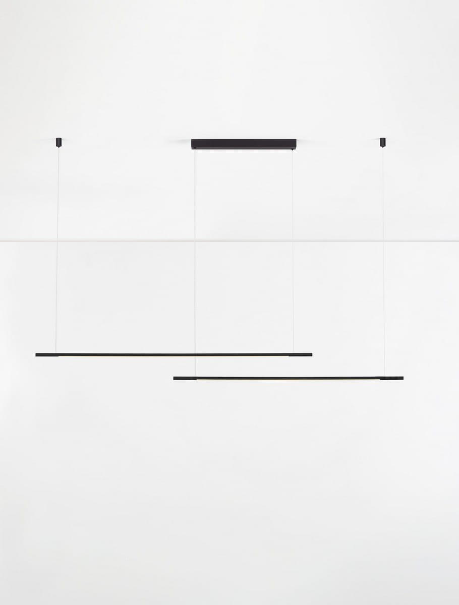 Model Duo składa się z dwóch równoległych ramion zawieszonych na różnych wysokościach, tworząc harmonijną, przestrzenną kompozycję. Obie lampy świetnie sprawdzą się nad stołem w jadalni, w kuchni czy w biurze, oferując funkcjonalne i równomierne oświetlenie. Lampa dotępna jest także w wersji pojedynczej.