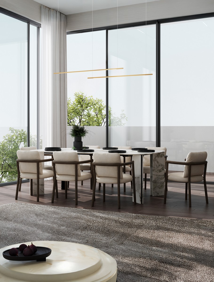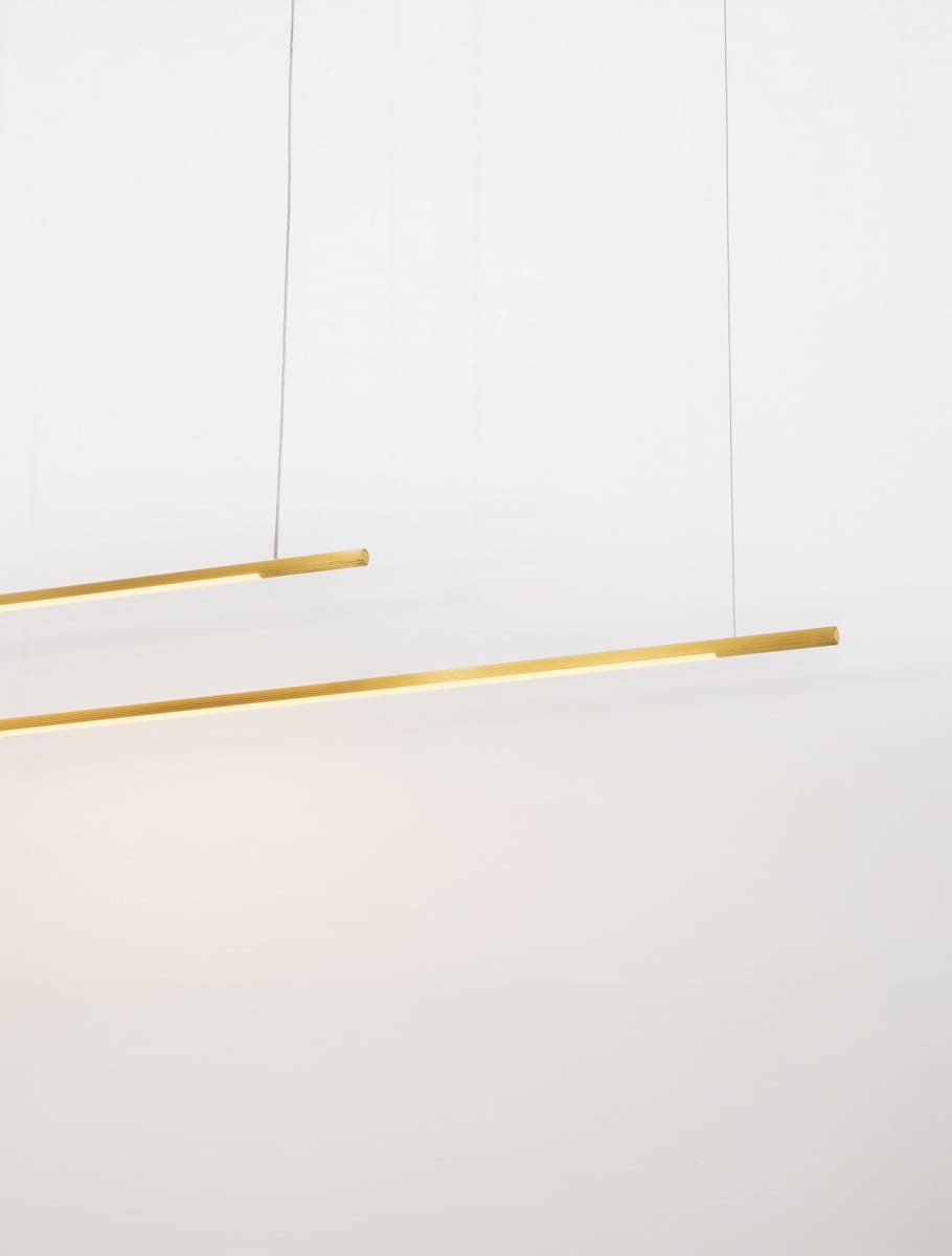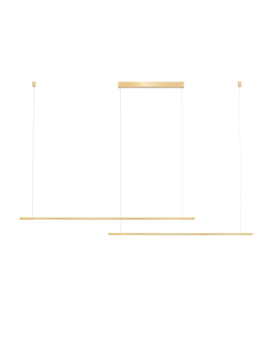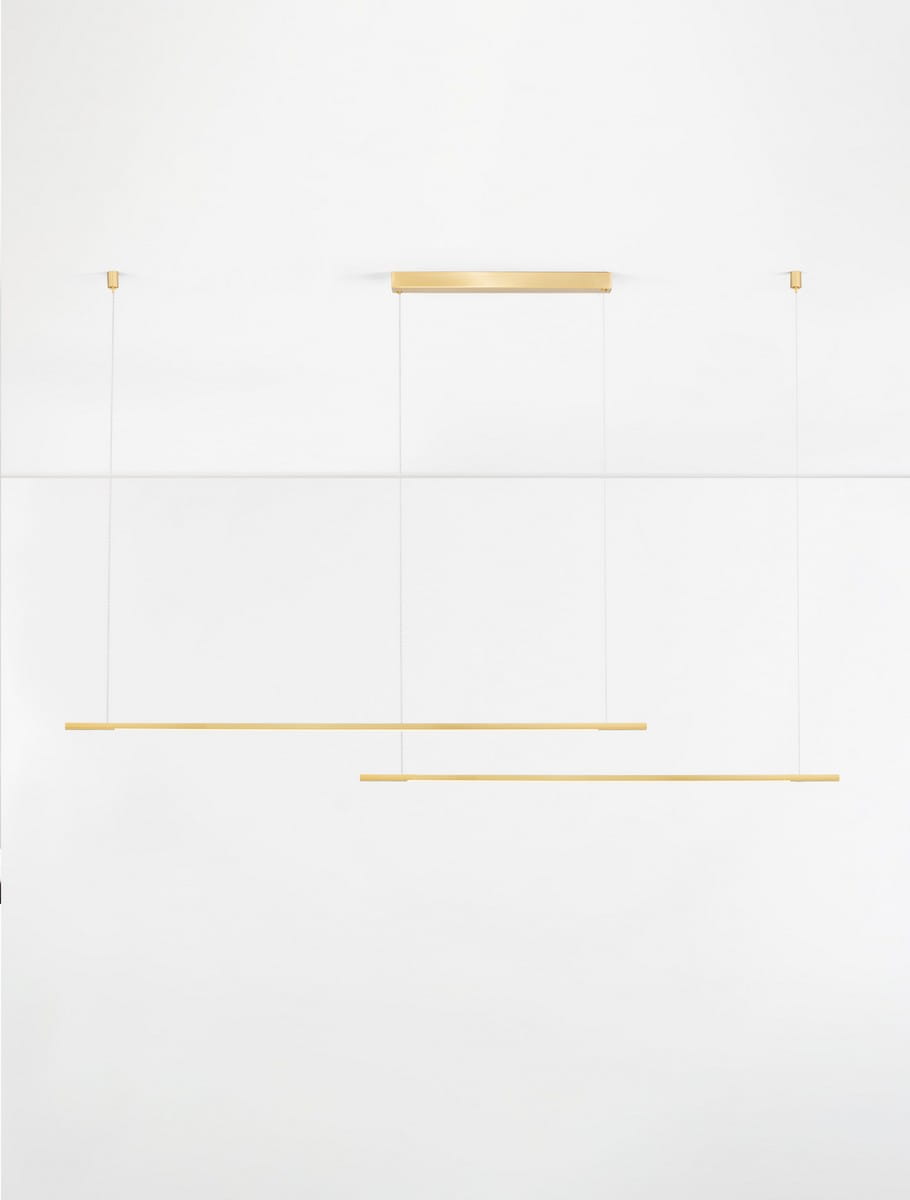 Model Duo składa się z dwóch równoległych ramion zawieszonych na różnych wysokościach, tworząc harmonijną, przestrzenną kompozycję. Obie lampy świetnie sprawdzą się nad stołem w jadalni, w kuchni czy w biurze, oferując funkcjonalne i równomierne oświetlenie. Lampa dotępna jest także w wersji pojedynczej.