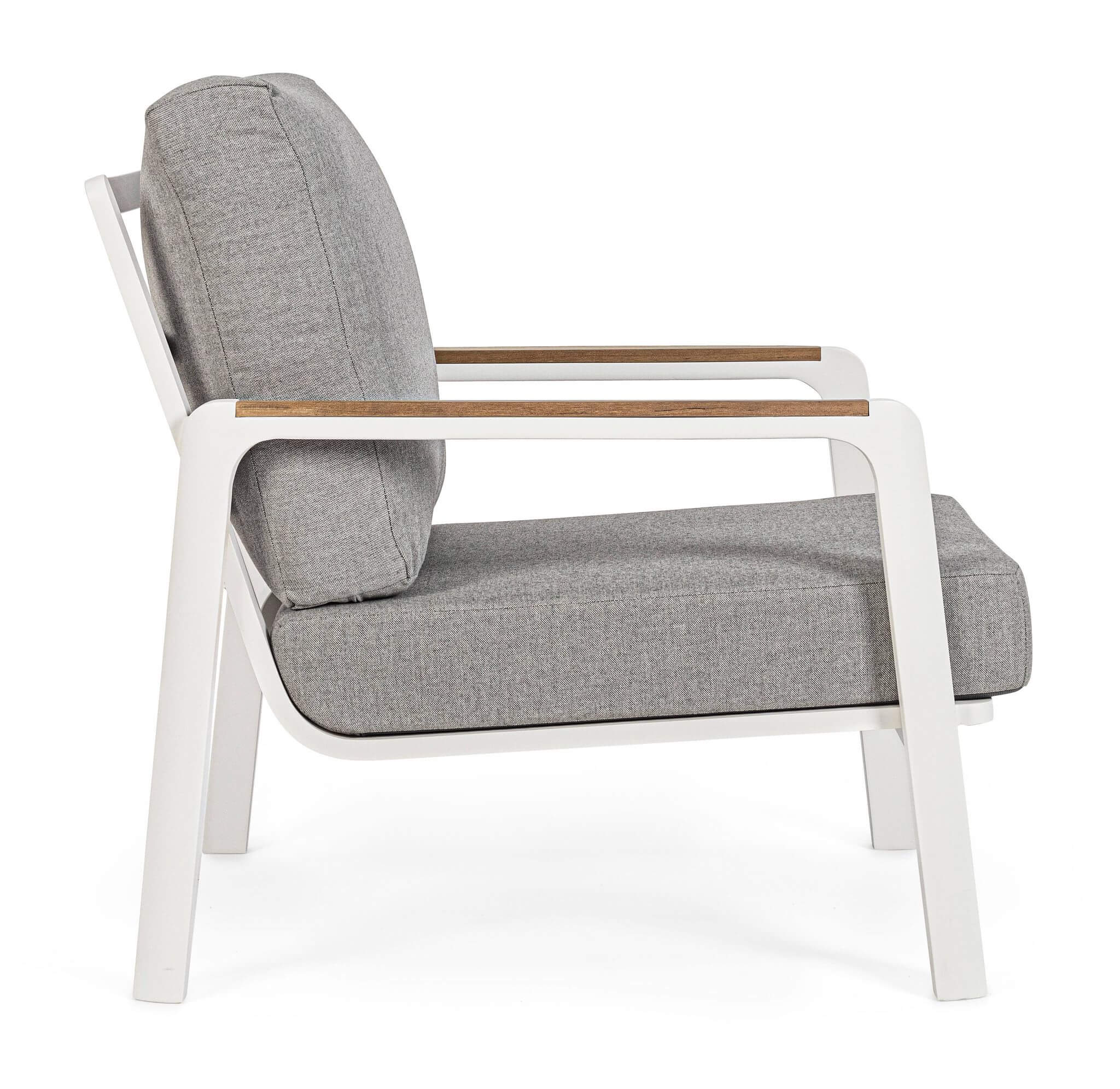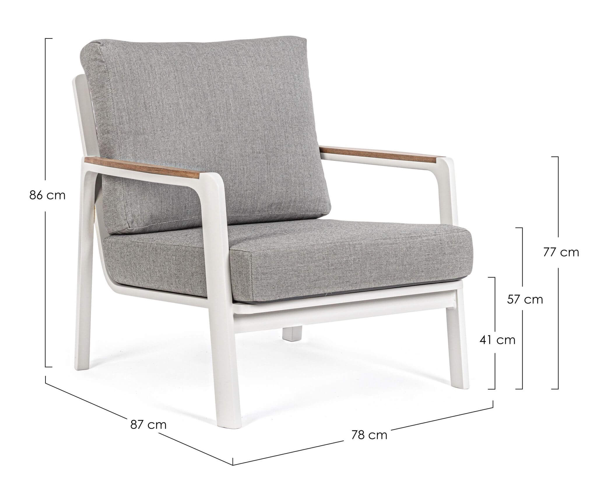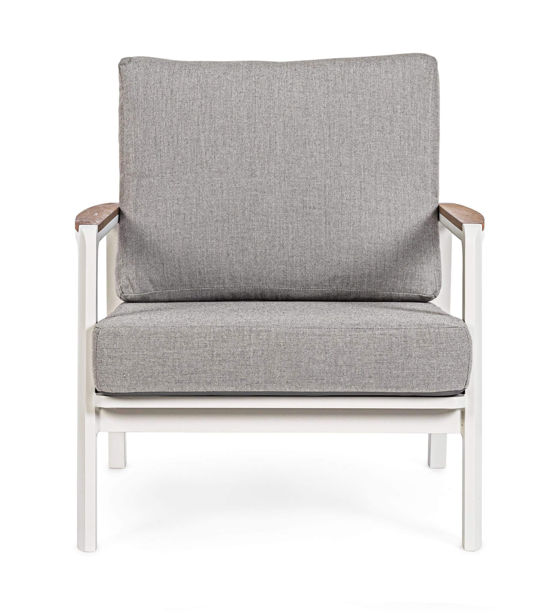 Konstrukcja jasnego fotela ogrodowego wykonana jest z aluminium pokrytego poliestrową powłoką, co zapewnia trwałość i odporność na warunki atmosferyczne.