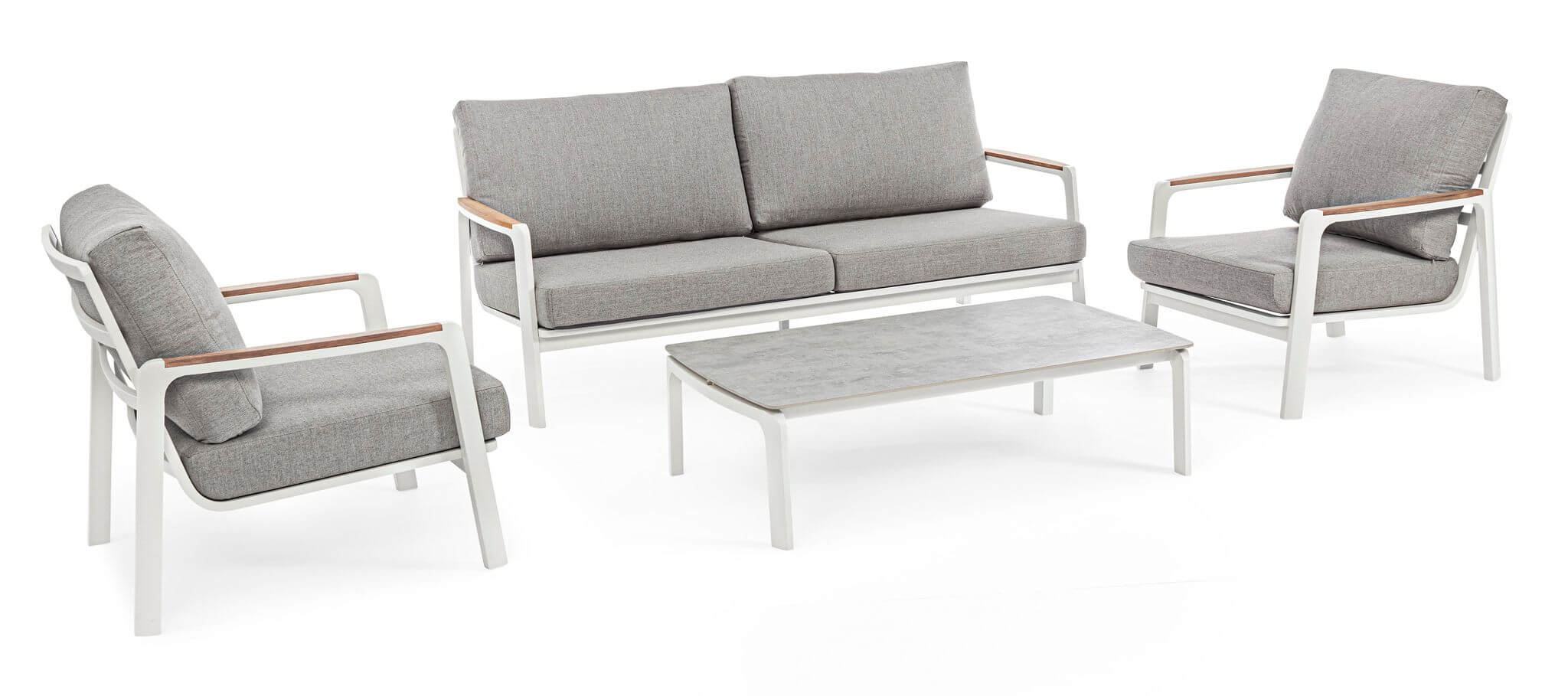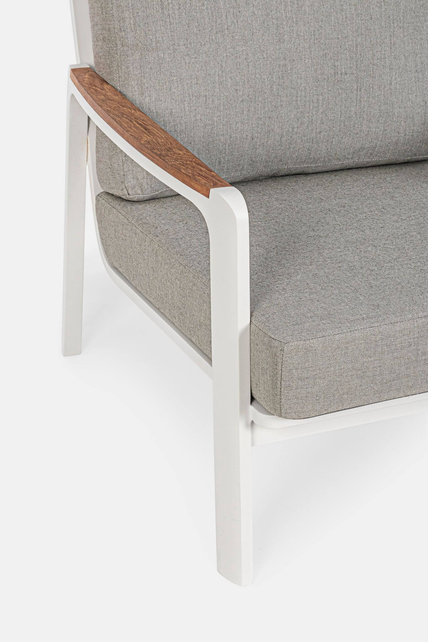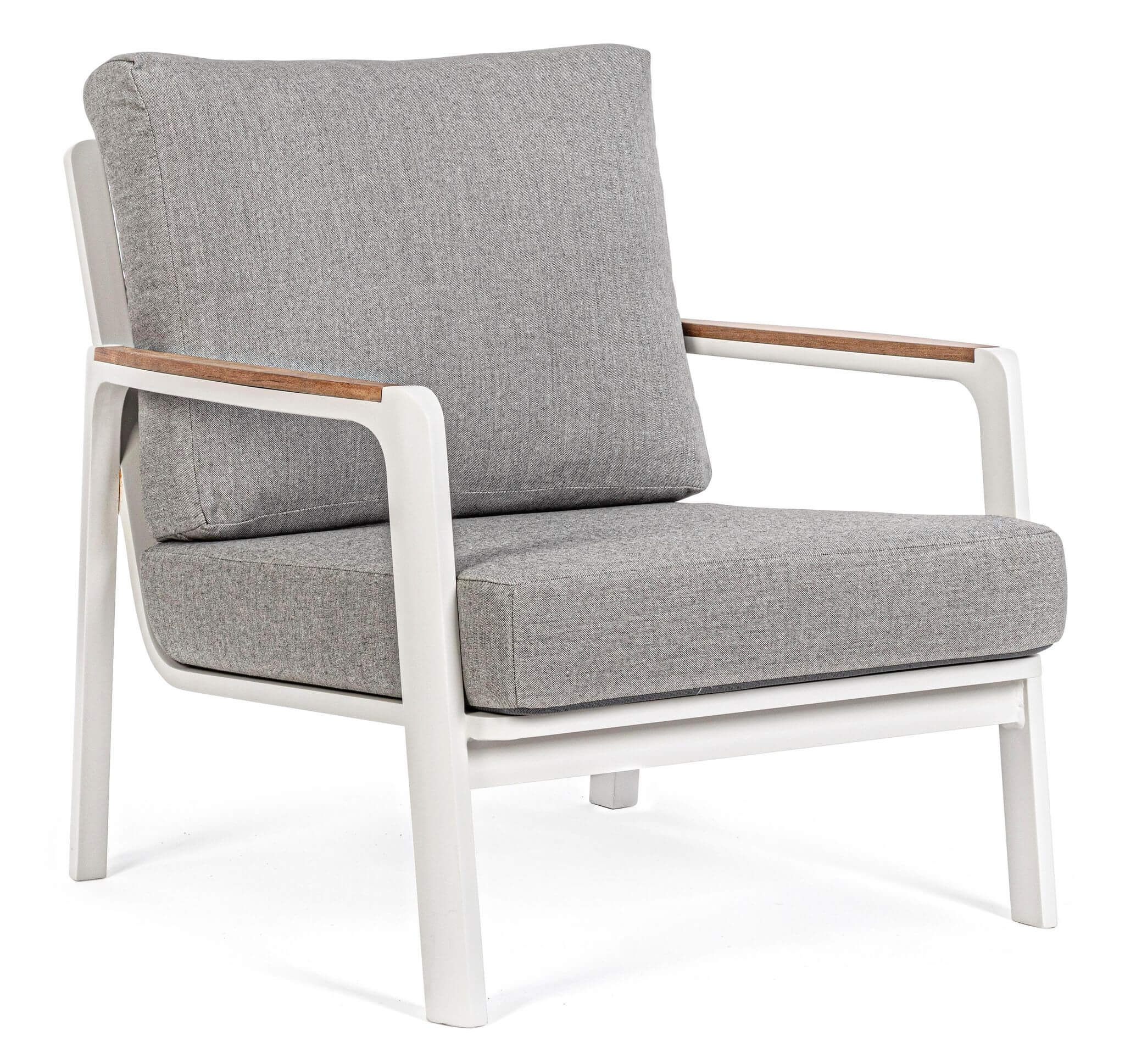 Konstrukcja jasnego fotela ogrodowego wykonana jest z aluminium pokrytego poliestrową powłoką, co zapewnia trwałość i odporność na warunki atmosferyczne.