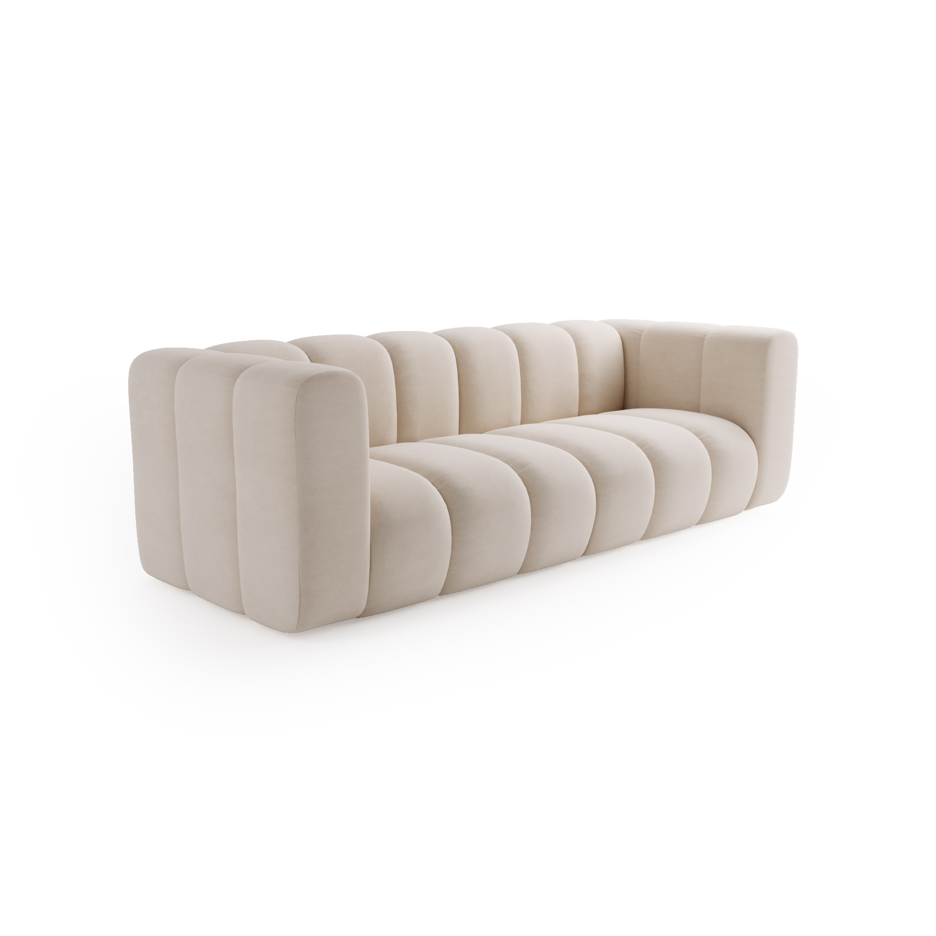 Tapicerowana tkaniną Riviera 21 w szlachetnym odcieniu beżu, sofa łączy subtelny połysk z aksamitną miękkością welwetu. Riviera to materiał o wyjątkowych właściwościach użytkowych – odporny na ścieranie (120 000 cykli Martindale’a), mechacenie i działanie światła. Jej welwetowa faktura pięknie współgra ze światłem, a jednocześnie pozostaje praktyczna i trwała w codziennym użytkowaniu.