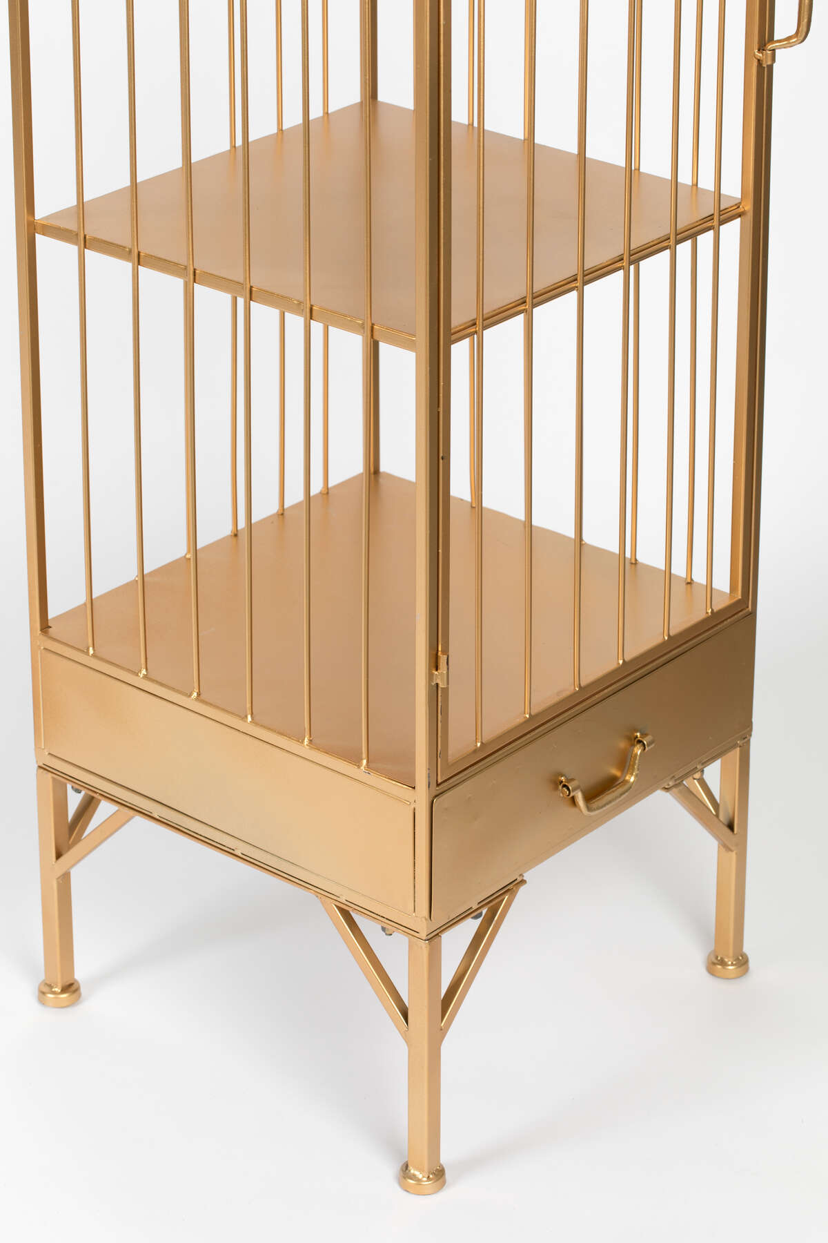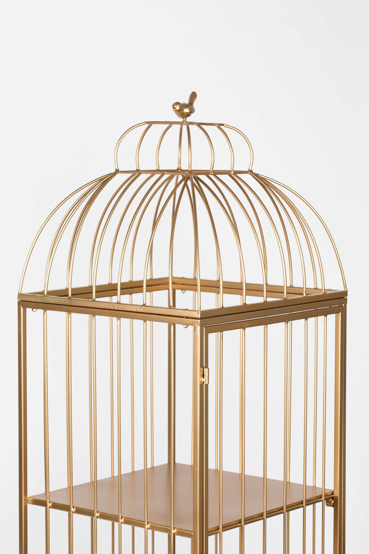 Nietuzinkowy regał w stylu industrialnym, który przypomina kształtem klatkę dla ptaków, co podkreśla figurka ptaka na szczycie regału. Świetnie wkomponuje się nie tylko we wnętrza tradycyjne, ale też doda niebanalnego uroku wnętrzom nowoczesnym. Złoty kolor przyciąga wzrok, i pięknie podkreśla szykowność wystroju wnętrza. Wygląda bardzo lekko i delikatnie, ale idealnie spełni funkcję miejsca na przechowywanie tego co potrzebujesz wyeksponować w pomieszczeniu. To nieoczywisty pomysł na ożywienie salonu czy sypialni, i wspaniała ozdoba tam gdzie zechcesz, aby stała.