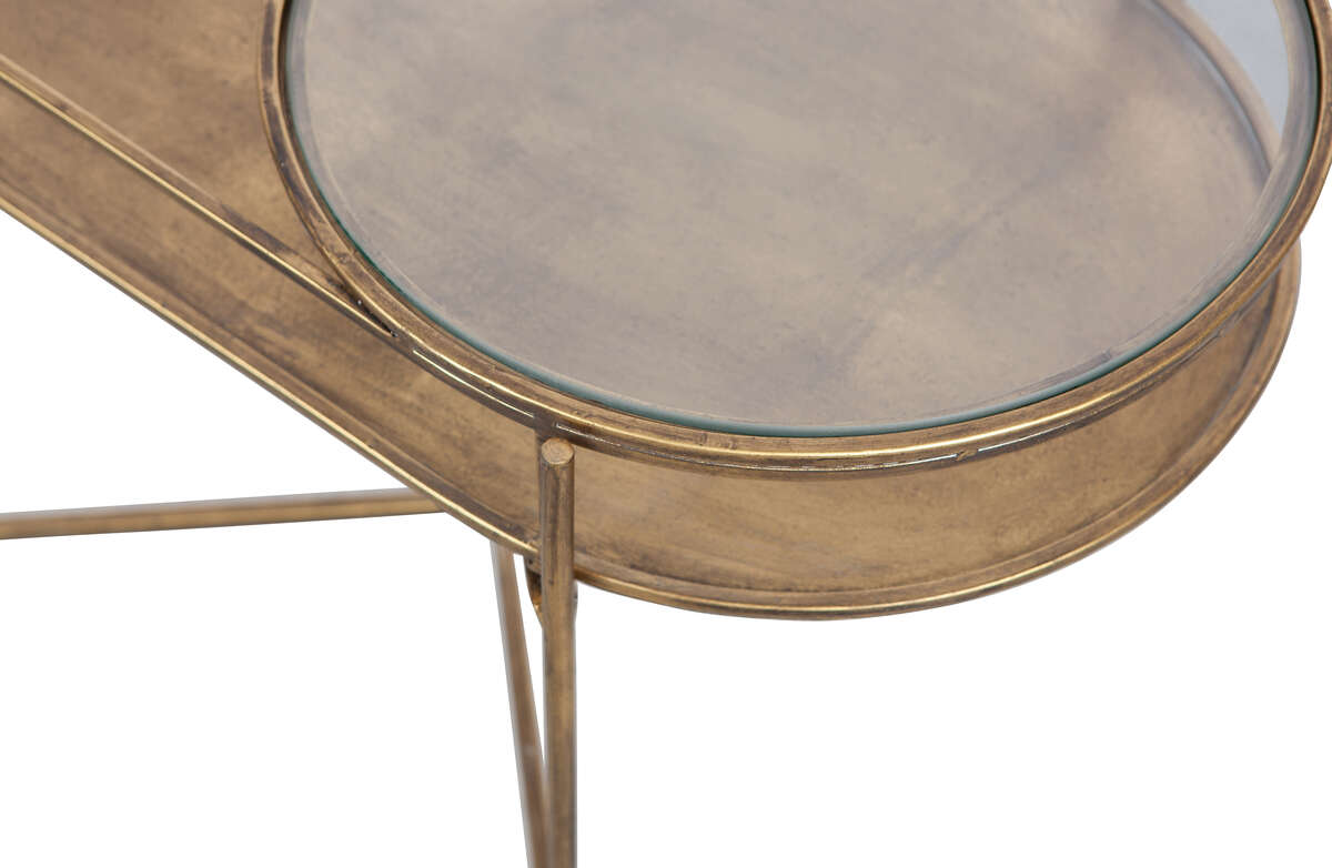 Szlachetny niczym czule pielęgnowane latami antyczne meble, mosiężny stolik kawowy Adorable jest odpowiedzią na potrzeby miłośników dodatków z duszą. Wykonano go ze stali z antycznym mosiężnym wykończeniem oraz szkła. Bardzo ciekawie rozwiązano kwestię blatu. Składa się on z dwóch części - pełnej niższej o owalnym kształcie i górnej, której część stanowi okrągły blat z bezpiecznego szkła. Można go zatem bardzo ciekawie zaaranżować i tworzyć niepowtarzalne kompozycje z kwiatów, ceramiki, bibelotów i zdjęć. Absolutny unikat!