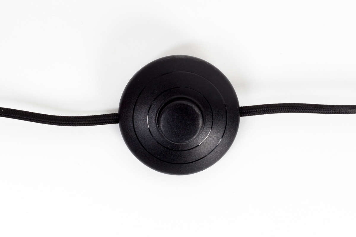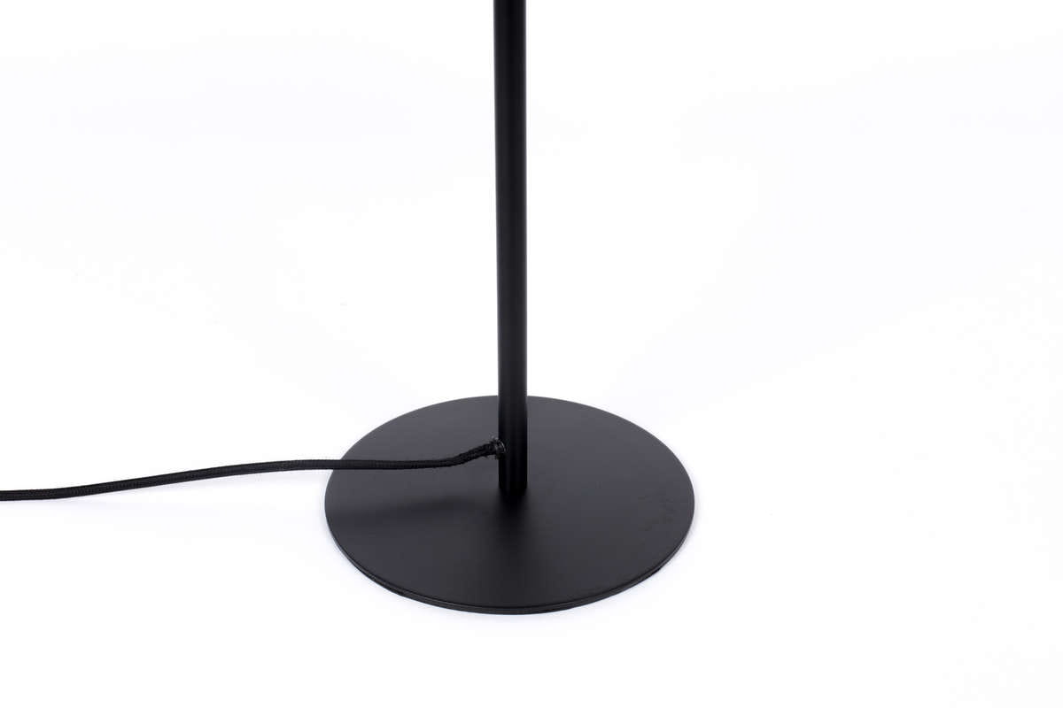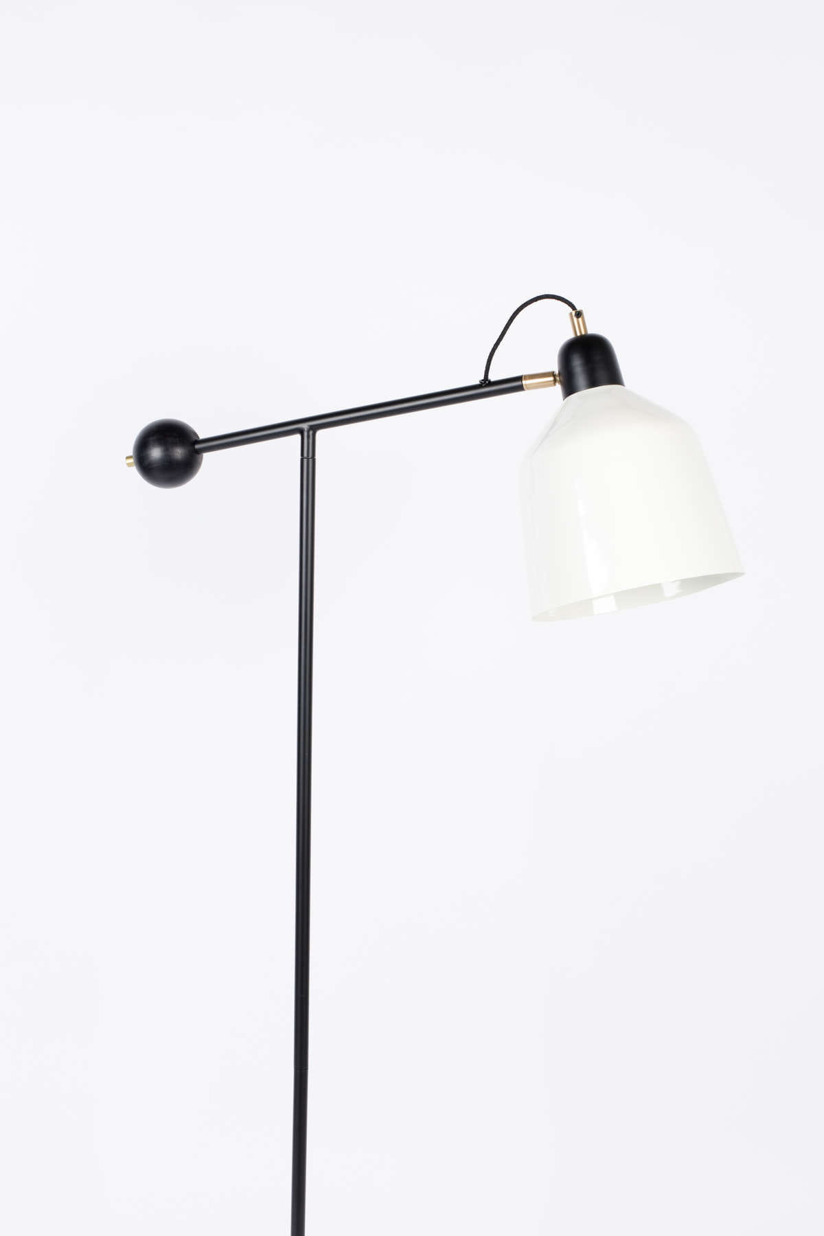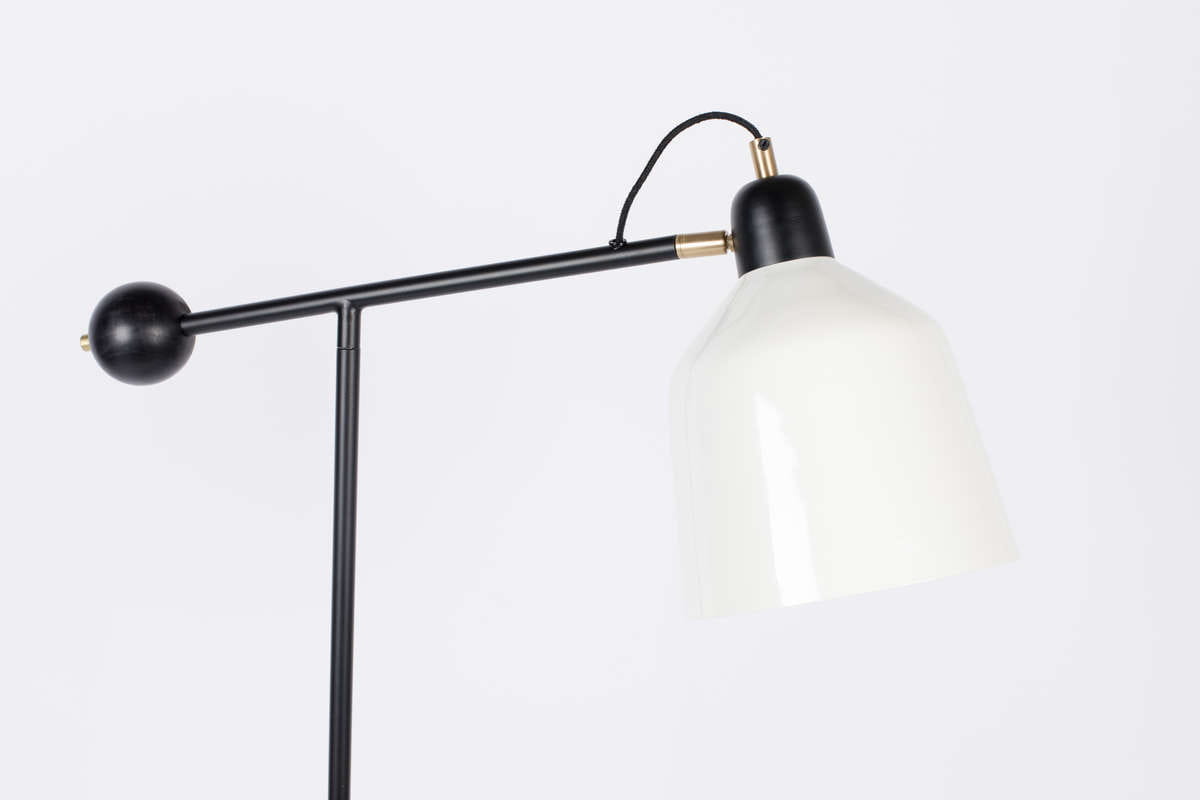 Lampa posiada nieruchome ramię wystające poza główną oś podstawy, zakończone drewnianą kulą w czarnym kolorze. Kula wydaje się działać jak przeciwwaga dla metalowego klosza. Drobne, złote elementy nadają lampie eleganckiego charakteru, przełamując standardowe odcienie czerni i bieli.