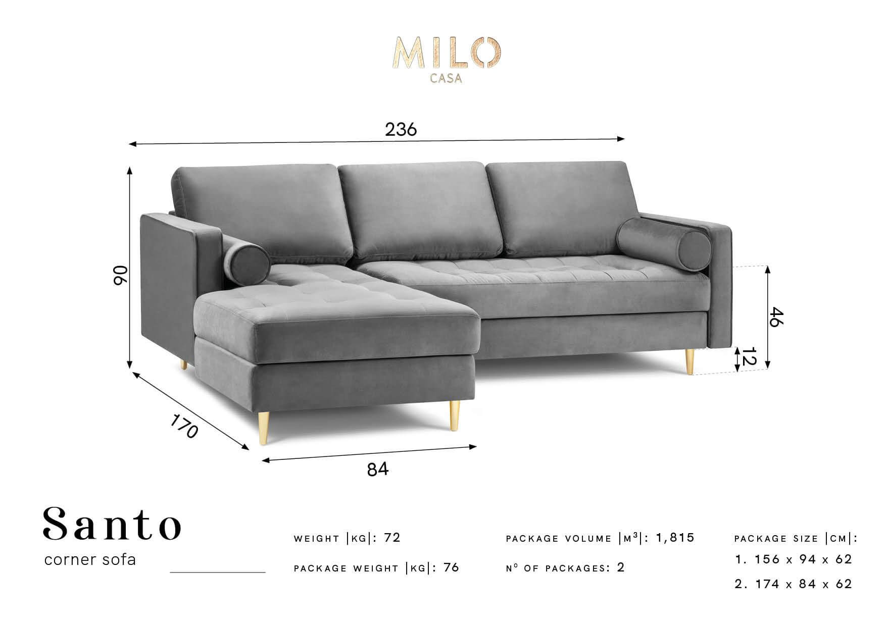 Kolor pikowanego narożnika Santo to butelkowa zieleń - Salvador 7 (tkanina) oraz złoty (nóżki). Mebel oferujemy także na czarnych nóżkach oraz w innych kolorach.
