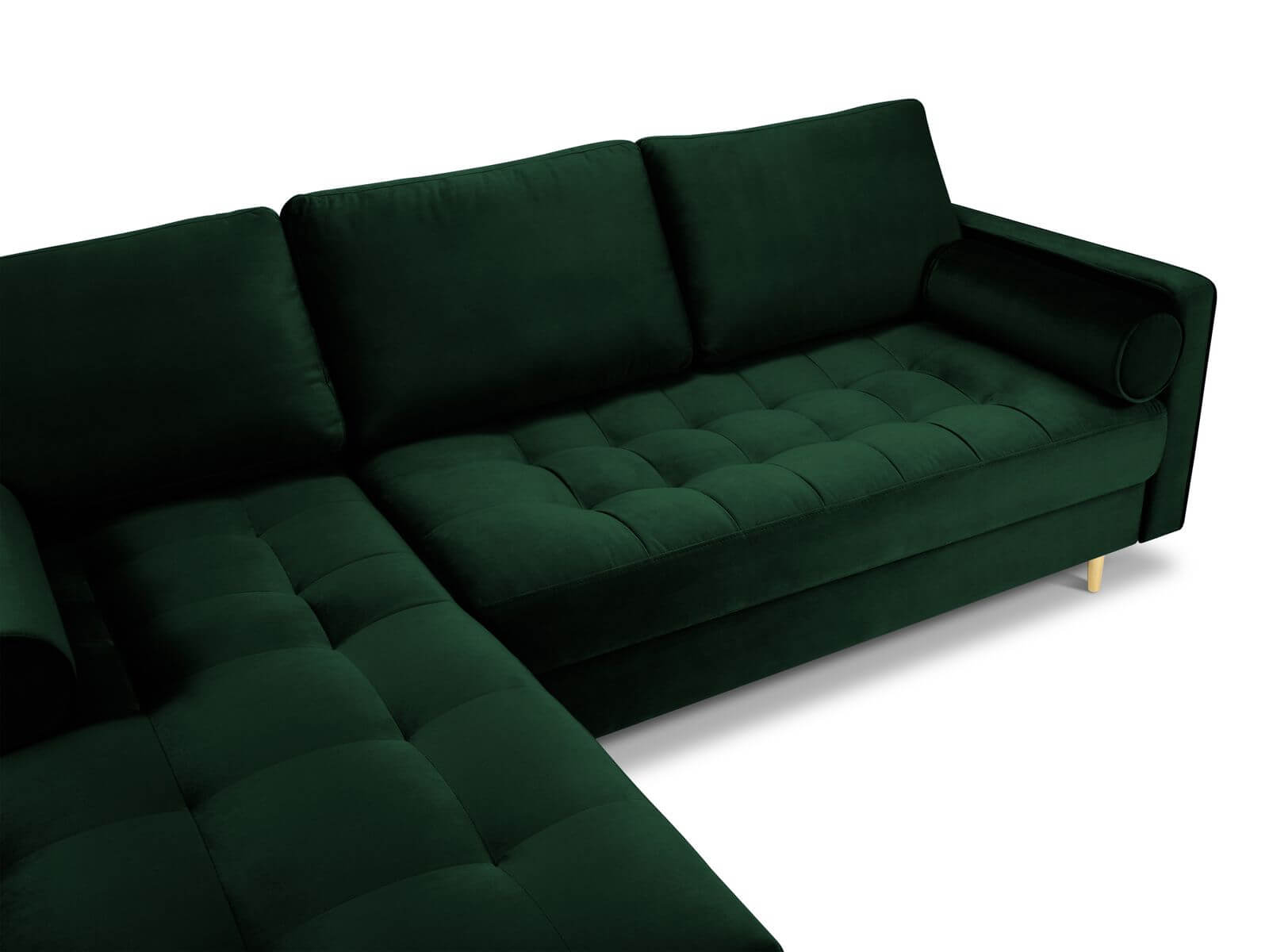 Narożna sofa pikowana Santo aksamit butelkowa zieleń na złotych nóżkach