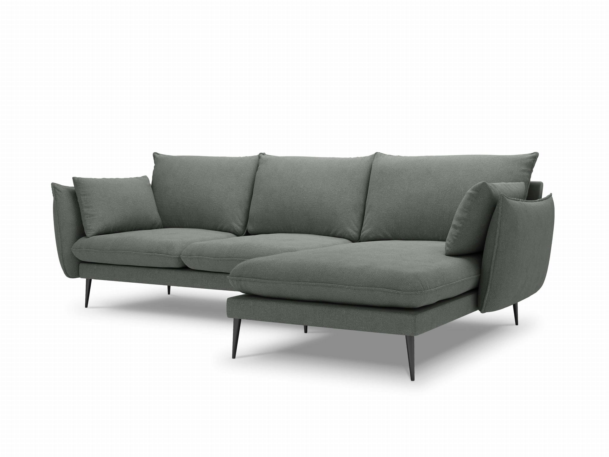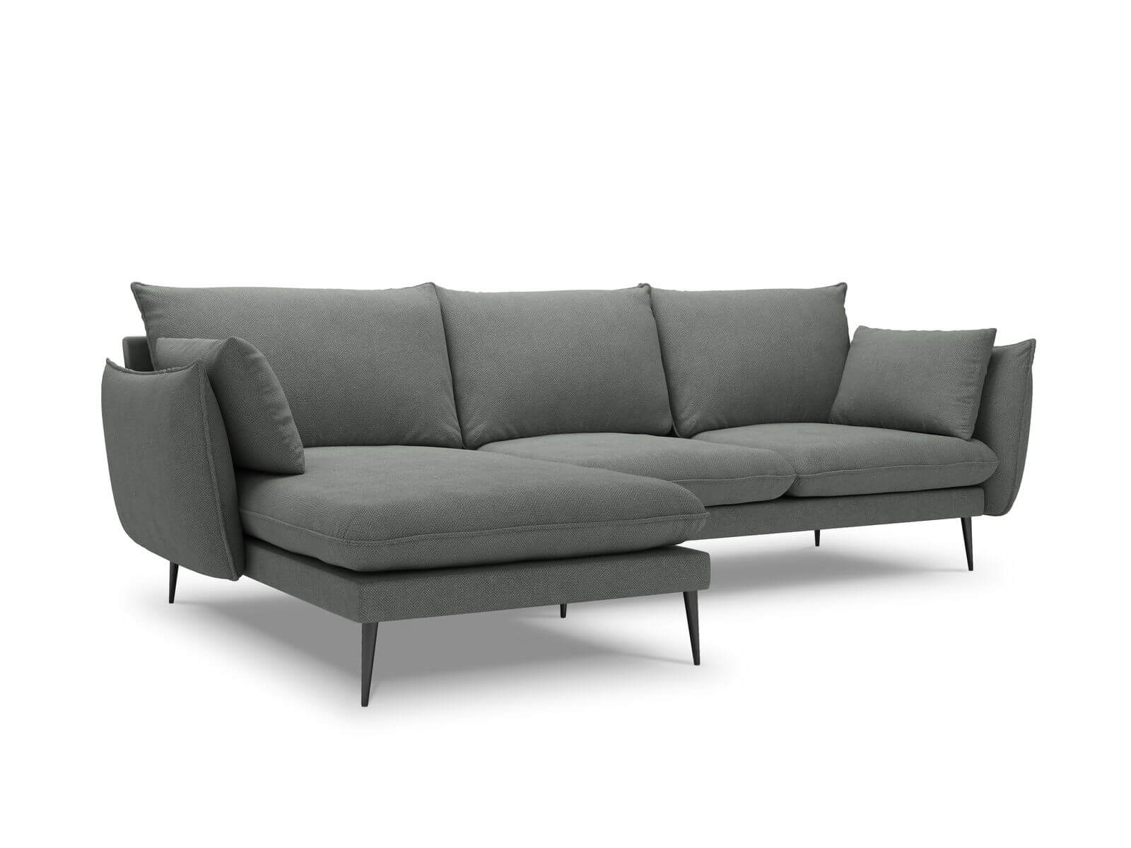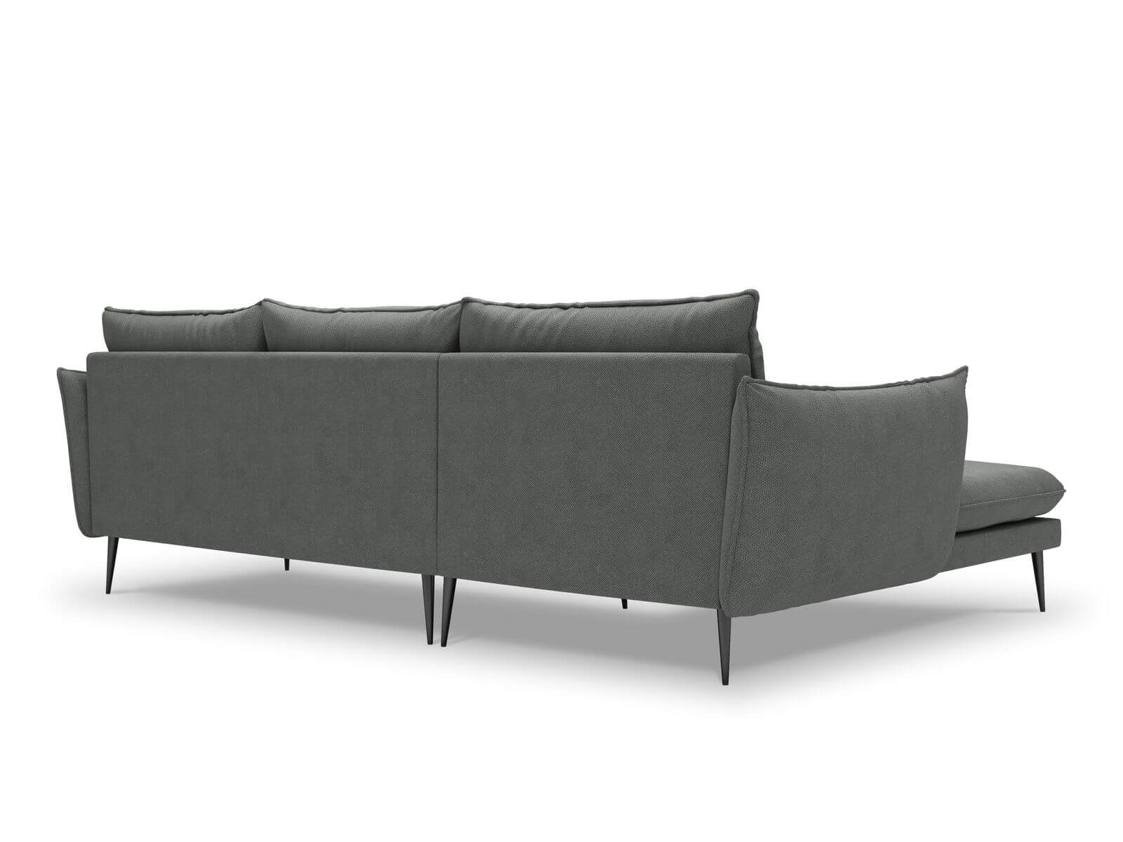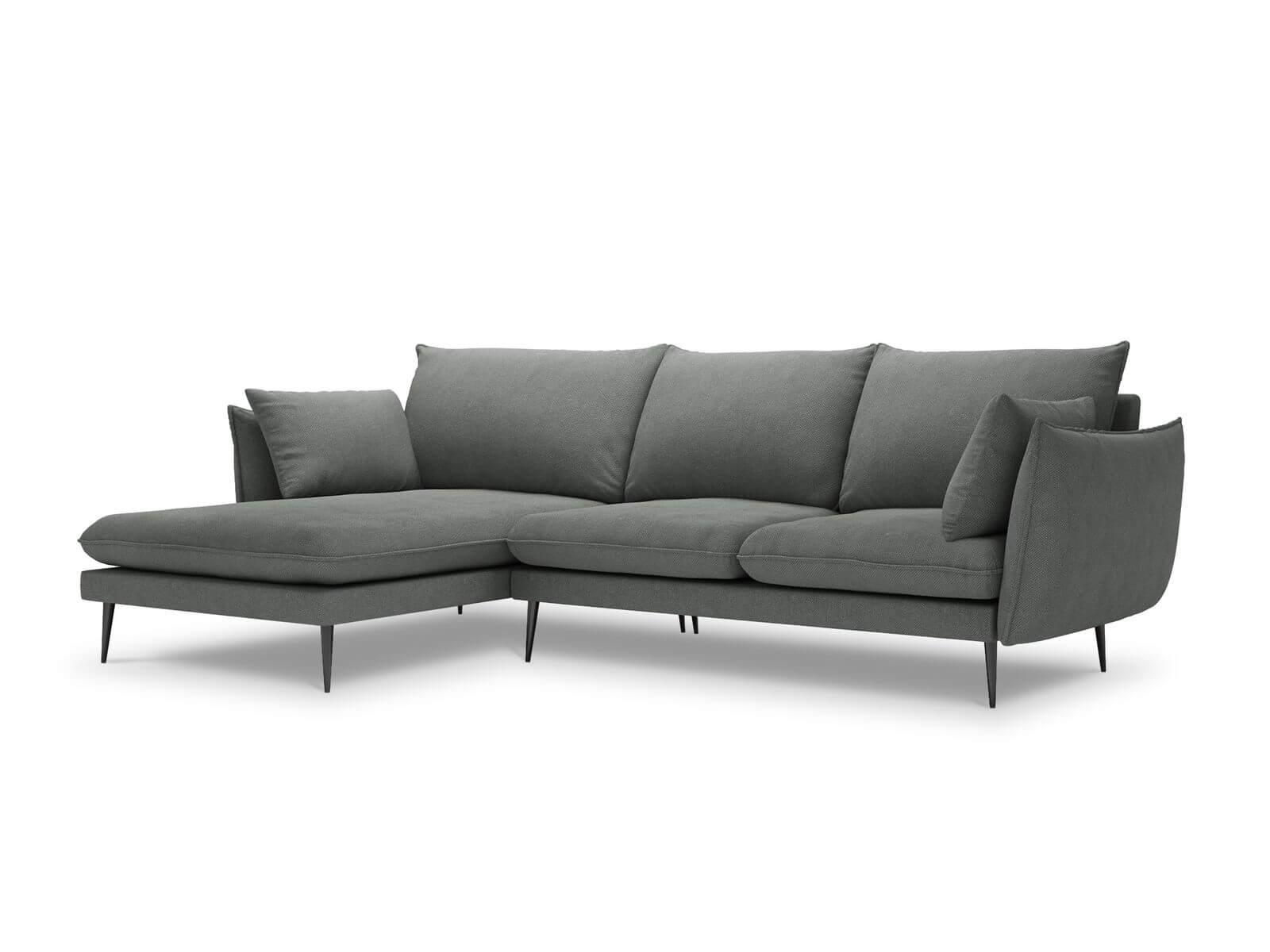 Kolor prezentowanego narożnika Elio to ciemny szary - Positano 87 (tkanina) oraz czerń (podstawa). Mebel oferujemy także na złotych nóżkach oraz w kolorach: jasny beż (Positano 02), ciemny beż (Positano 08), jasny szary (Positano 83), grafitowy (Positano 95). Do wyboru jest strona narożnika: lewa lub prawa.