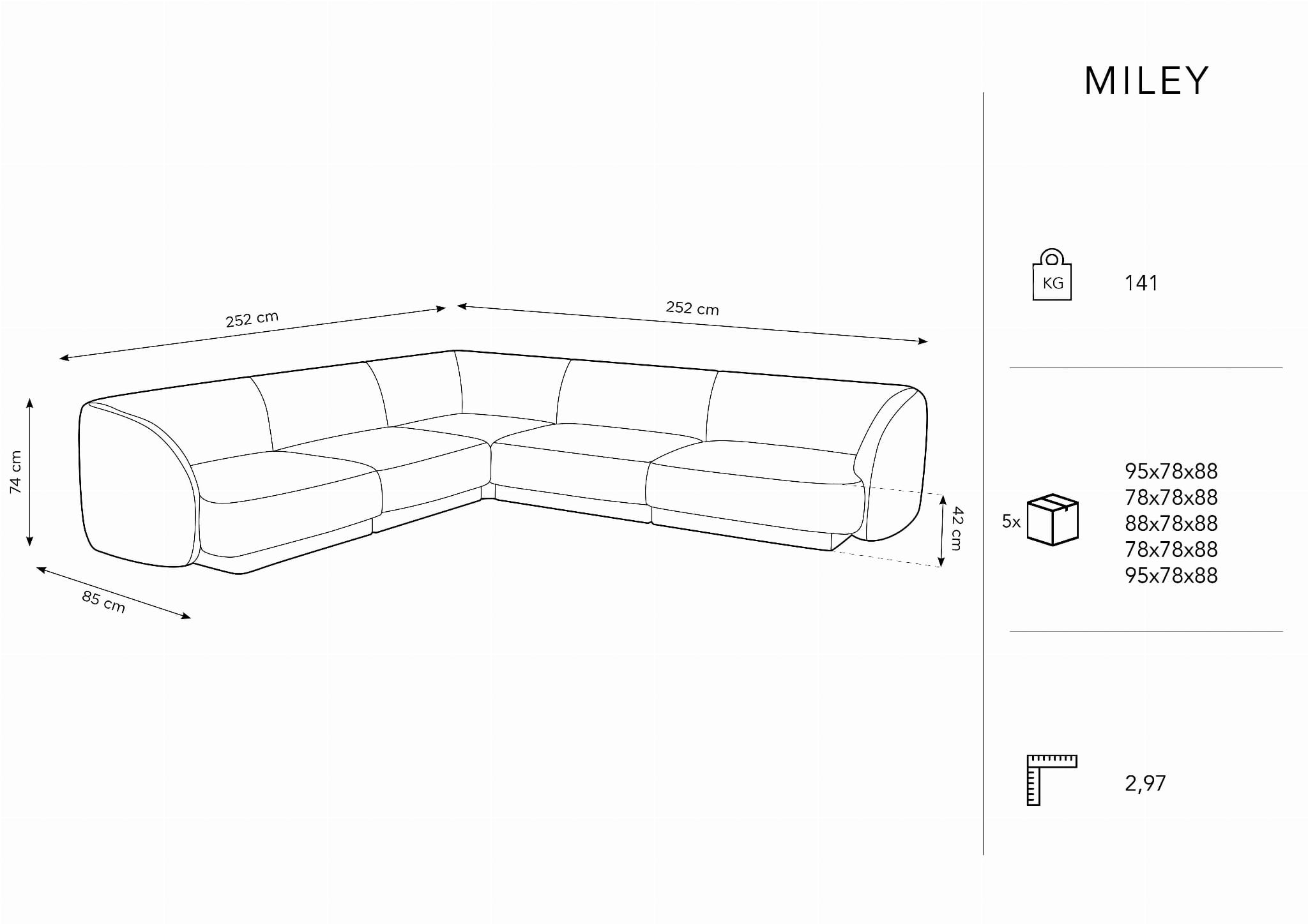 Granatowy narożnik Miley tapicerowany jest syntetyczną tkaniną imitującą aksamit - Bluvel 86. Delikatny połysk materiału sprawia, że jest on dobrym wyborem do eleganckich projektów wnętrz.