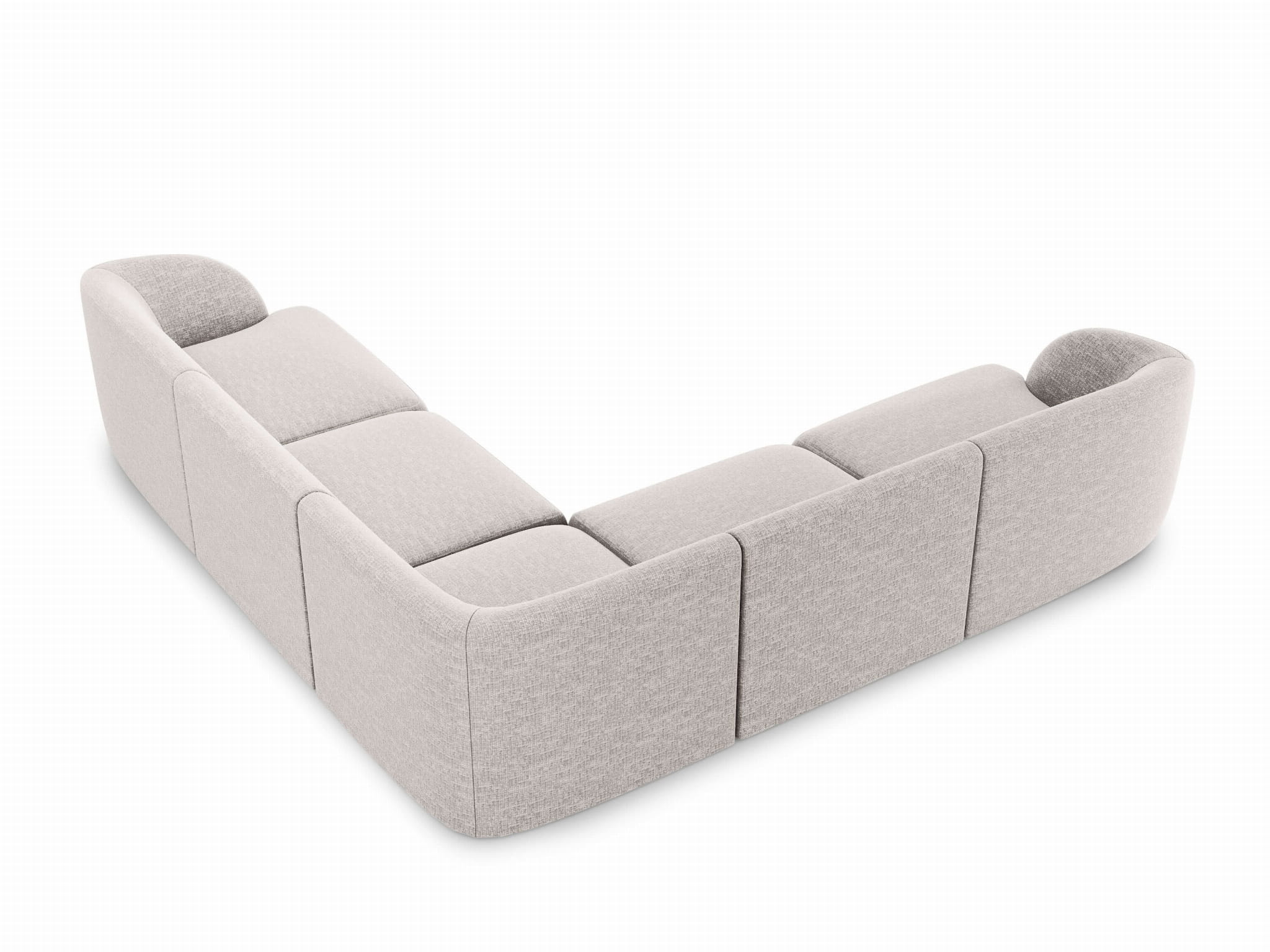 Jasno szary narożnik Miley to nowoczesny mebel o zaokrąglonych kształtach, wykończony przytulną, miękką tkaniną.