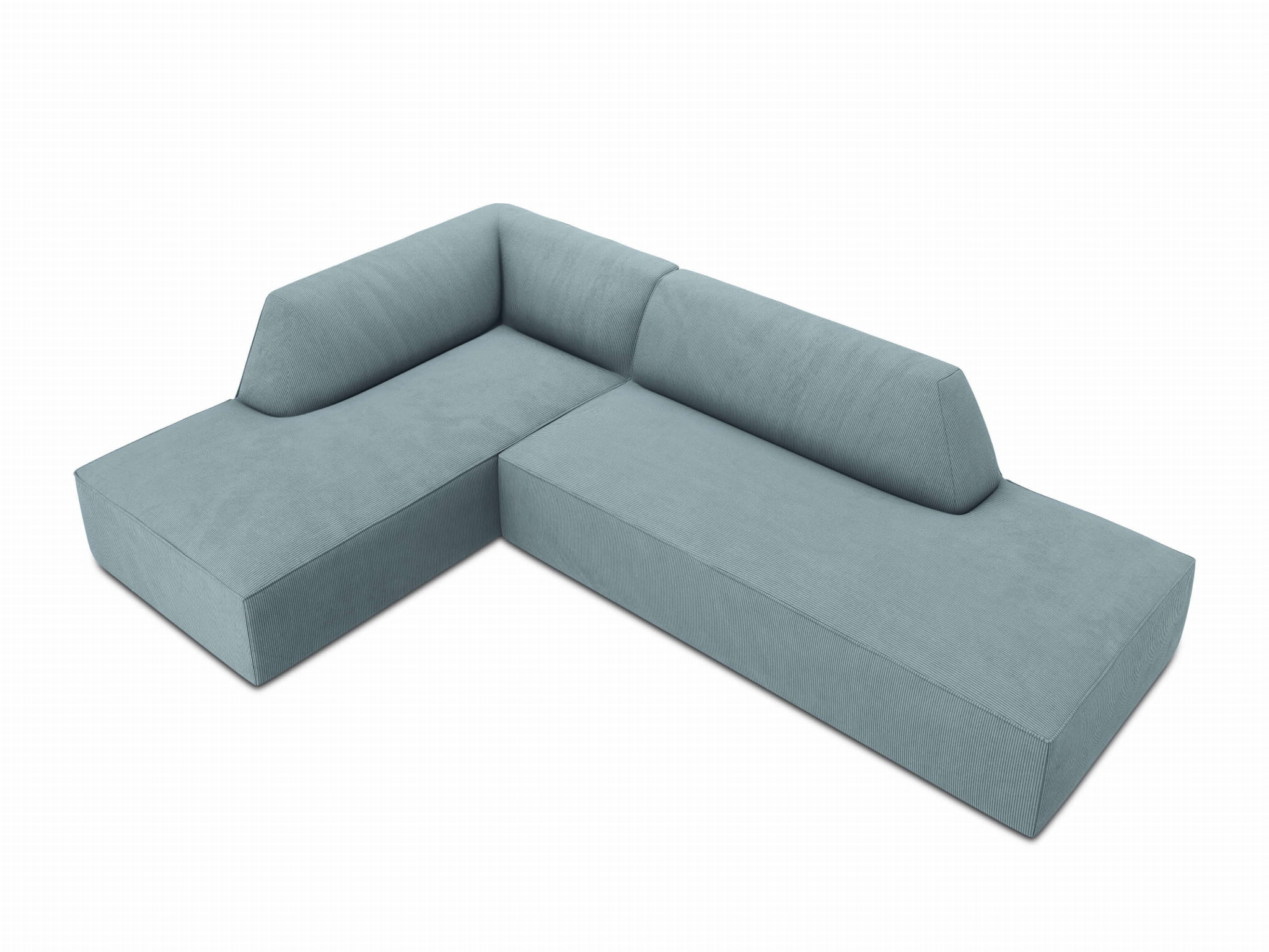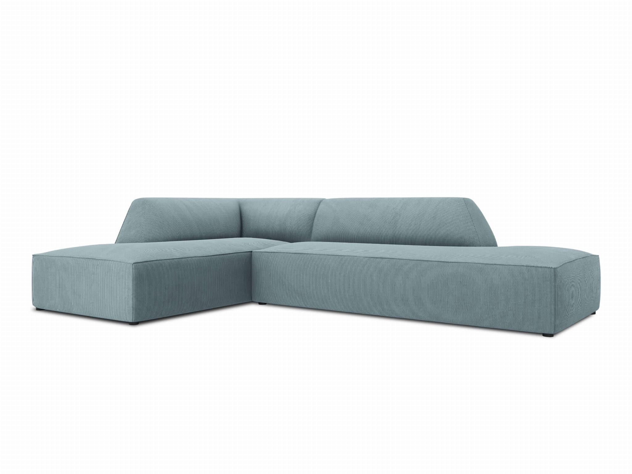 Wygodna, błękitna sofa narożna tapicerowana przytulną sztruksową tkaniną. Kontrastujące z obszernym siedziskiem, niskie oparcie zapewnia optymalny podpór dla ciała i zarazem estetycznie komponuje się z przestrzenią.