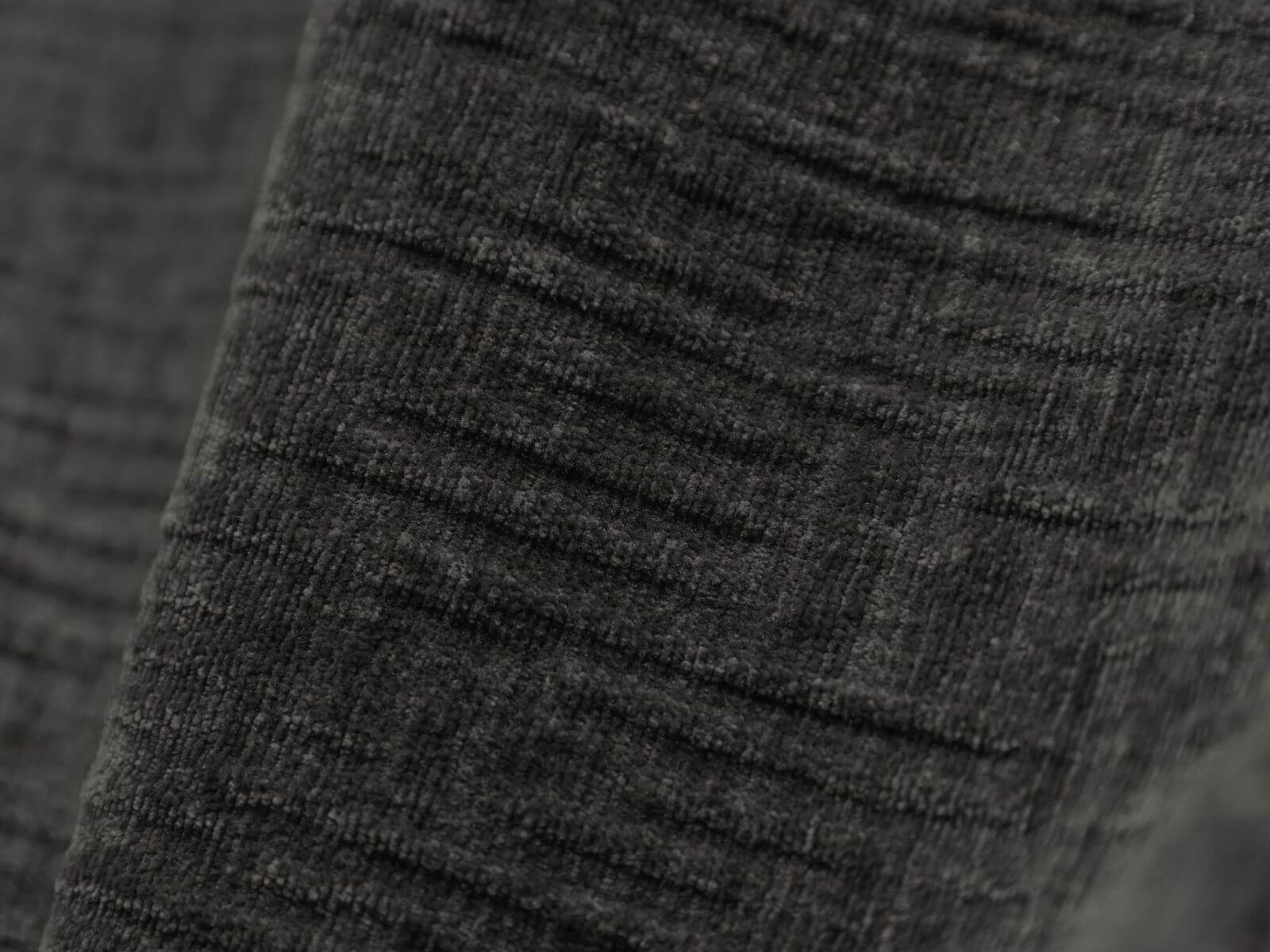 Przytulny narożnik obity jest tkaniną Over The Horizon 57 w ciemno szarym kolorze. Jest to materiał z grupy chenille o interesującej fakturze i efekcie trójwymiarowym. Delikatne włoski różnią się wysokością, tworząc wypukły wzór. Wzór przypomina sztruks, ale paski są drobniejsze i znacznie mniej regularne. Materiał jest miękki i przyjemny w dotyku, o bardzo przytulnym wyglądzie. Kolor tkaniny jest mieszany, melanżowy. Lekko migocząca powierzchnia zmienia się w zależności od kąta padania światła.