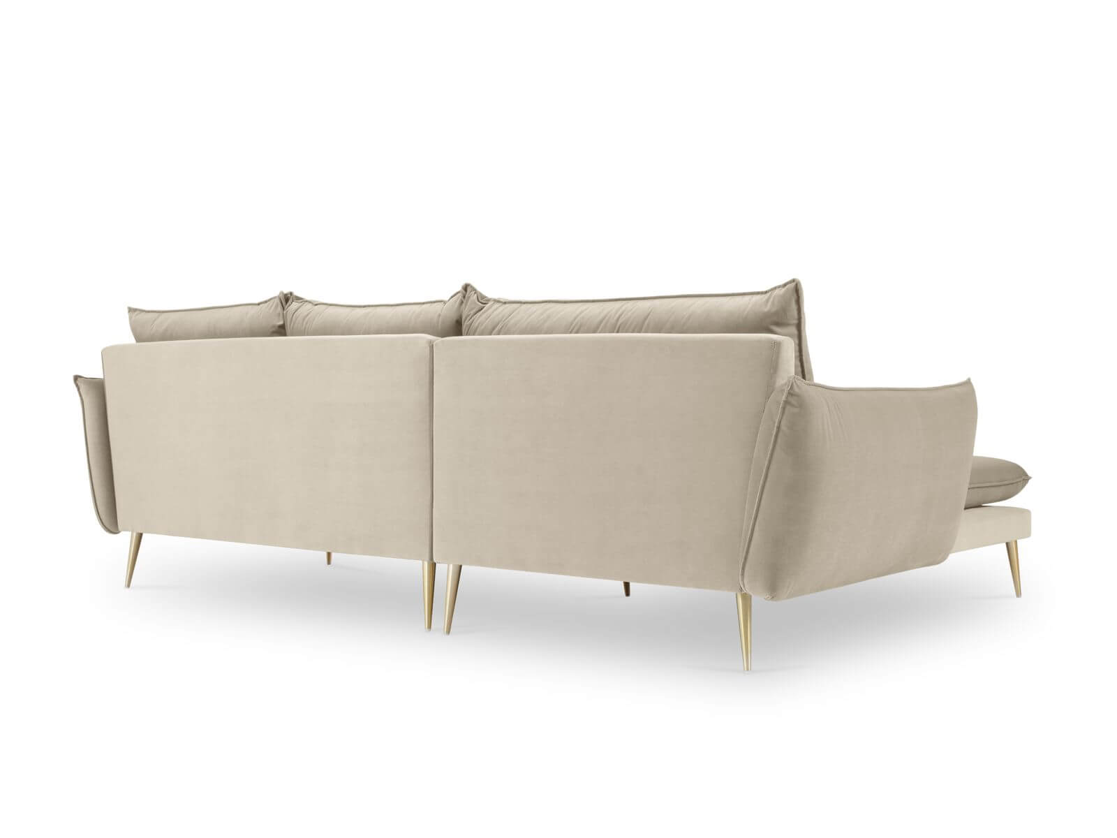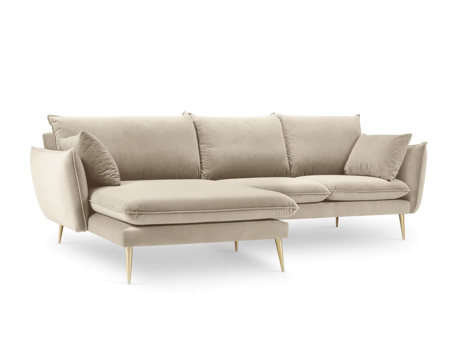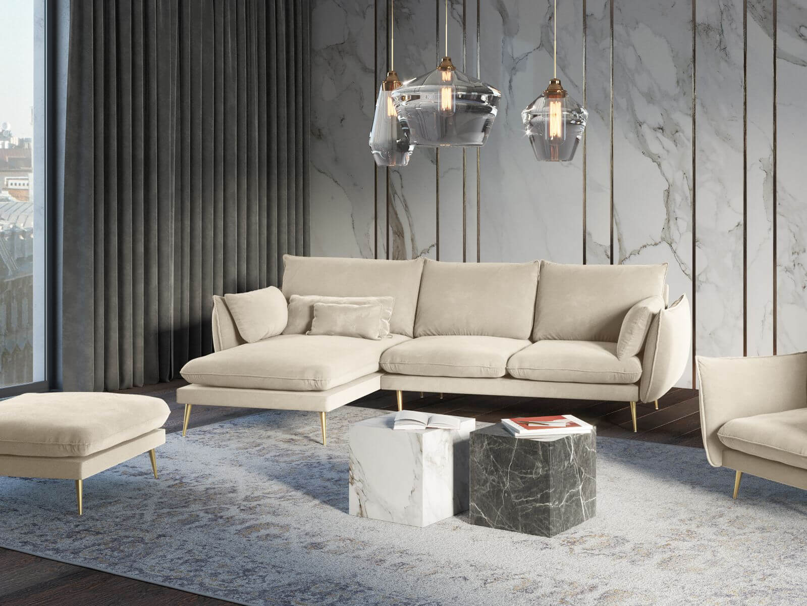 Narożnik w kolorze beżu na złotych nóżkach to trafny wybór do wnętrz w stylu glamour czy modern classic.