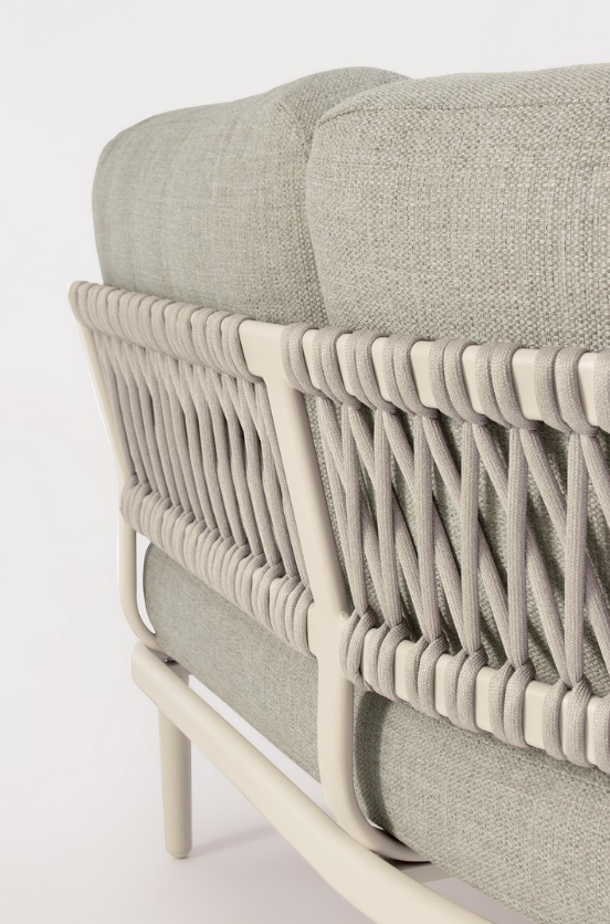 Tył oparć narożnika zdobi estetyczna plecionka z mocnej liny syntetycznej, która idealnie współgra z jasną kolorystyką ramy, nadając całości modnego, rzemieślniczego charakteru. Trwałość i dbałość o detale potwierdza również zastosowanie wysokiej klasy elementów montażowych, takich jak śruby ze stali nierdzewnej, stworzone specjalnie do użytku zewnętrznego.
