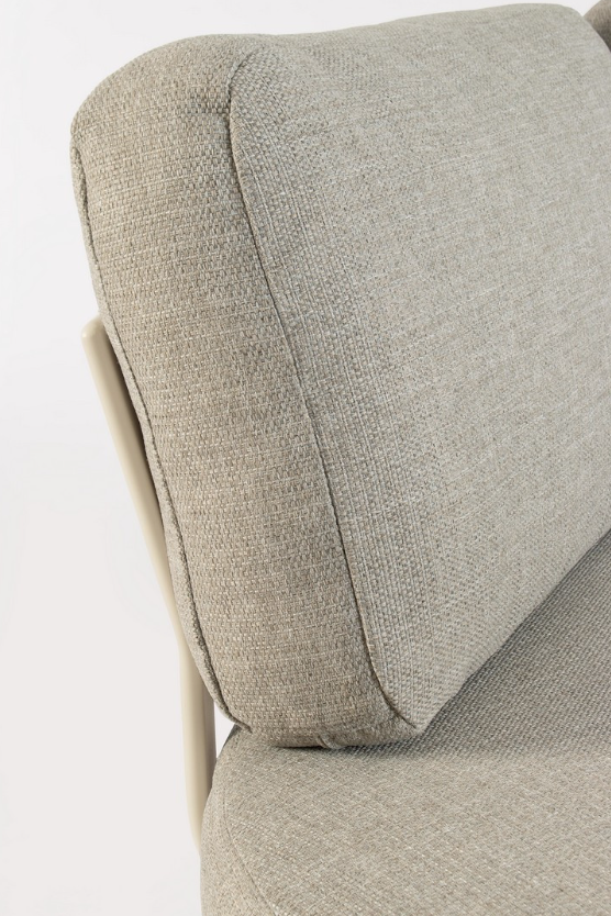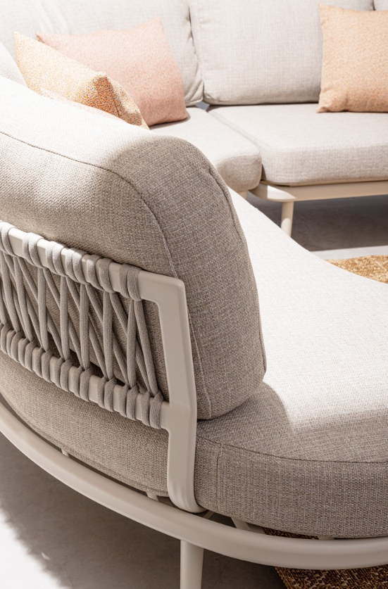 Narożnik ogrodowy Helios to wyjątkowy projekt, który zrywa z klasycznymi, kanciastymi bryłami na rzecz płynnych, półokrągłych linii. Ten innowacyjny, modułowy mebel pozwala na stworzenie niezwykle intymnej strefy relaksu, sprzyjającej rozmowom w większym gronie. Stelaż wykonano z aluminium malowanego proszkowo w subtelnym, piaskowym odcieniu. Gwarantuje to konstrukcji całkowitą odporność na rdzę oraz zmienne warunki atmosferyczne, zachowując przy tym wizualną lekkość.