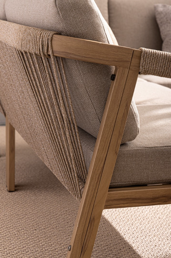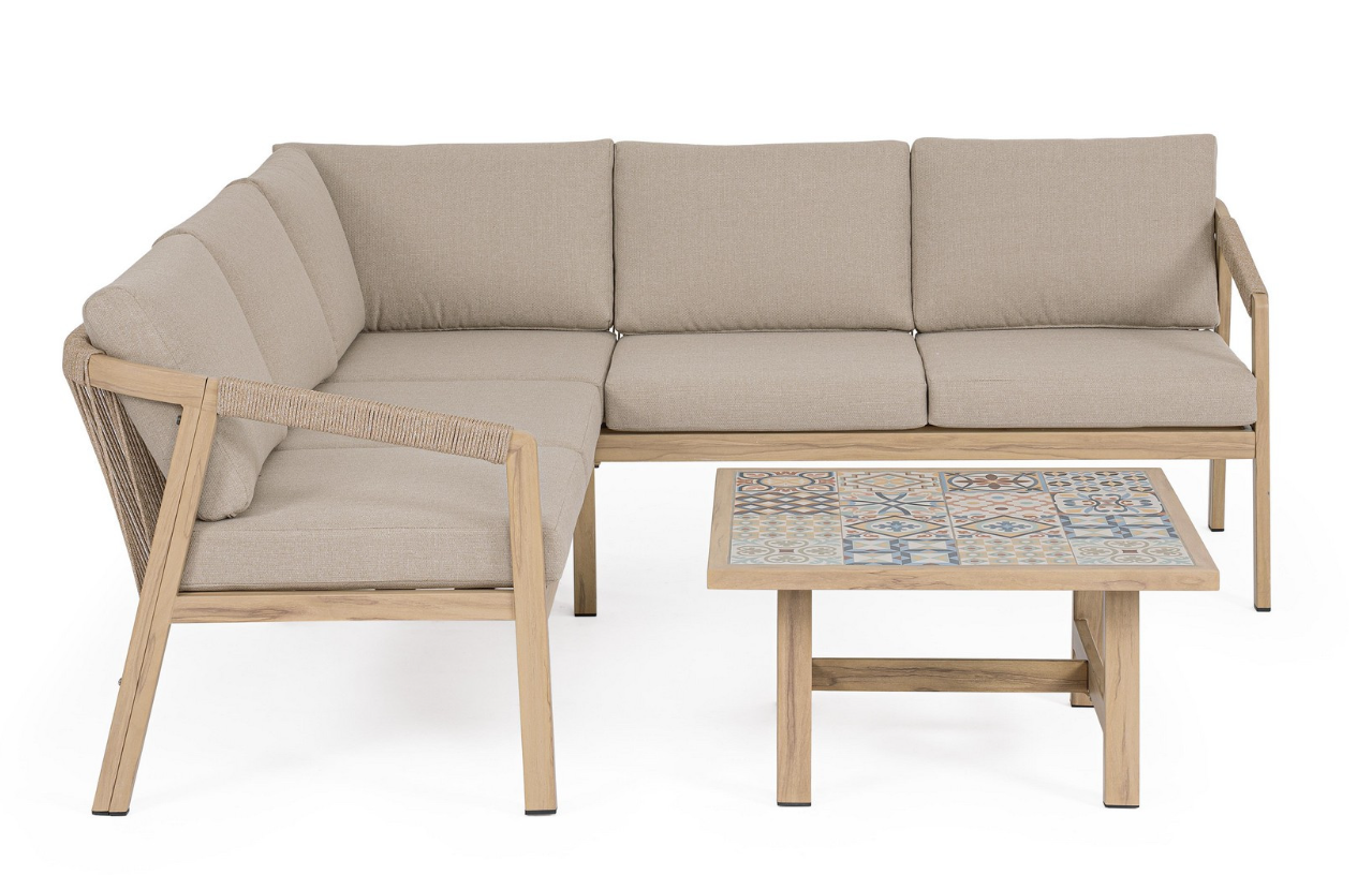 Narożny zestaw wypoczynkowy Kalimera to luksusowa propozycja od włoskiej marki Bizzotto, stworzona z myślą o miłośnikach ponadczasowego designu inspirowanego barwami ziemi. Solidna konstrukcja została wykonana z aluminium malowanego proszkowo w naturalnym odcieniu. Innowacyjne wykończenie ramy łączy wizualną lekkość i ciepło z bezkompromisową trwałością metalu, gwarantując pełną odporność na korozję i wpływ zmiennych warunków atmosferycznych.