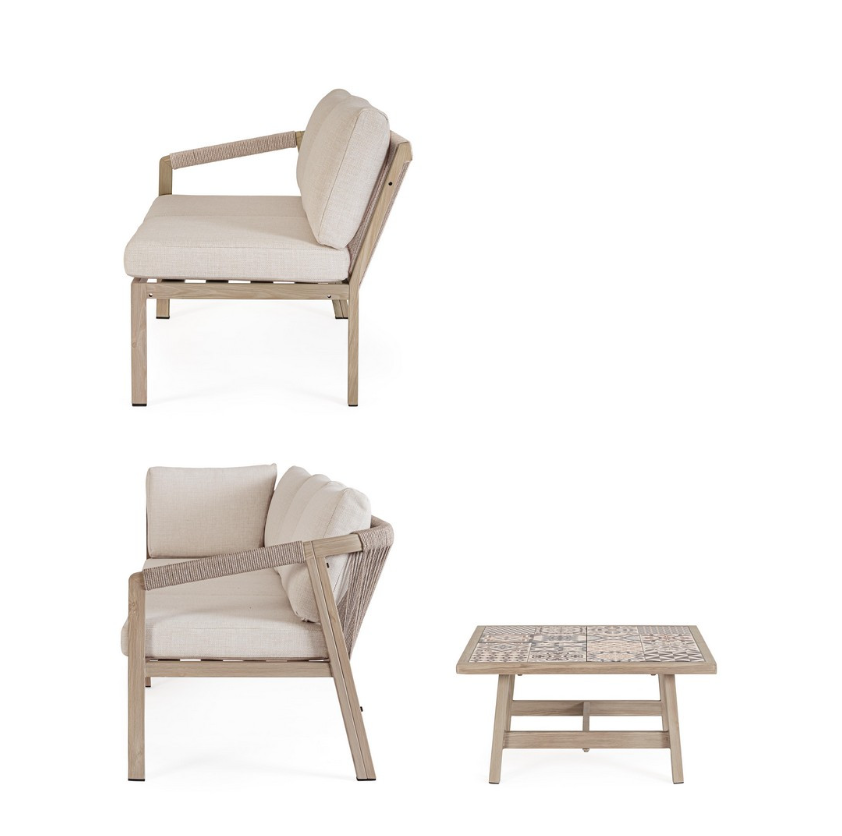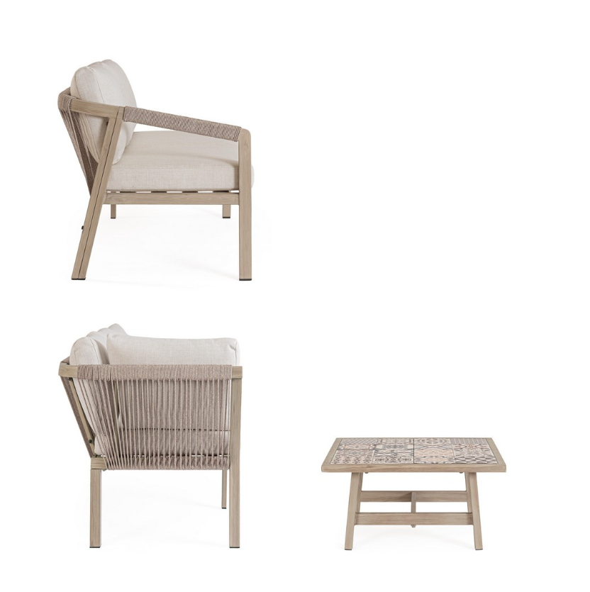 Zestaw wyróżnia się unikalnymi detalami, które nadają mu rzemieślniczego charakteru. Kwadratowy stolik kawowy posiada blat wyłożony oryginalnymi, hiszpańskimi płytkami porcelanowymi o pięknym, wzorzystym szkliwieniu, co stanowi stylowy i trwały punkt centralny strefy relaksu. Oparcia oraz podłokietniki narożnika ozdobiono gęstą plecionką z okrągłej liny poliestrowej, nadającą bryle wizualnej lekkości. Za najwyższy komfort odpowiadają grube, miękkie poduszki obszyte wysokiej klasy wodoodporną tkanrawą Olefin. Materiał ten jest wysoce odporny na wilgoć oraz promieniowanie UV, a możliwość zdjęcia pokrowców znacznie ułatwia pielęgnację.
