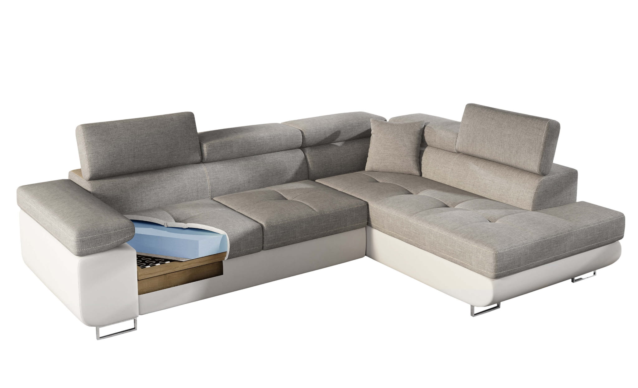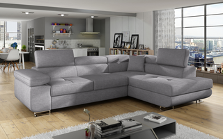 Zaletą narożnika jest jego funkcja spania dostępna w systemie rozkładania typu delfin. Powierzchnia łóżka to 125x193 cm. Dodatkowym atutem jest także pojemny schowek na pościel umieszczony w sofie.