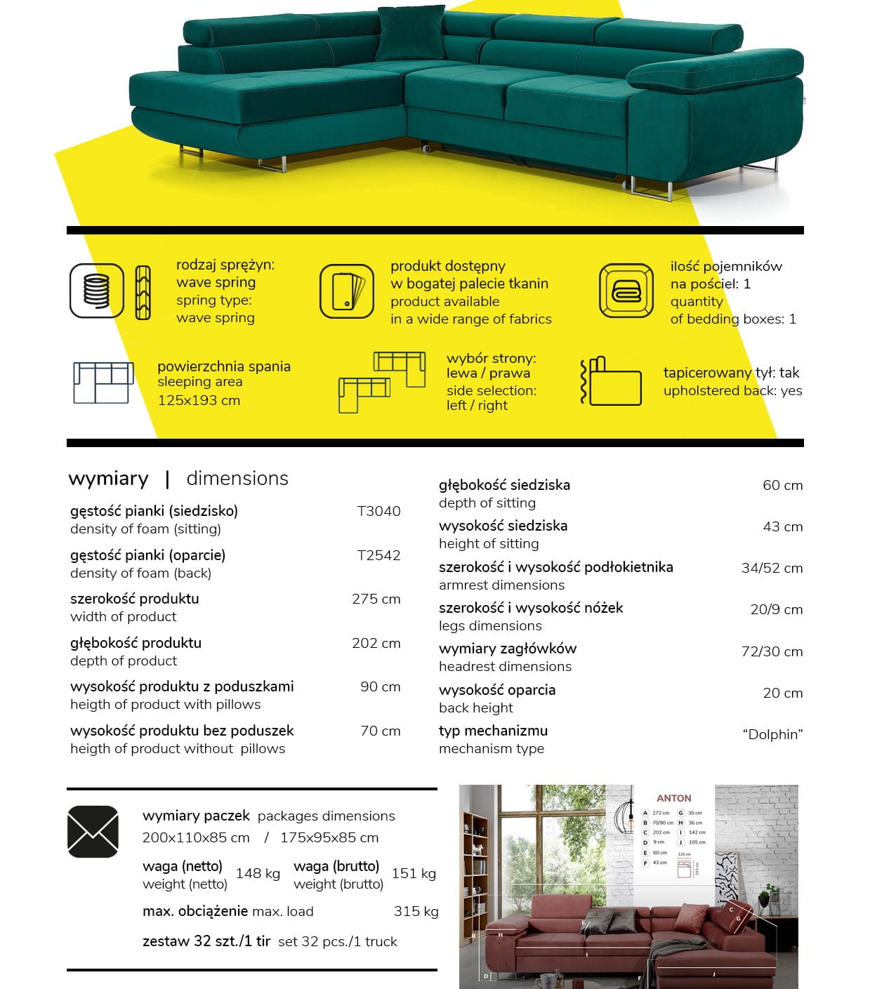 Wysokość z poduszkami: 90 cm