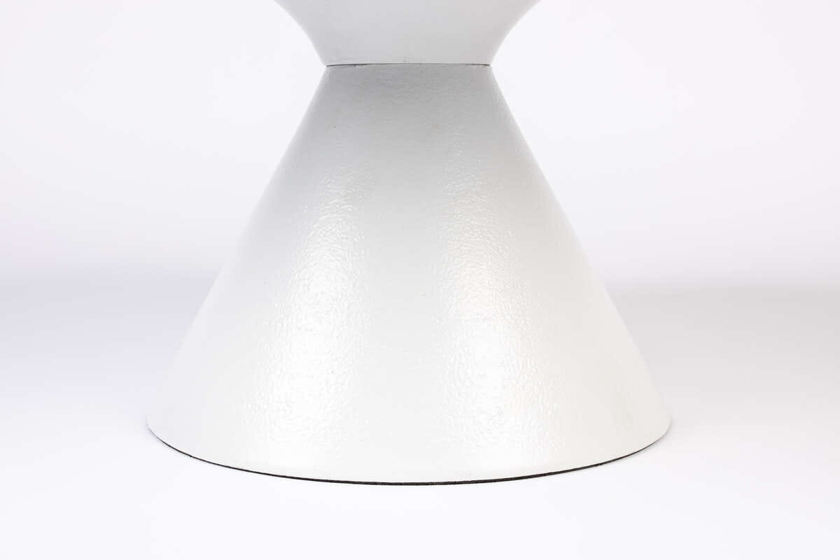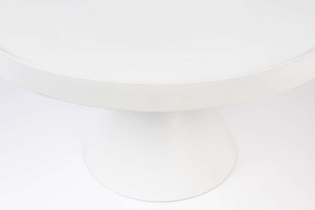 Całość wykonana została z odlewu aluminiowego malowanego proszkowo w kolorze białym, dzięki czemu stolik posiada wytrzymałą powłokę, która zapewnia odporność na korozję i zarysowania, a także daje doskonały wygląd i kolor. Posiada jedwabisty połysk, który doskonale podkreśla jego wyjątkowy design o kompaktowej formie. Podwyższona krawędź blatu skutecznie blokuje wszelkie rozlania płynów.