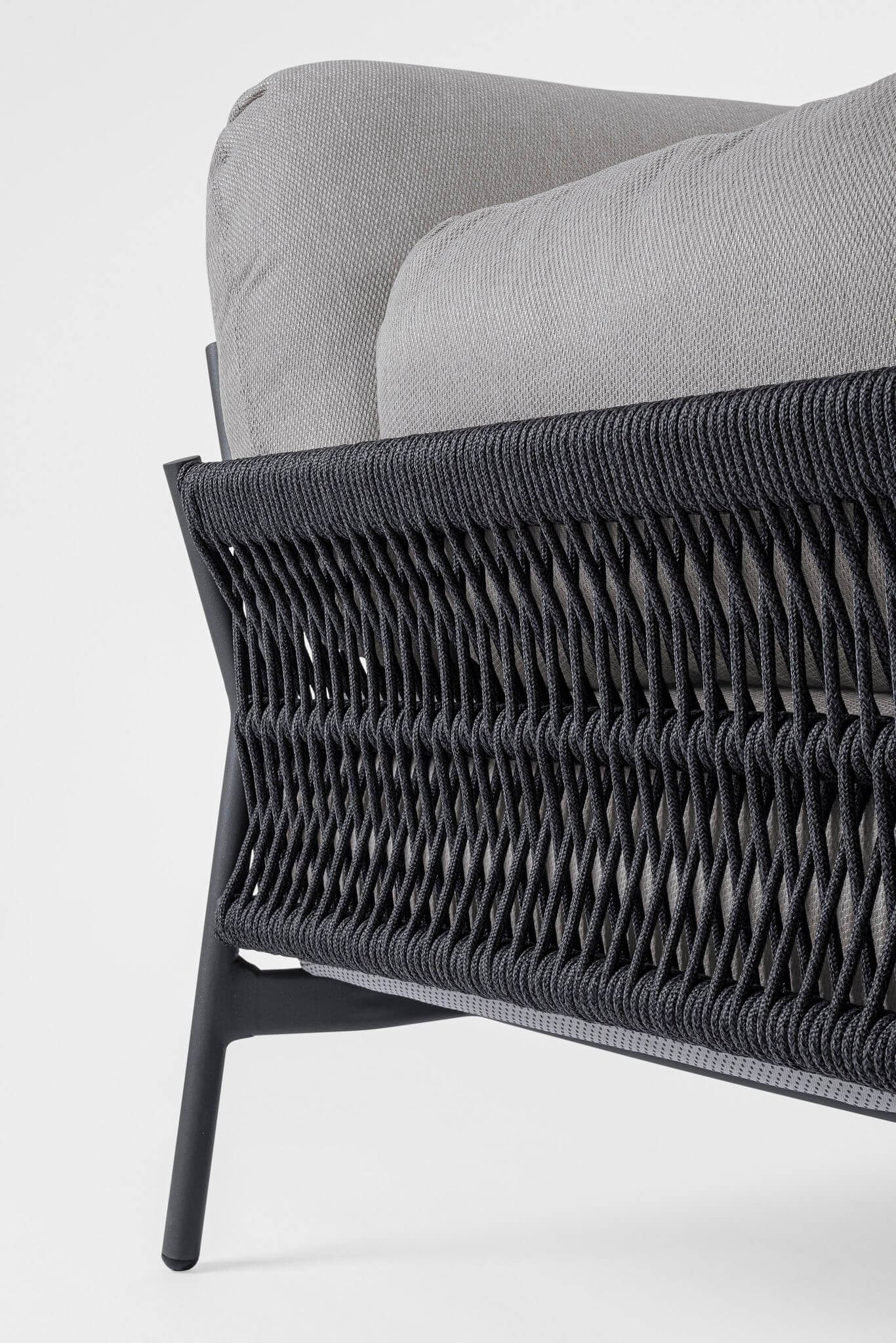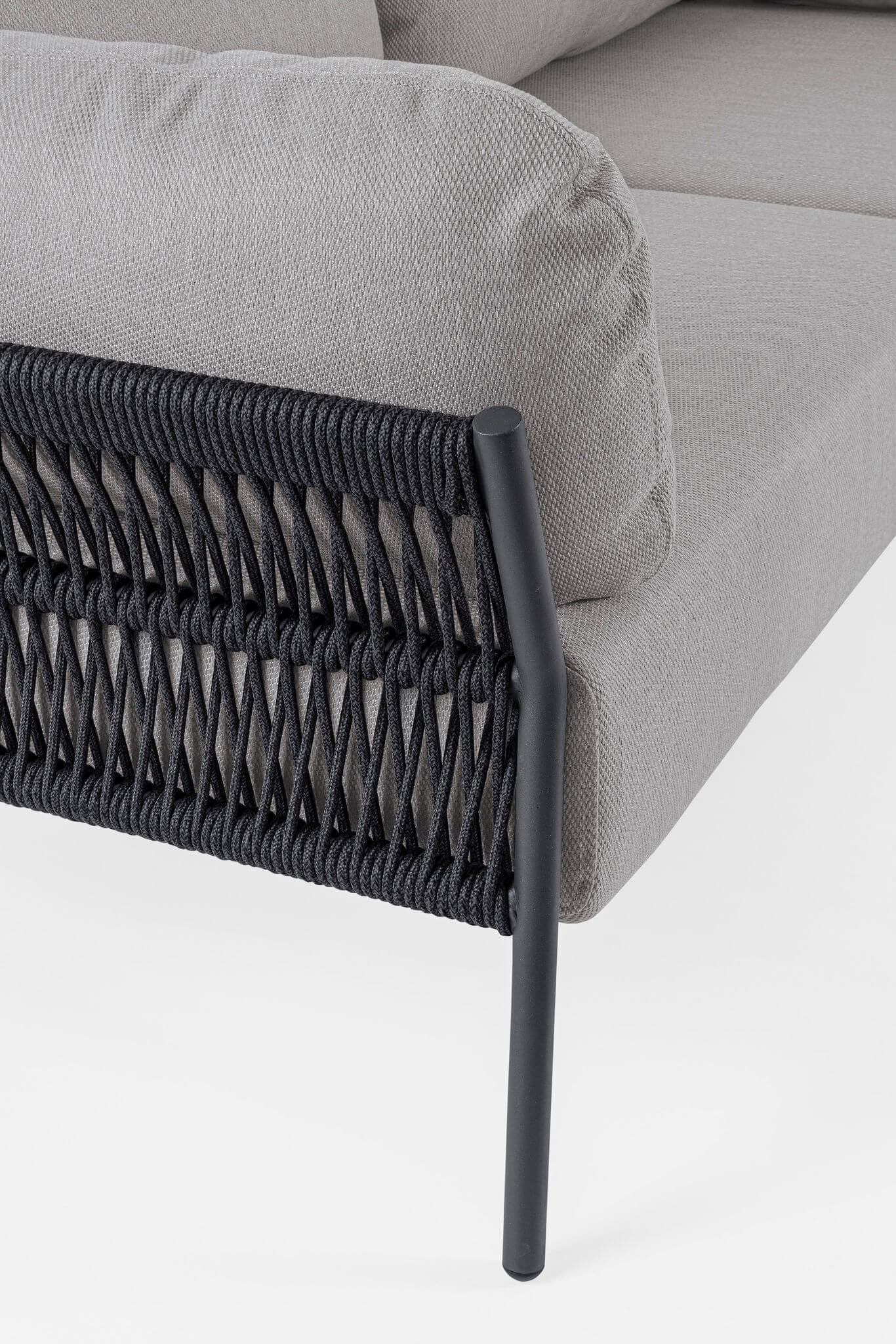 Oryginalne oparcie oraz boki sofy ogrodowej charakteryzują się gustowną dekoracyjnością - wykonane są z przeplatanych sznurków z tkaniny olefinowej.