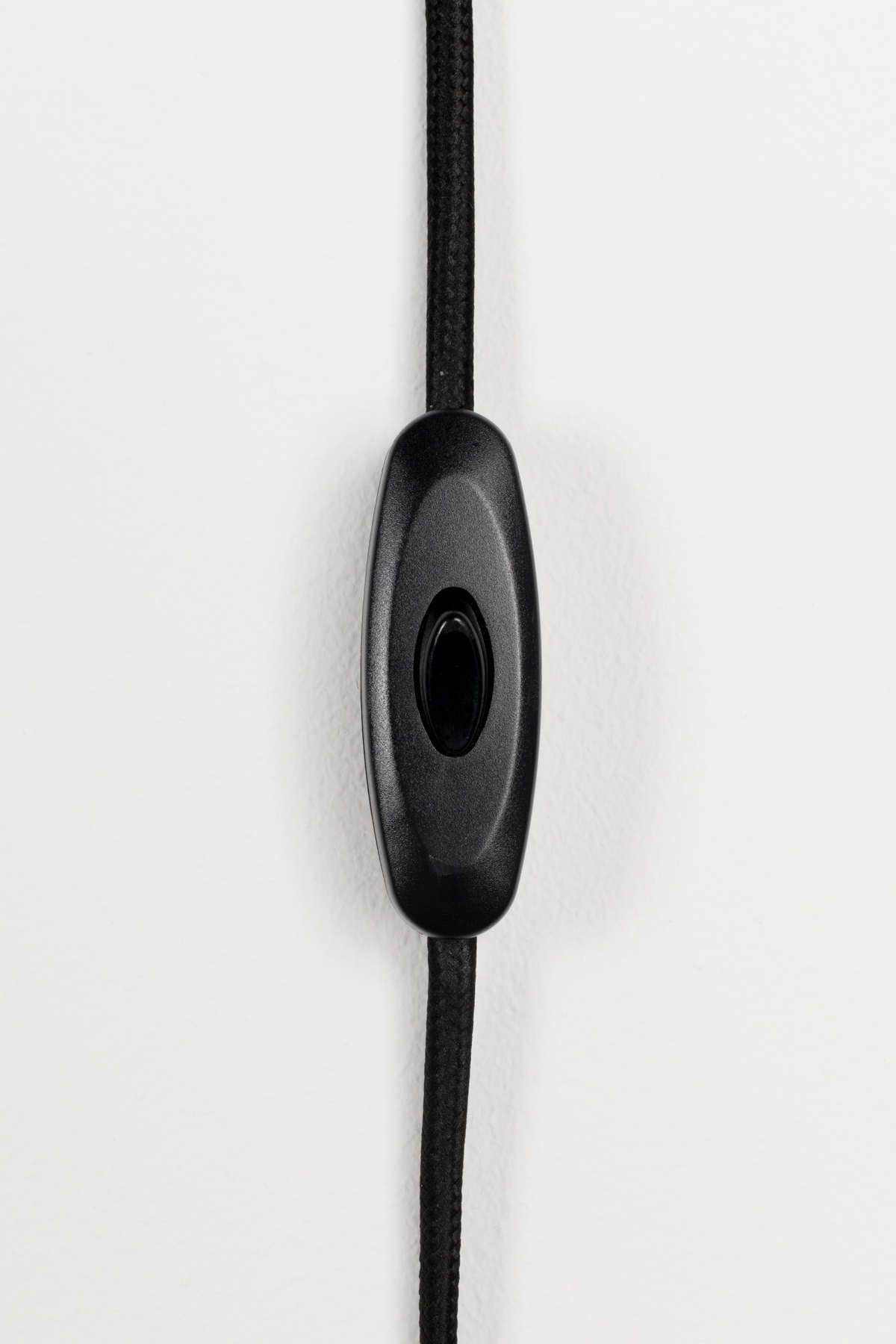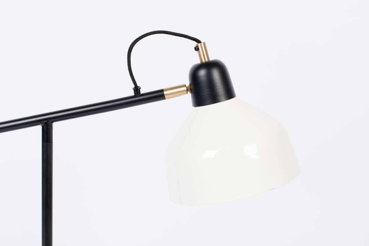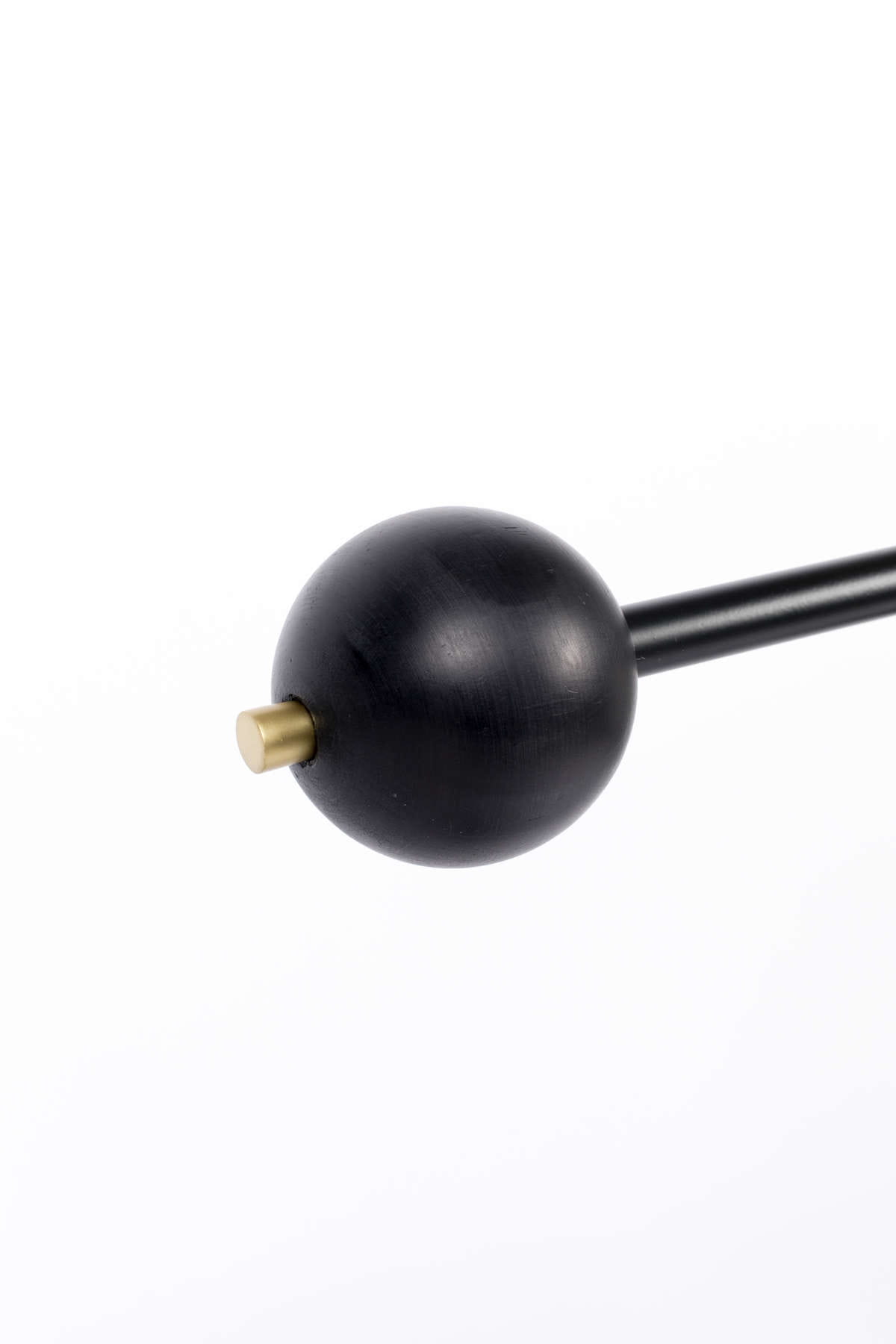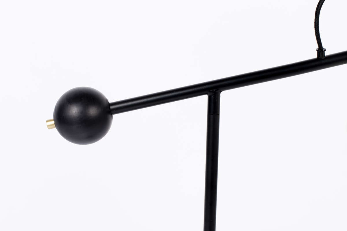 Lampa posiada nieruchome ramię wystające poza główną oś podstawy, zakończone drewnianą kulą w czarnym kolorze. Kula wydaje się działać jak przeciwwaga dla metalowego klosza. Drobne, złote elementy nadają lampie eleganckiego charakteru, przełamując standardowe odcienie czerni i bieli.