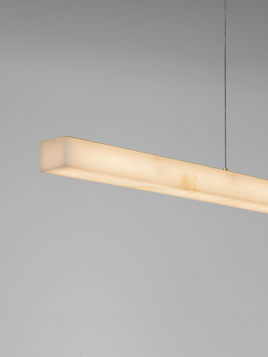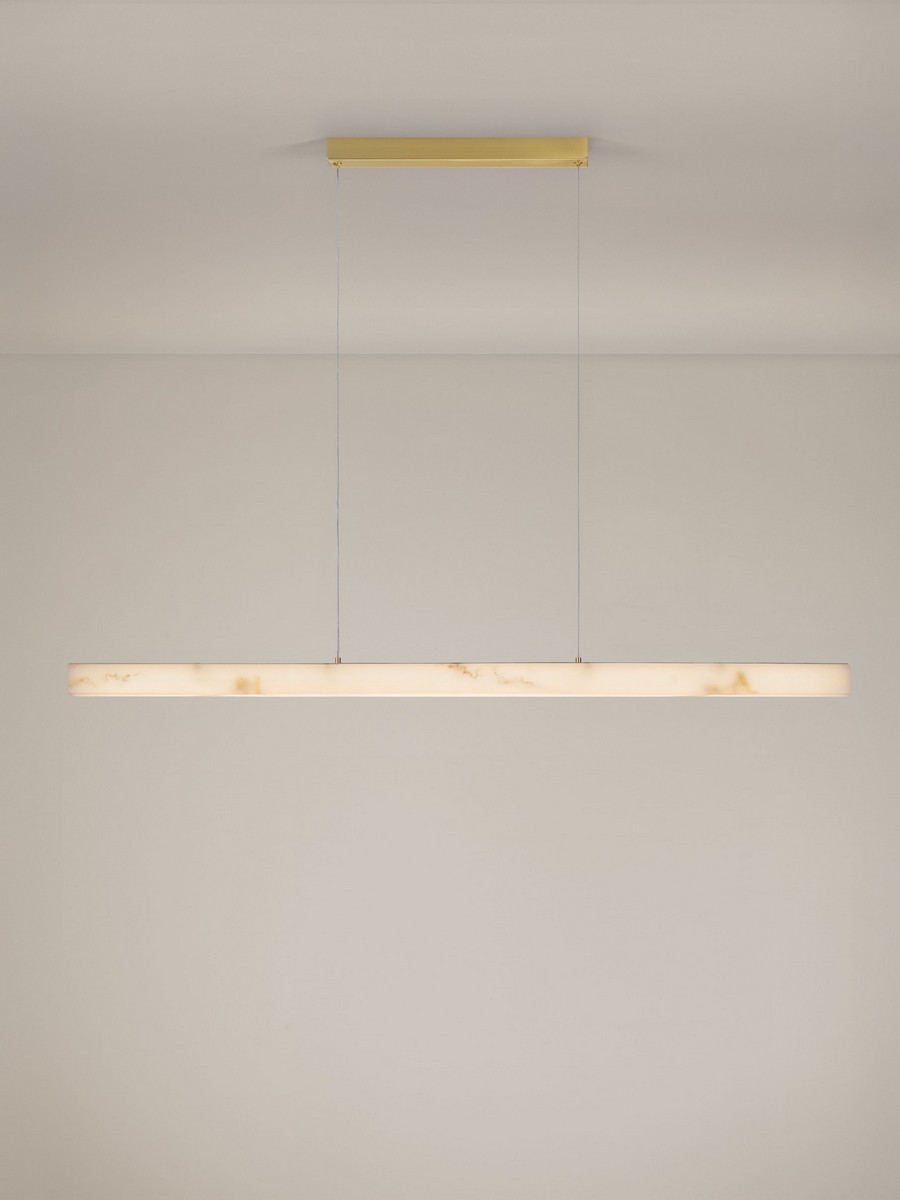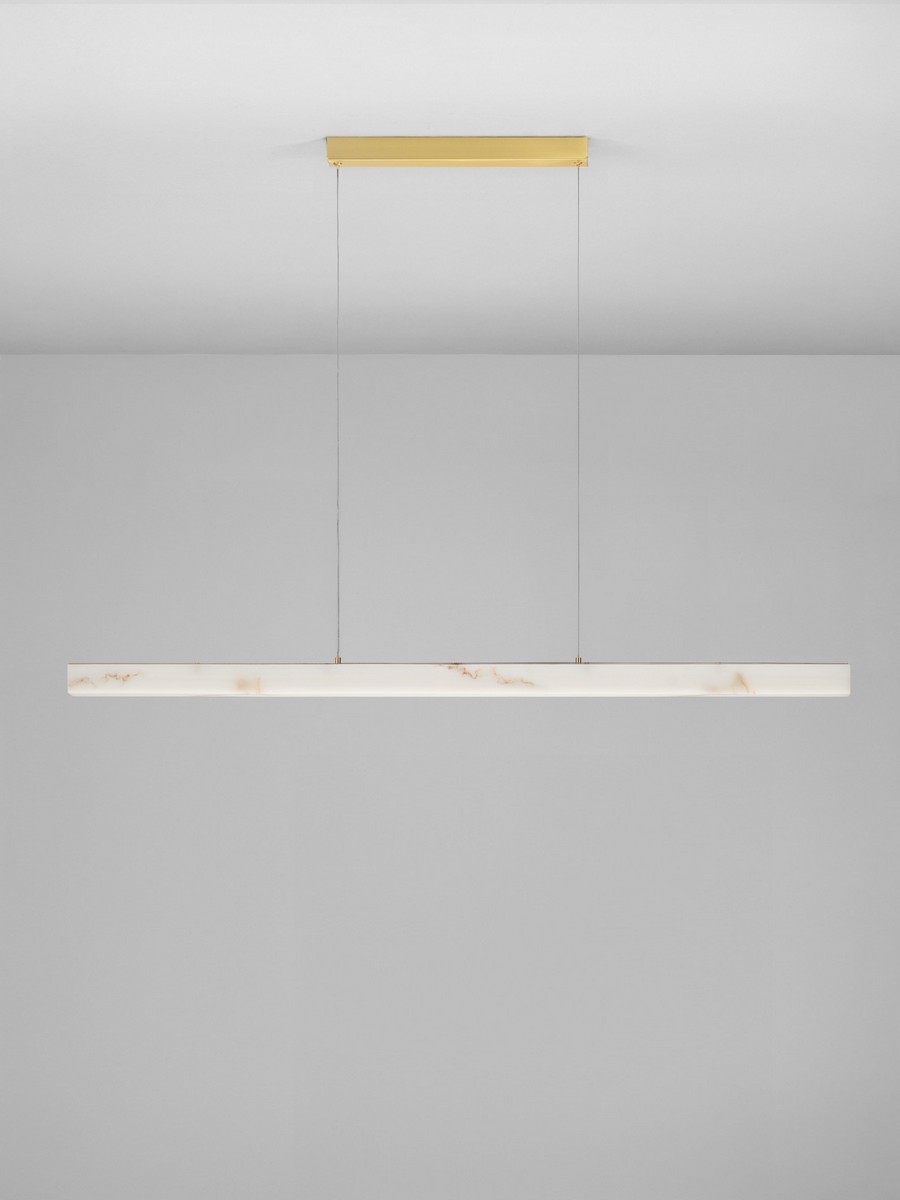 Lampa wisząca Lanzarote od marki Nova Luce to połączenie surowej, liniowej formy z luksusowym wykończeniem. Jej smukła bryła o długości 120 cm przyciąga wzrok kloszem o unikalnej strukturze imitującej naturalny kamień. Elementy mocujące oraz podsufitka w kolorze mosiężnego złota dodają oprawie szlachetności, sprawiając, że lampa staje się biżuteryjnym dopełnieniem nowoczesnego wnętrza.