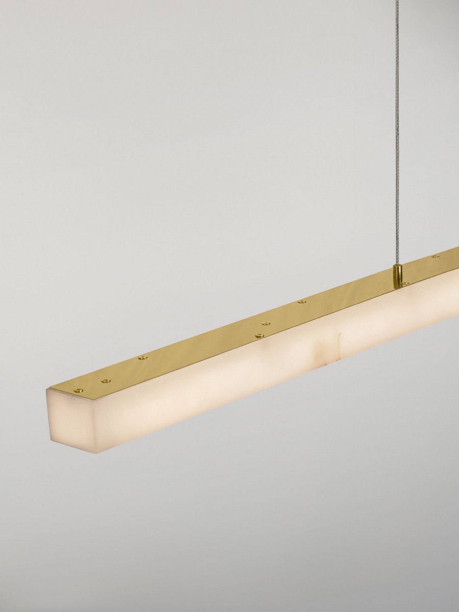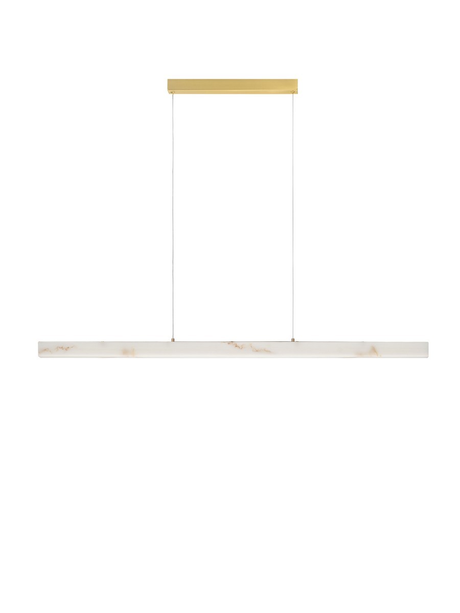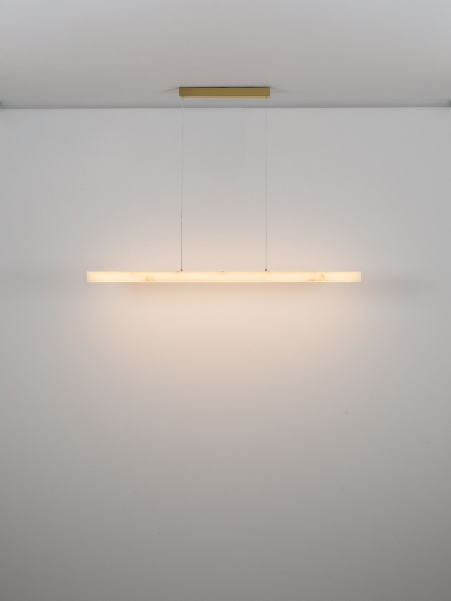 Lampa wisząca Lanzarote od marki Nova Luce to połączenie surowej, liniowej formy z luksusowym wykończeniem. Jej smukła bryła o długości 120 cm przyciąga wzrok kloszem o unikalnej strukturze imitującej naturalny kamień. Elementy mocujące oraz podsufitka w kolorze mosiężnego złota dodają oprawie szlachetności, sprawiając, że lampa staje się biżuteryjnym dopełnieniem nowoczesnego wnętrza.