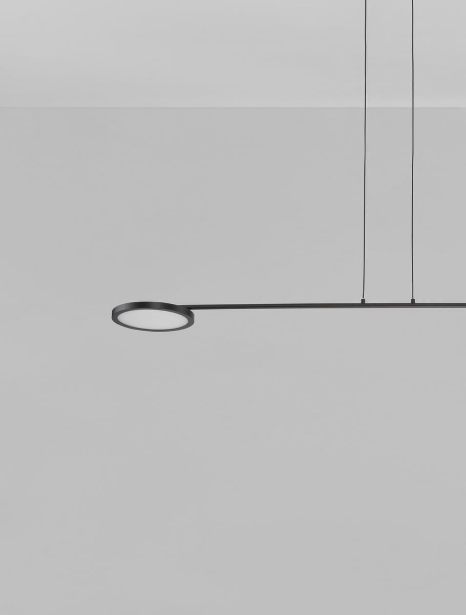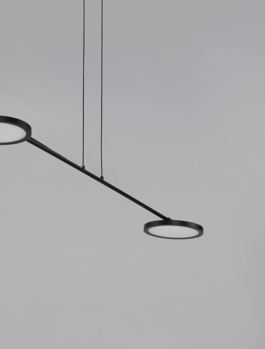 Lampa wisząc Abot wykonana została z metalu i ma formę prostej, czarnej rury, zakończonej z obu stron płaskimi, ledowymi kloszami. Klosze przypominają spłaszczone dyski i od spodu pokryte zostały trwałym akrylem, tworząc solidne wykończenie. Całość zawieszono na dwóch, cienkich linkach wychodzących z okrągłej podsufitki, również w czarnym odcieniu