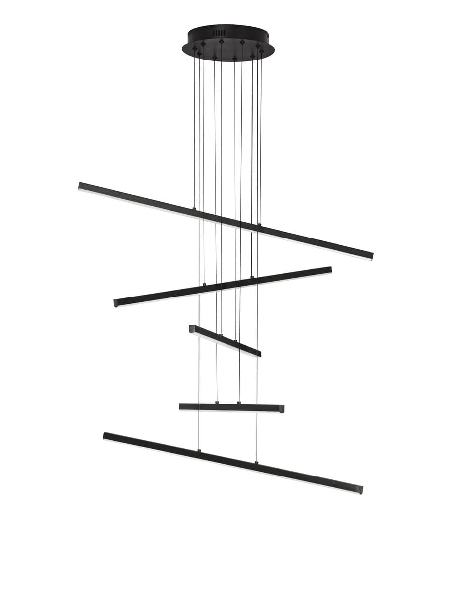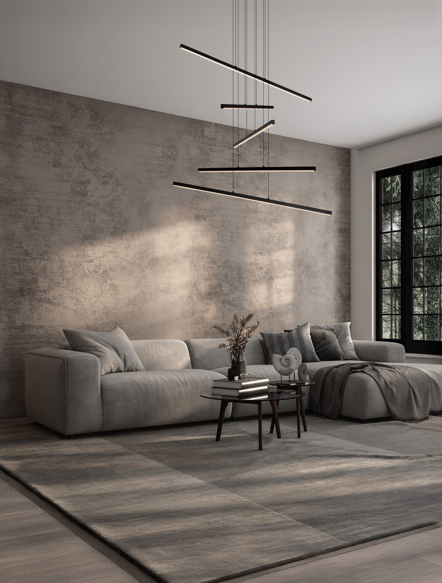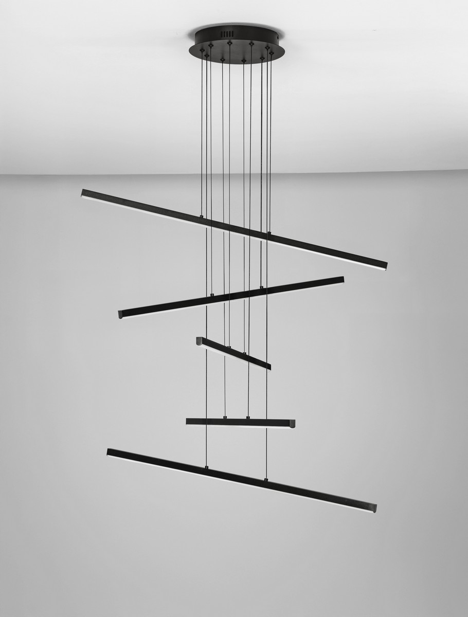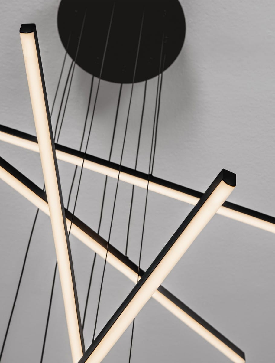 Elementy o różnej długości zostały rozmieszczone pod rozmaitymi kątami, co buduje wrażenie lekkości, przestrzeni i ruchu. Dzięki takiemu układowi lampa prezentuje się niezwykle dynamicznie, doskonale wpisując się w nowoczesne, loftowe oraz minimalistyczne wnętrza.