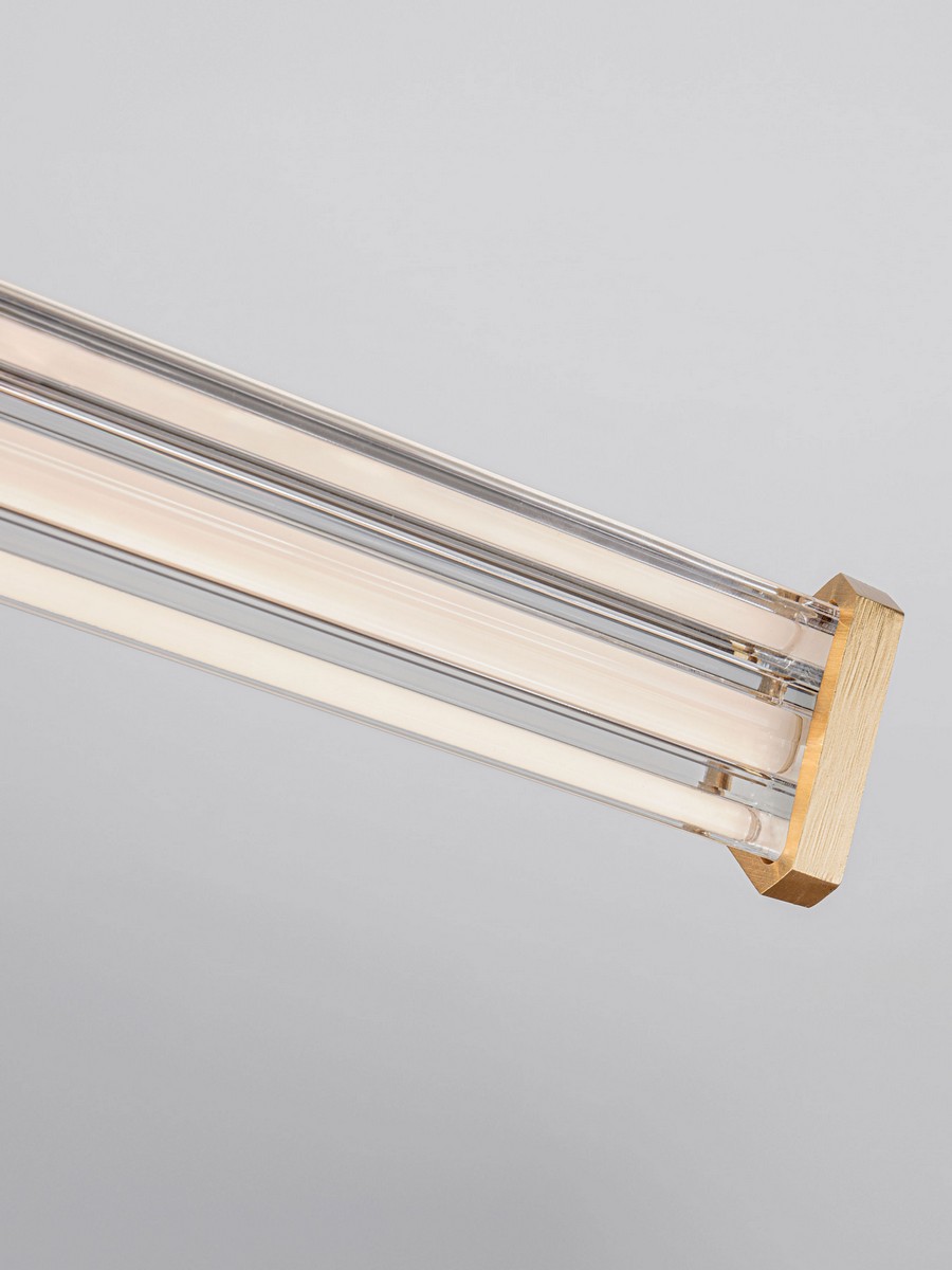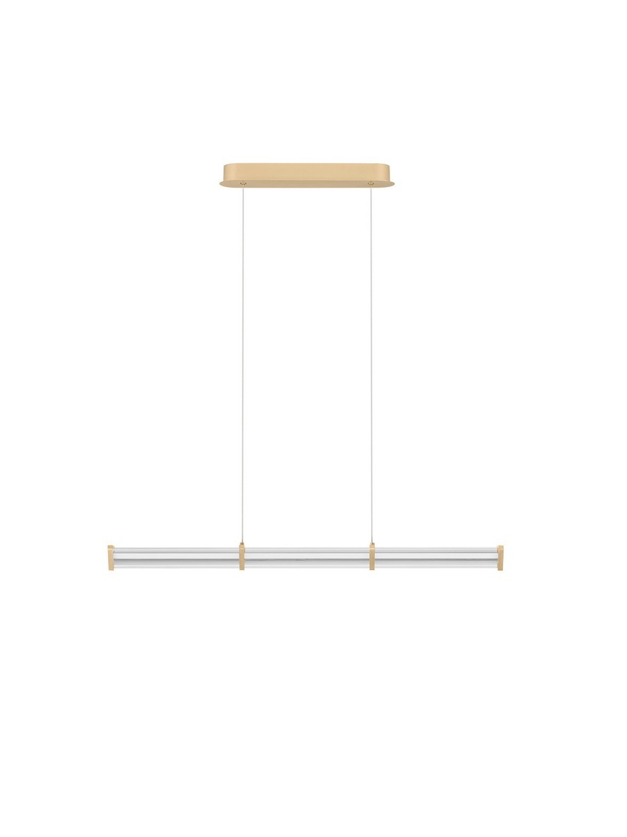 Lampa wisząca Conil to elegancka oprawa o szerokości 88 cm, która idealnie łączy nowoczesną technologię LED z wyrafinowaną estetyką. Jej znakiem rozpoznawczym jest podłużny, transparentny klosz o unikalnym, trójkątnym przekroju i wyraźnej, geometrycznej strukturze. Złote zakończenia oraz metalowe detale w odcieniu matowego złota podkreślają luksusowy charakter lampy, tworząc harmonijną całość, która doskonale wpisuje się w minimalistyczną elegancję.