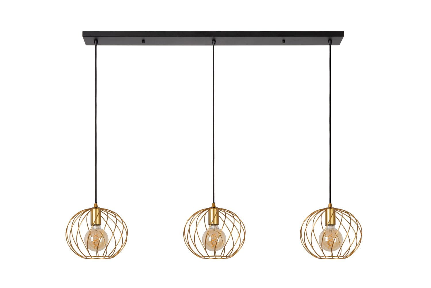 Konstrukcja lampy wykonana została z wysokiej jakości metalu, dzięki czemu jest stabilna i trwała. Całość utrzymuje prostokątna podłużna podsufitka w kolorze czarnym, z której zwisają trzy tekstylne przewody utrzymujące trzy okrągłe złote klosze. Ich liczne otwory bez problemu przepuszczają światło, tworząc przy tym wyjątkowy efekt wizualny. Z użyciem ściemnialnych żarówek w łatwy sposób dostosujemy jasność oświetlenia i stworzymy klimatyczną atmosferę w wybranym wnętrzu. Dzięki regulacji wysokości możemy dowolnie obniżać i podwyższać poziom oświetlenia.
