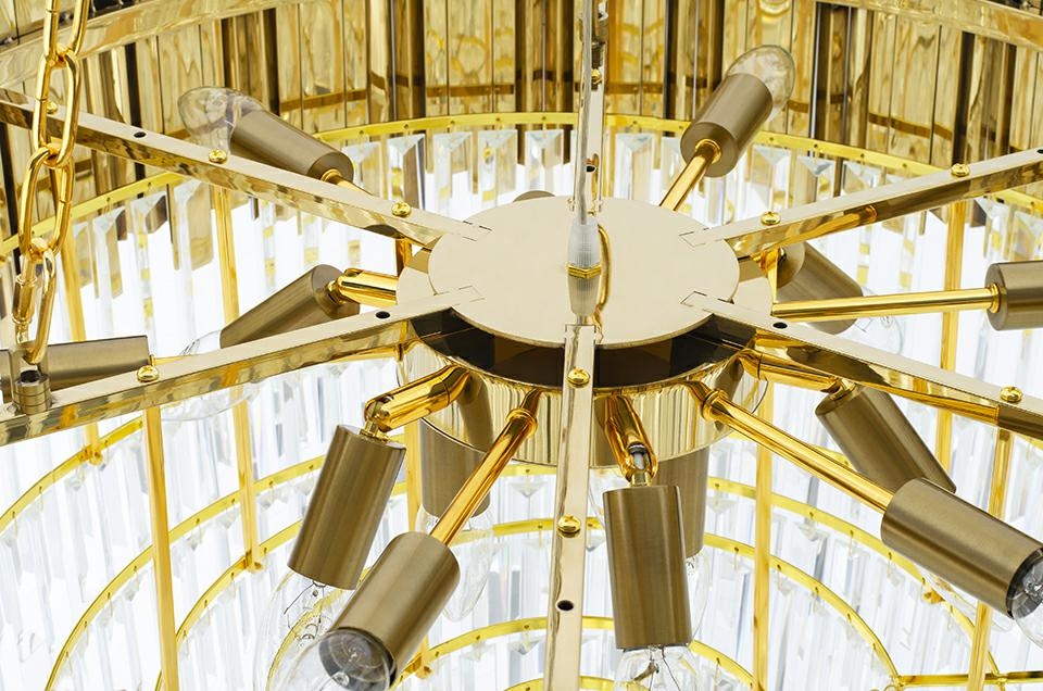 Okrągły kształt lampy oraz zestawienie złotych elementów ze szklanym połyskiem kryształów sprawiają, że Imperial Gold 80 doskonale oświetla przestrzeń, jednocześnie stając się jej centralnym punktem dekoracyjnym.