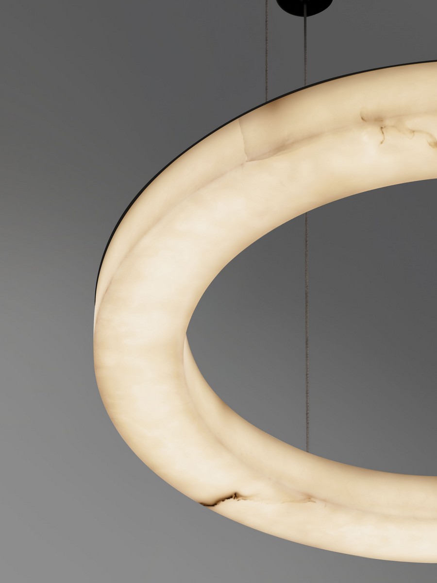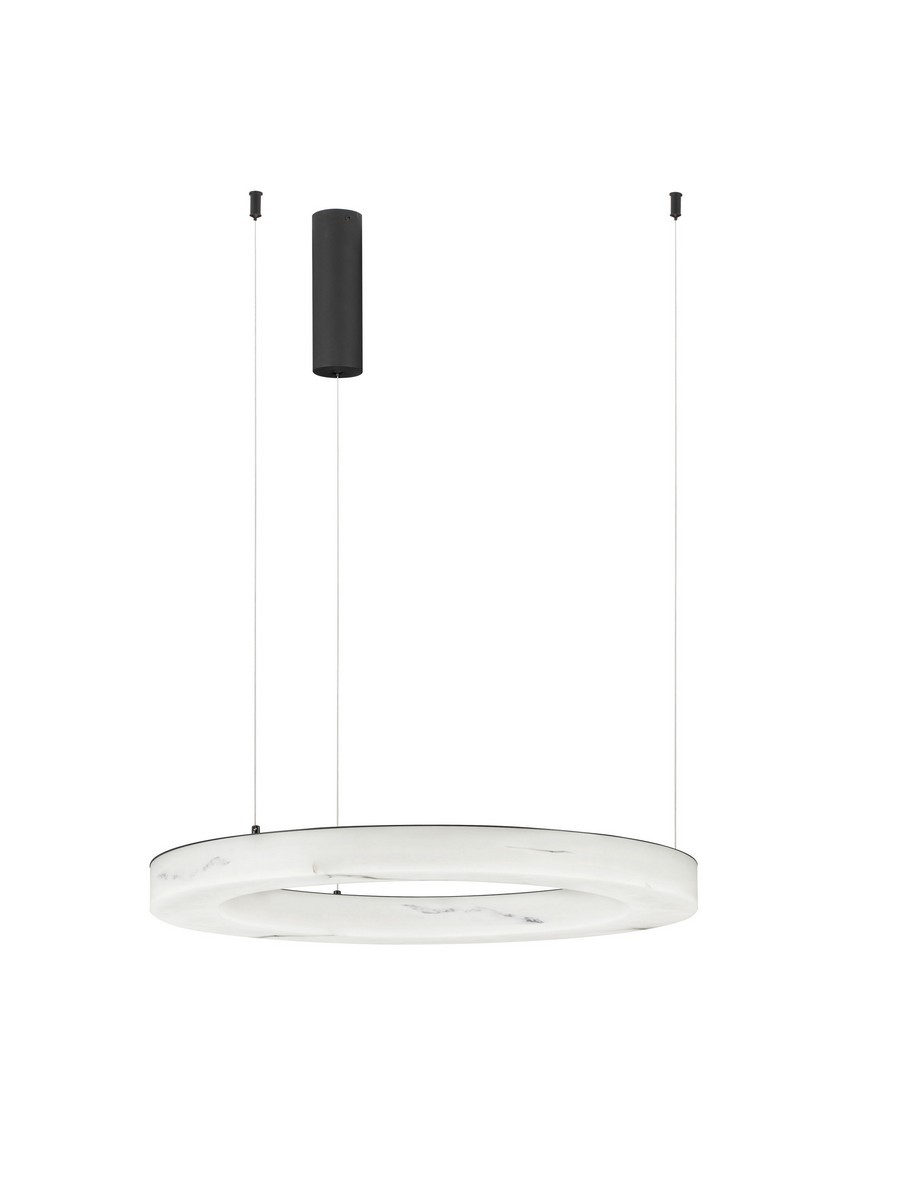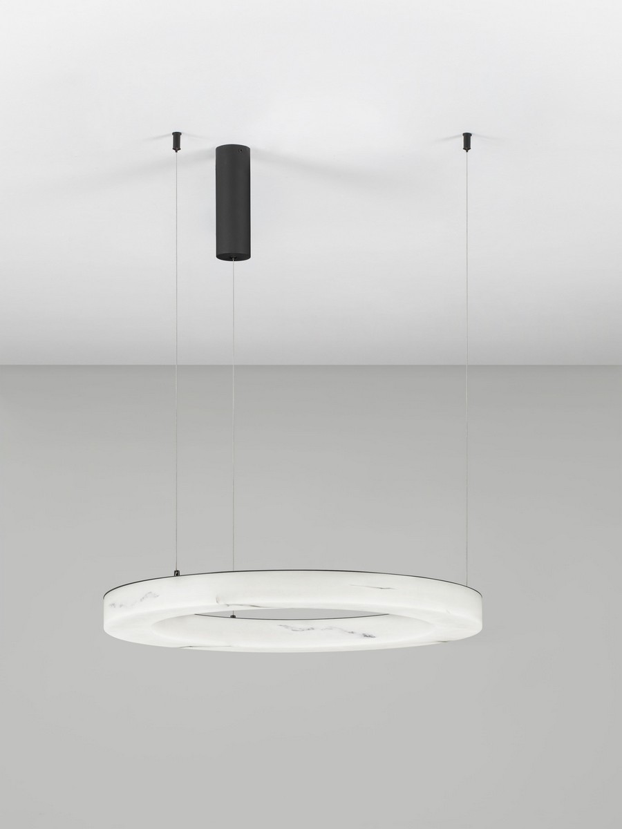 Lampa wisząca Lanzarote od marki Nova Luce to interpretacja klasycznego ringu w nowoczesnym, dekoracyjnym wydaniu. Jej głównym elementem jest szeroki pierścień o średnicy 60 cm, który zachwyca nie tylko formą, ale i unikalną strukturą klosza nawiązującą do naturalnych tekstur. Zawieszona na subtelnych, niemal niewidocznych przewodach, sprawia wrażenie lewitującej w przestrzeni, co nadaje wnętrzu lekkości i luksusowego charakteru.
