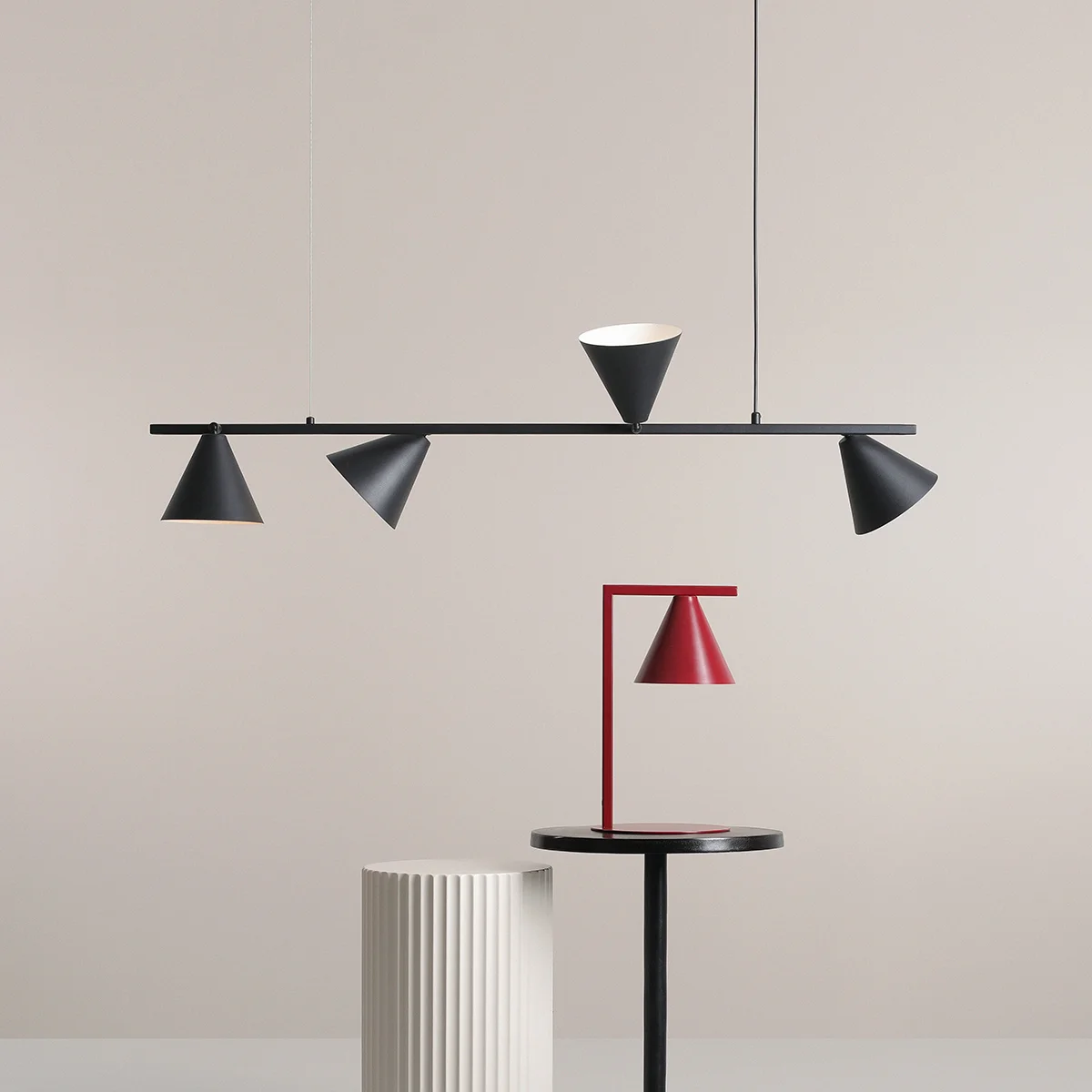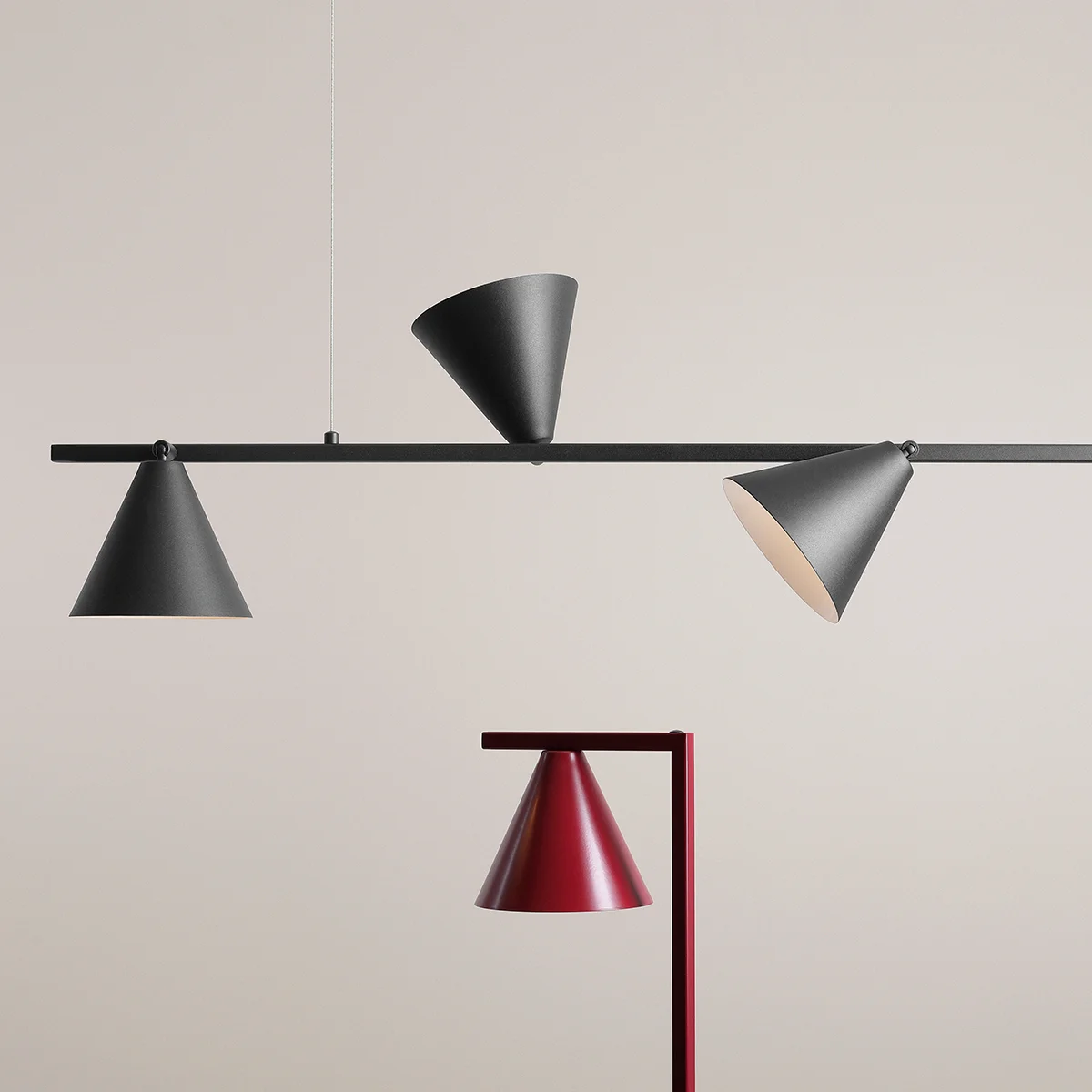 Czarna lampa wisząca Form posiada cztery klosze w kształcie stożków, które można regulować, dostosowując kąt padania światła. Wewnątrz klosze pomalowane są na biało.