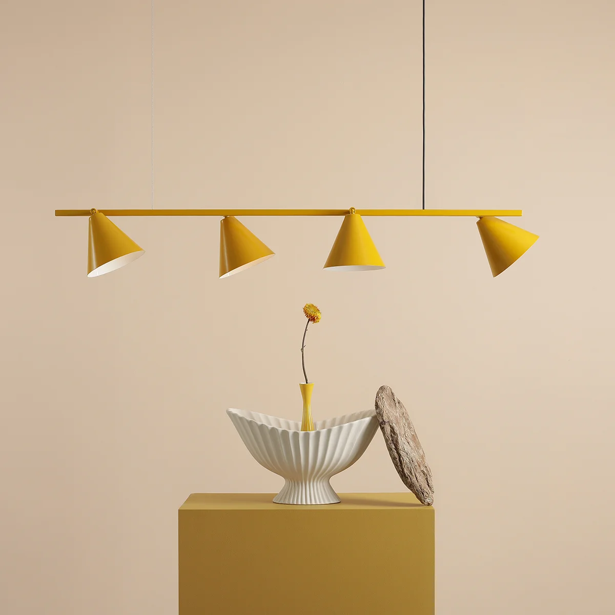Żółta lampa wisząca Form posiada cztery klosze w kształcie stożków, które można regulować, dostosowując kąt padania światła. Wewnątrz klosze pomalowane są na biało.