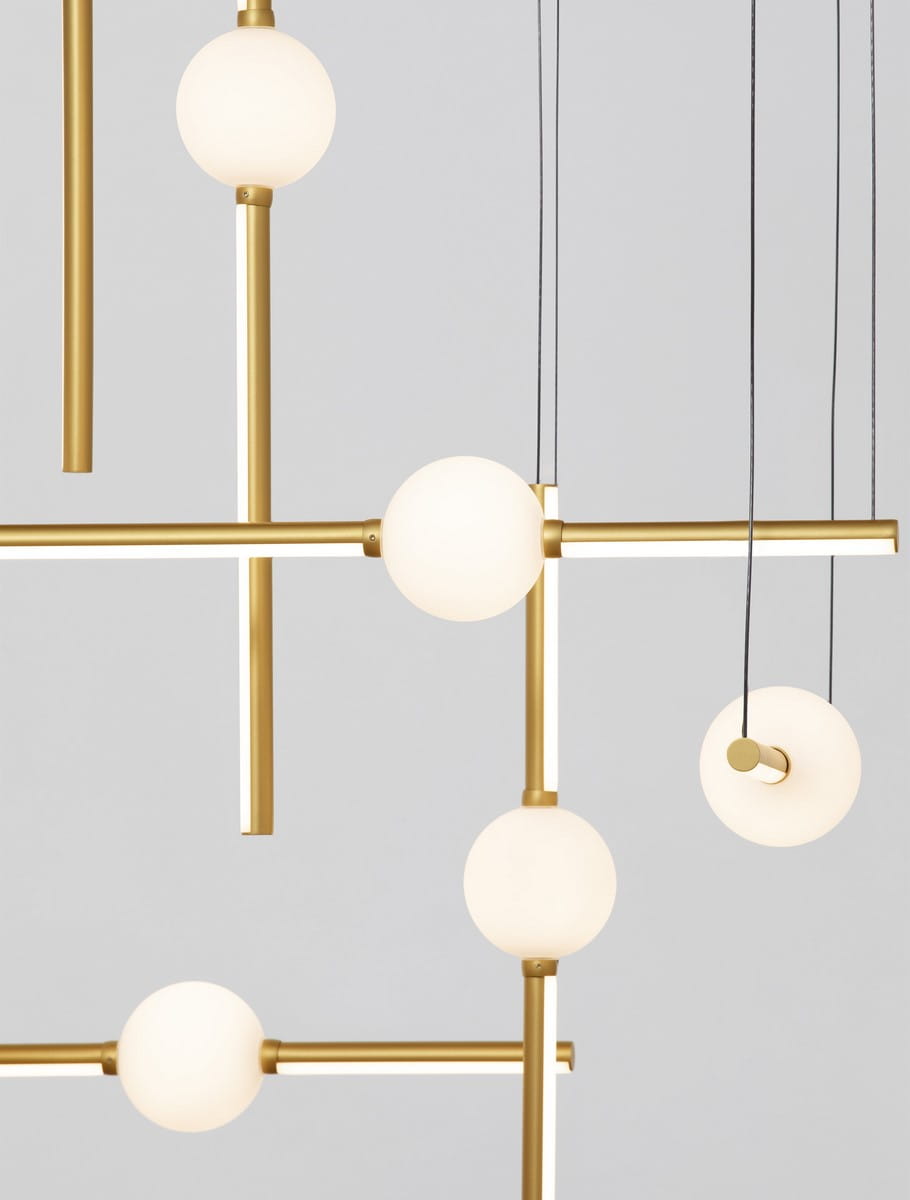 Ozdobne kule umieszczone na kloszach mają biały, mleczny odcień co pięknie komponuje się ze złotą oprawą. Źródło światła LED wbudowane zostało wzdłuż całej długości klosza, dając światło o naturalnej barwie z możliwością ściemniania za pomocą zewnętrznego ściemniacza. Lampa przez swe rozmiary oraz dużą moc idealnie sprawdzi się w większych przestrzeniach, zarówno domowych, jak i komercyjnych.