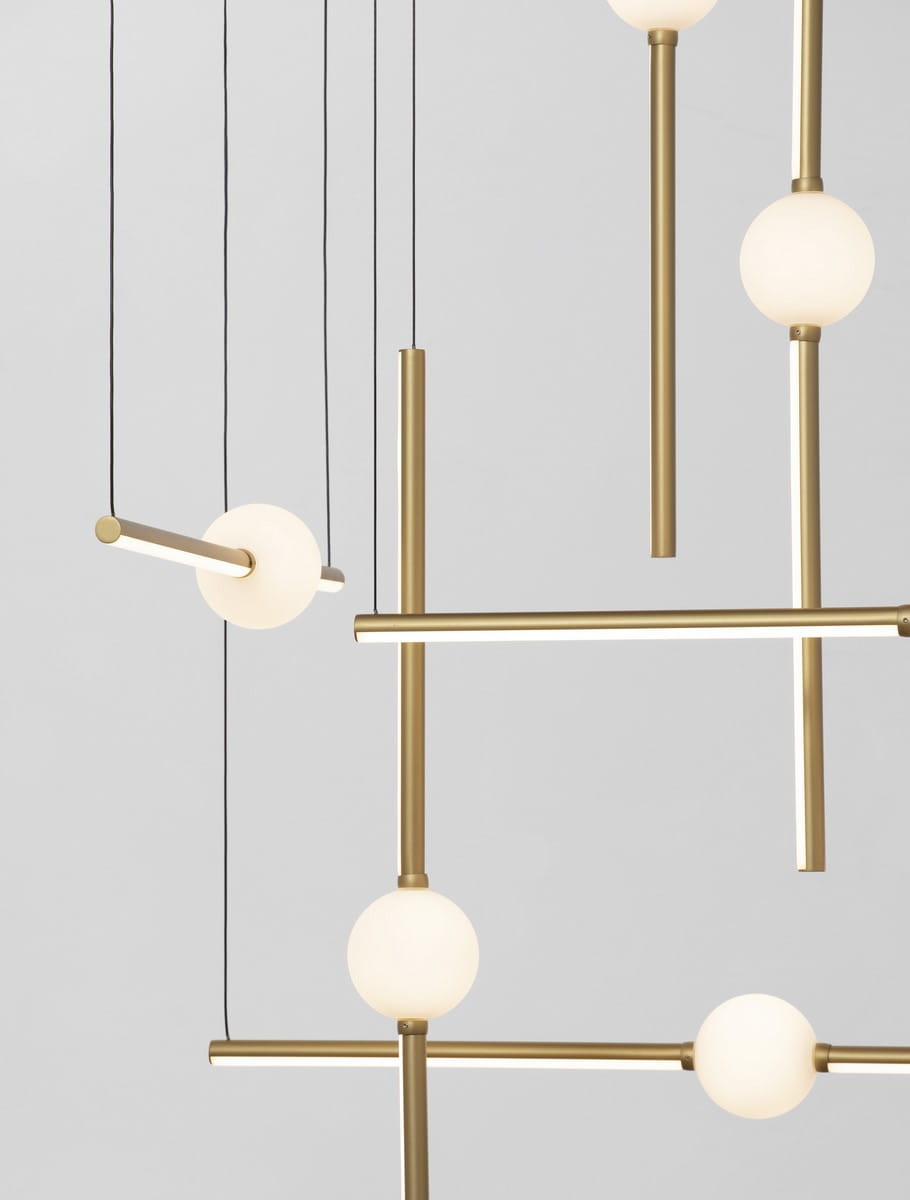 Lampa wykonana została z aluminium i składa się z 8 kloszy, mających formę podłużnych, złotych rur, na których umieszczone zostały ozdobne kule. Kompozycja lampy składa się z naprzemiennie zawieszonych kloszy w orientacji pionowej i poziomej, tworząc geometryczną, przecinającą się konstrukcję. Ciekawa konstrukcja wygląda niczym abstrakcyjna rzeźba zawieszona w powietrzu. Całość podtrzymuje solidna, czarna podsufitka.