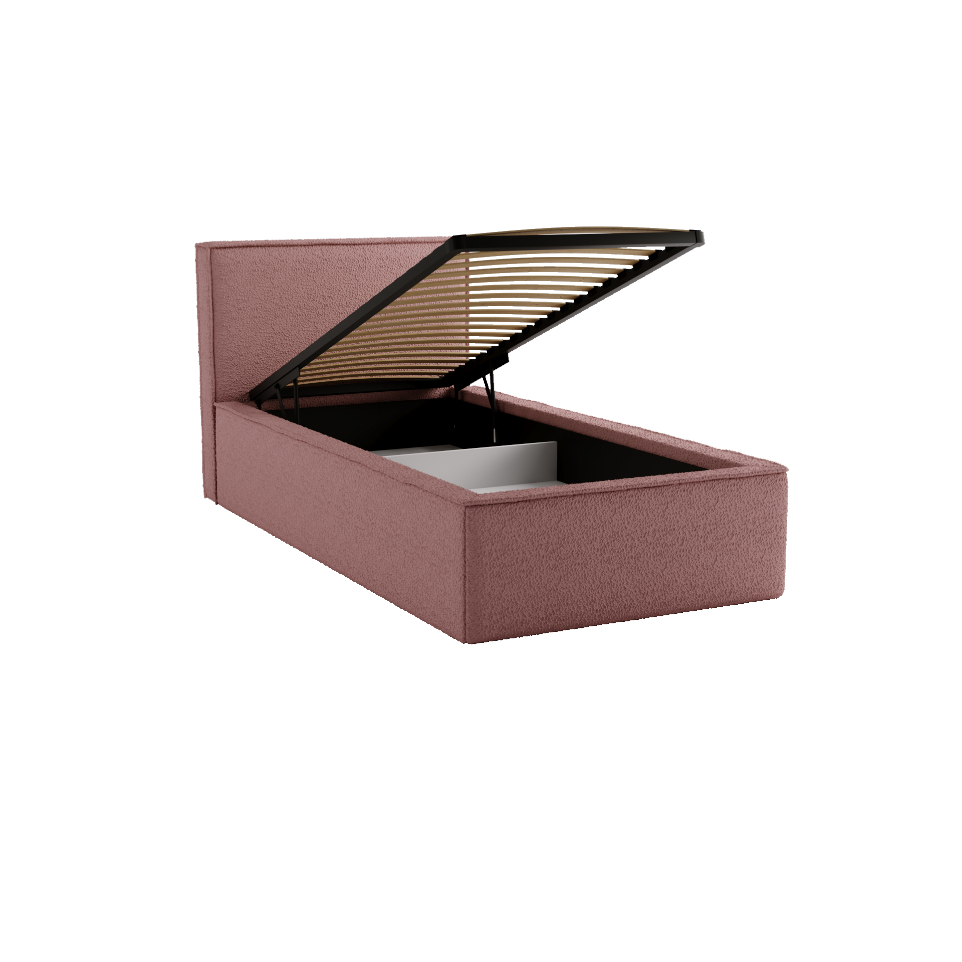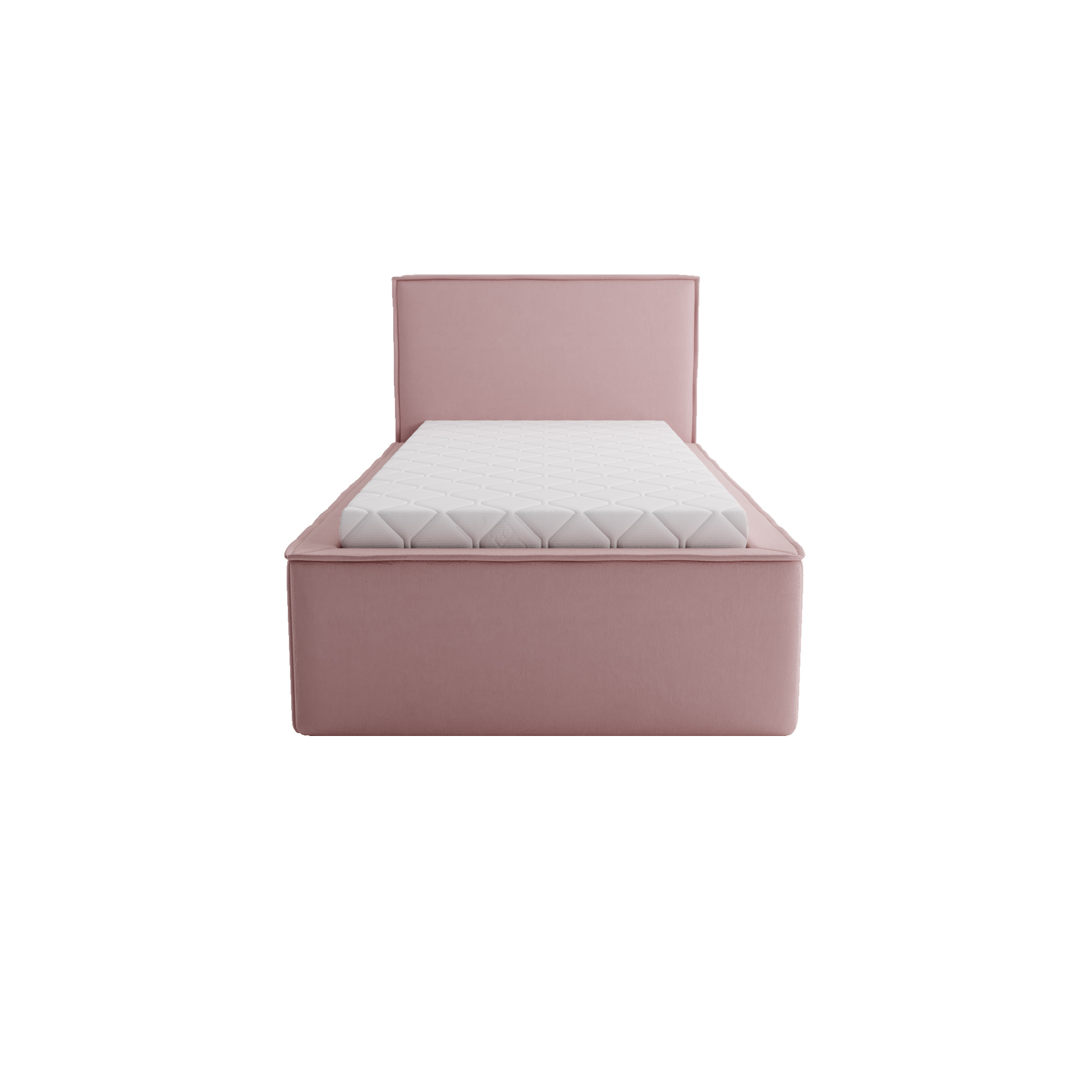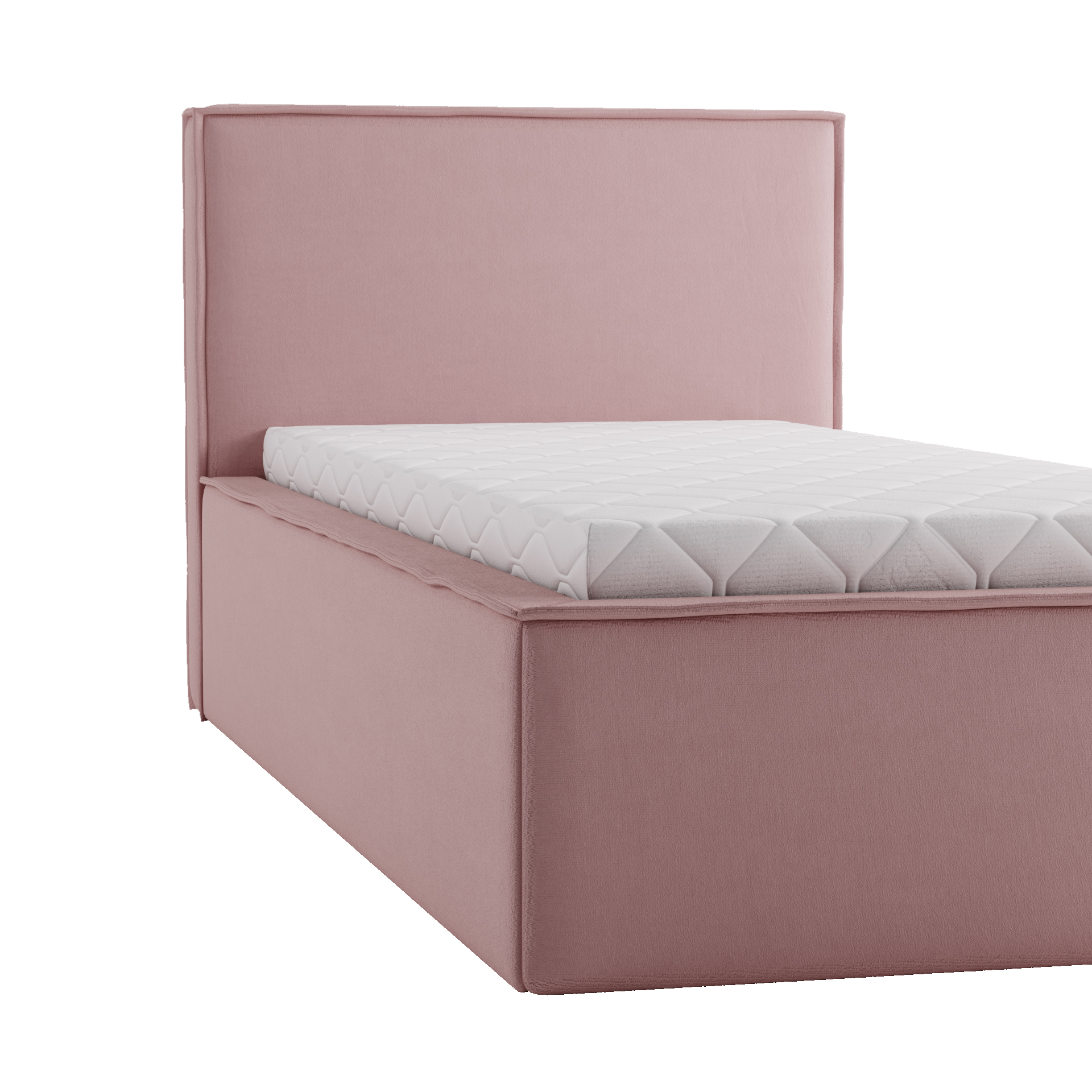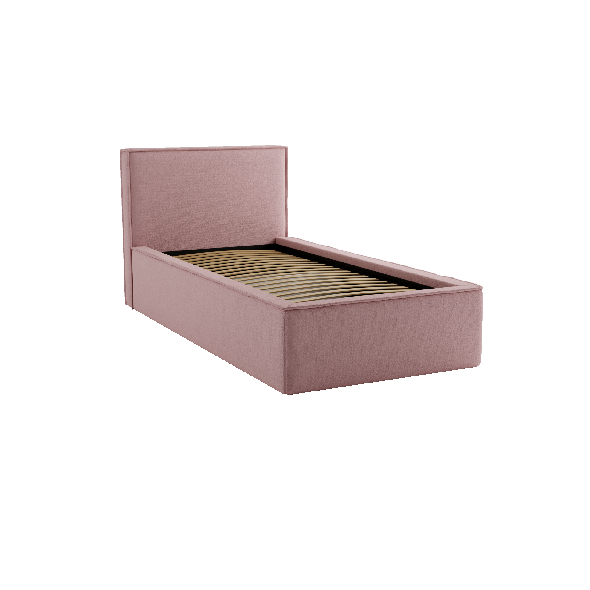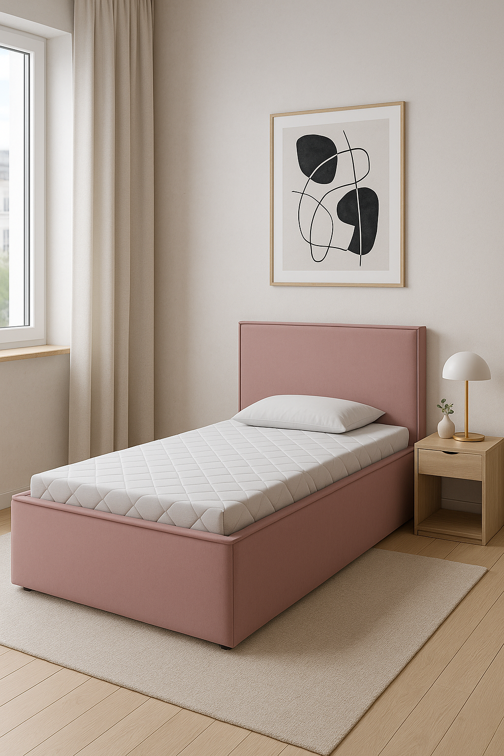 Tapicerowane welurem Bluvel 52 w odcieniu subtelnego różu, łóżko wprowadza do sypialni wyrafinowany charakter i uniwersalność. Tkanina wyróżnia się miękkością i subtelnym połyskiem, a przy tym jest wytrzymała, odporna na ścieranie i mechacenie (Test Martindale: 50 000 cykli). Posiada także certyfikaty Oeko-Tex Standard 100 oraz REACH, co gwarantuje bezpieczeństwo użytkowania w codziennych warunkach.