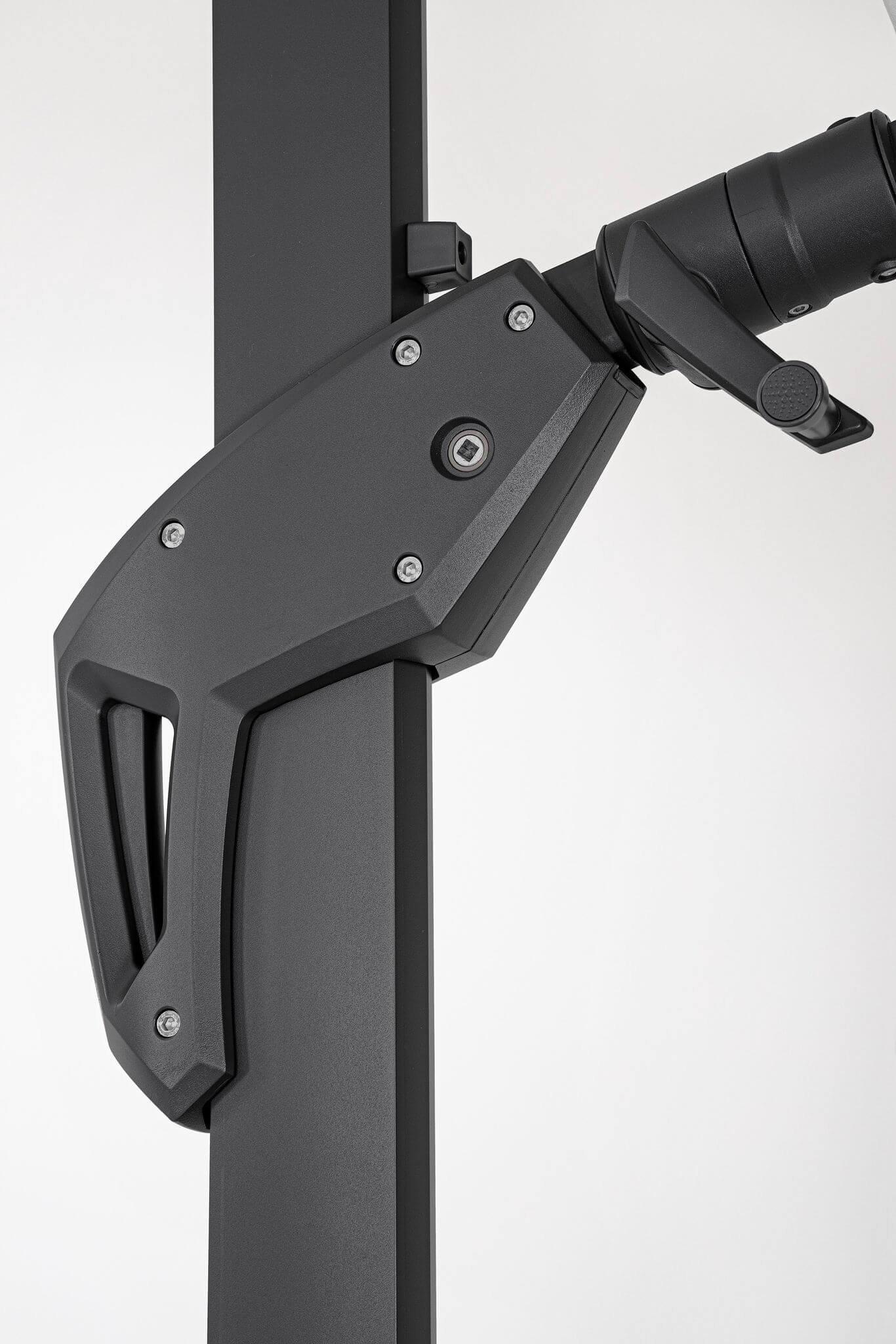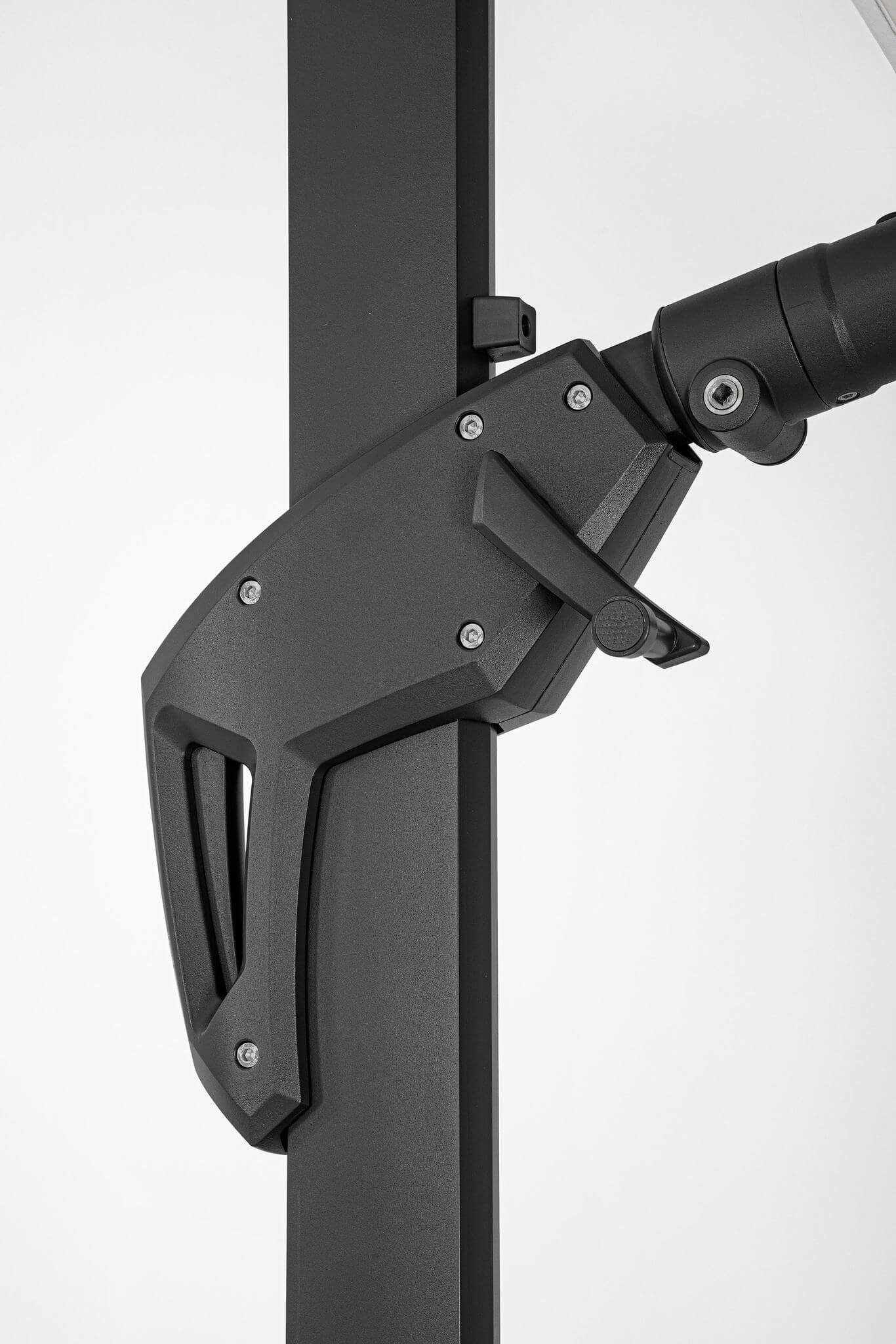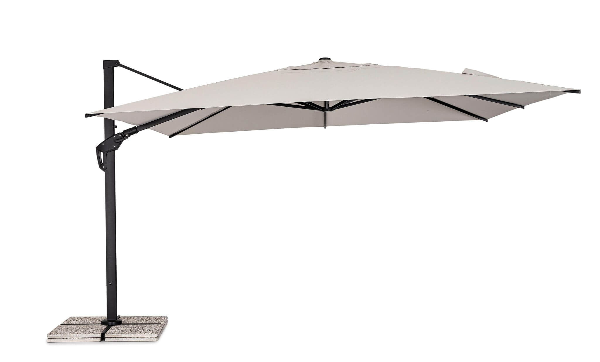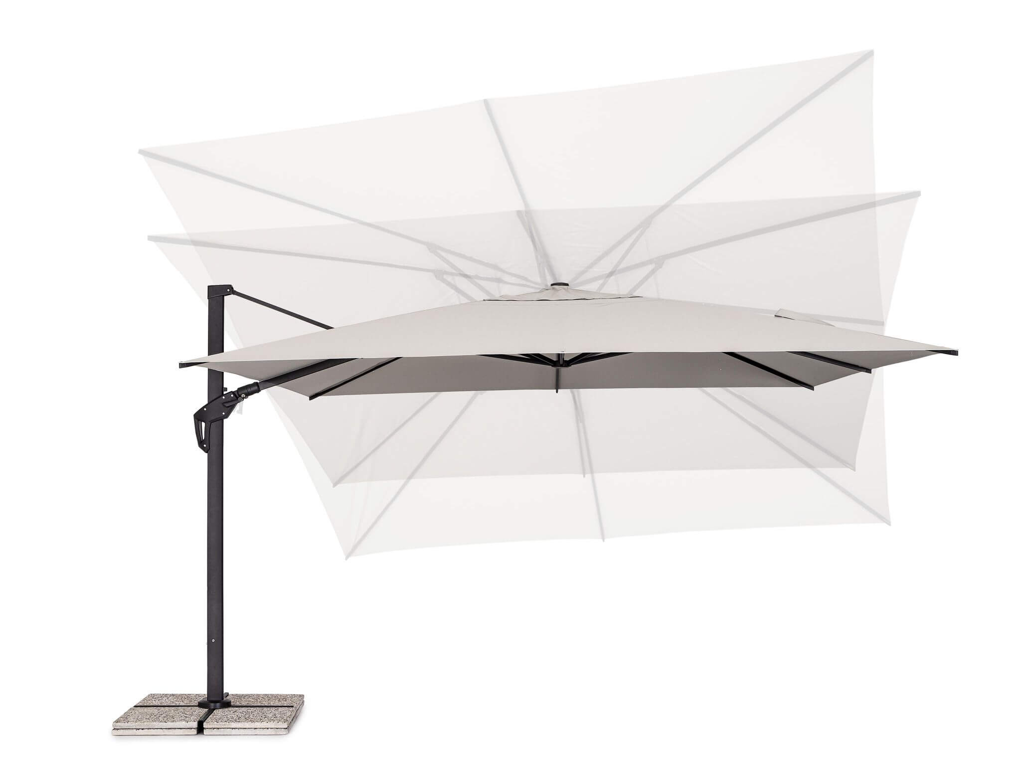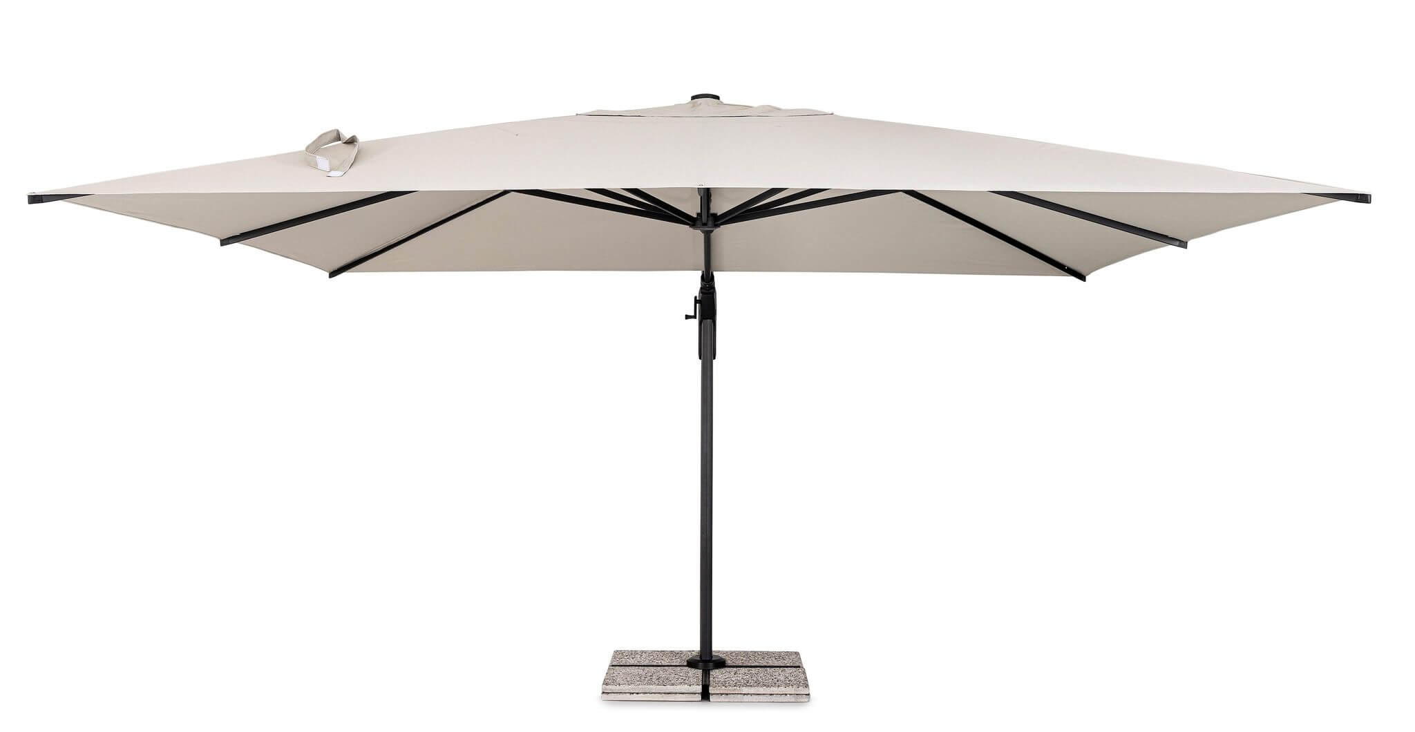 Ten duży, jasny parasol tarasowy wyposażony jest w ręczny drążek obrotowy 360°. Nachylenie w pionie w sześciu pozycjach. System nachylania lewo-prawo.