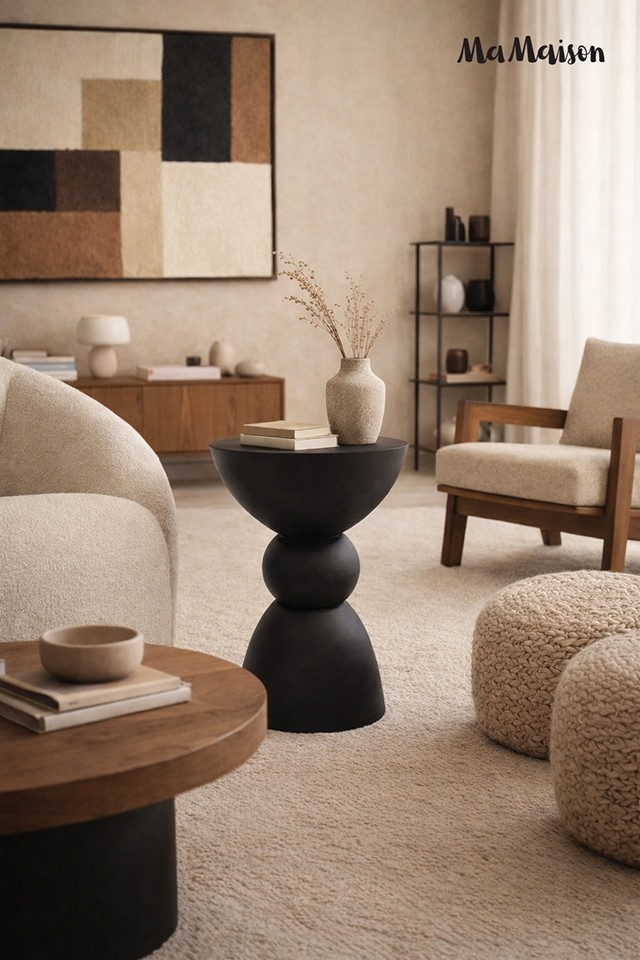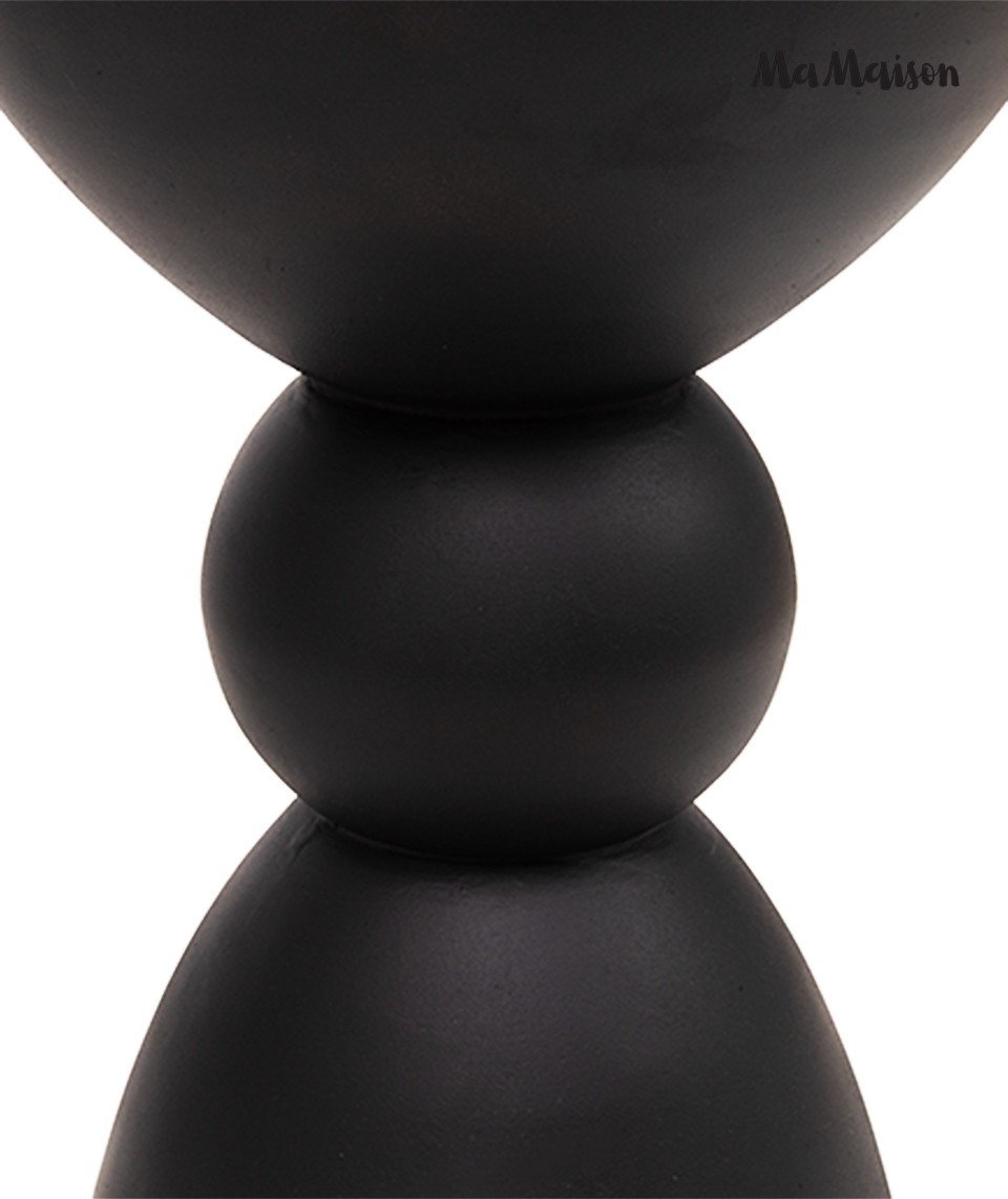 Stolik Tadao 35 od MaMaison to propozycja dla osób poszukujących mebli, które wykraczają poza czystą funkcjonalność, stając się rzeźbiarskim akcentem we wnętrzu. Model ten przyciąga uwagę swoją nieoczywistą, balansującą sylwetką, opartą na zestawieniu trzech wyrazistych brył. Kulista forma osadzona precyzyjnie między stabilną, stożkową podstawą a delikatnie wklęsłym, półokrągłym blatem tworzy kompozycję pełną spokoju i geometrycznej doskonałości. Całość została wykonana z gładkiego MDF-u, którego matowe wykończenie w głębokiej czerni podkreśla nowoczesny rodowód projektu.