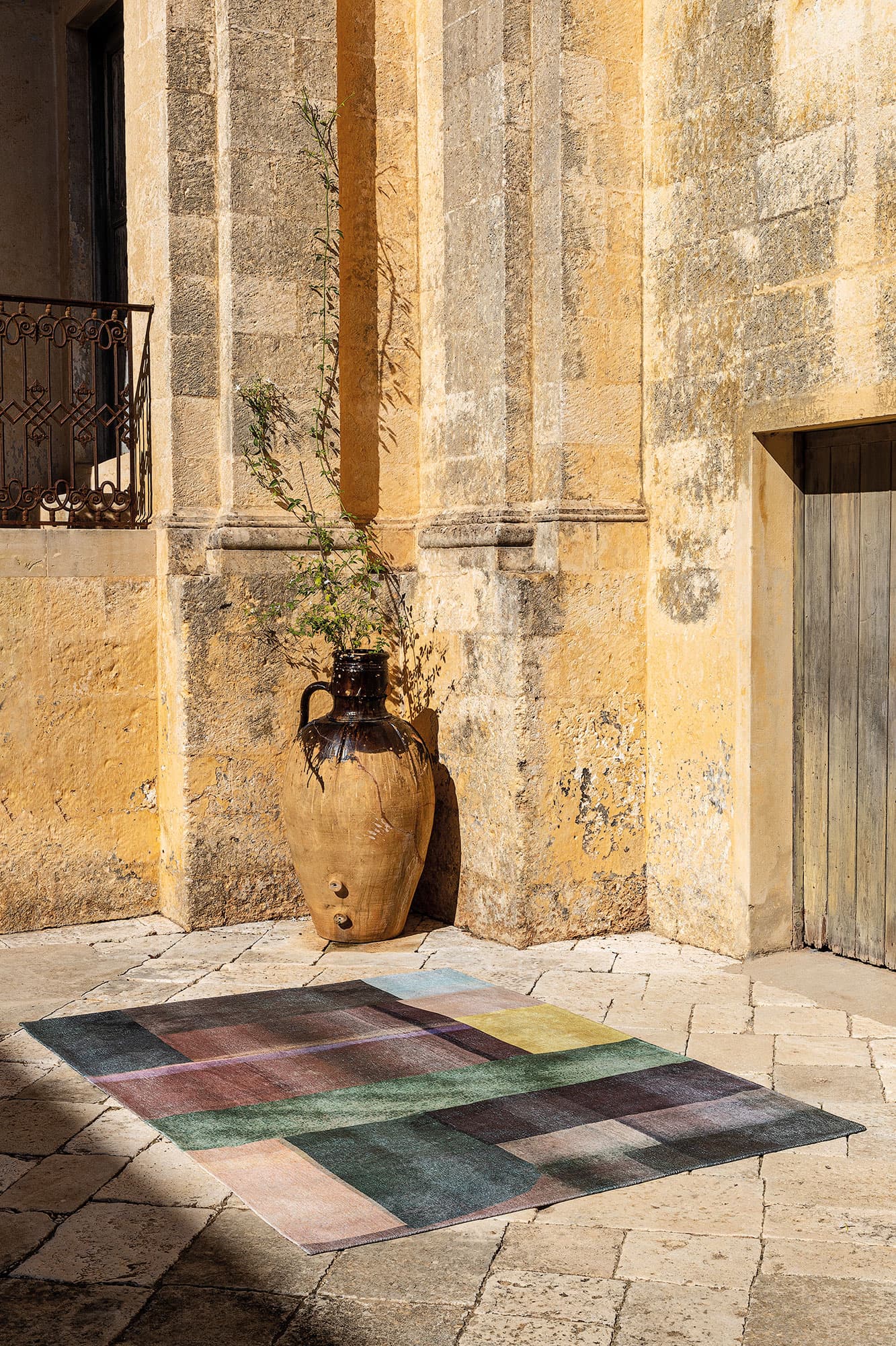 Dywan geometryczny to połączenie intrygującej struktury żakardowego splotu z nadrukiem, co pozwala uzyskać bardzo szczegółowy i pełen detali wzór, zapewniając jednocześnie wytrzymałość oraz większą niż w grubych dywanach odporność na odkształcenia pod ciężarem mebli.